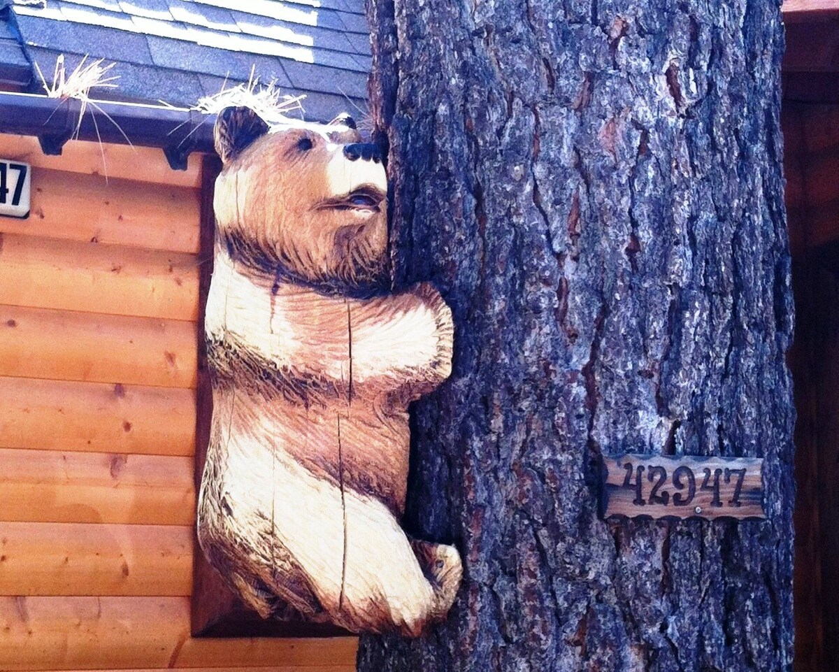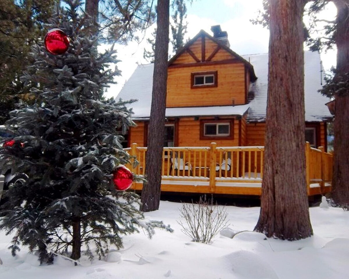 Welcome to 'Bear Hug Hideaway' Li# LC-20210070 'Warm & Cozy' Log Family Cabin, Walking distance to Bear Mountain Pick-Up, the Big Bear Golf Course & Zoo. Close to Village & Big Bear Lake with lots of Level Parking for your Boat in the summertime! After a day on the Slopes, Enjoy Playing Chess on the Game Table in front of the Hugh Picture Window across from the Large Native Rock Wood Burning Fireplace or Relax in the Spa under the Jeffrey Pines. Beautifully Updated Rustic Interior, keeping the Nostalgic Cabin Feel & tasteful Cabin accents throughout. It has a large Cooks Kitchen with dishwasher, Coffee Bar & a Washer & Dryer View Bear Mountain Slopes while BBQ on the Back Deck. The Family will enjoy Playing Pool in the Large Gameroom / Family Room while you cozy up next to one of two Rock Wood Burning Fireplaces. Grandma & Grandpa would love the few steps to the main level bedroom and living quarters to complete the family trip. This Cabin is an Easy Drive with No Hills and Flat Parking for 3 cars. It is perfect for your Boat or Jet Skis parking during the summer . It is perfect for Couples, Families and Singles, as well as the Elderly with just a few steps to enter the Main Level, Bedroom & Bathroom. Features: 2 Flat screen TV's, Cable, DVD Player, Wi-Fi INTERNET, 2 Fireplaces, Family Room and Living Room, Large deck off the back and the front, Bear Mountain Views, Walk to Shuttle, Golf Course, & Hiking. Fully stocked kitchen, Coffee Bar, Linens and Towels provided, Propane Gas BBQ, 3 Car Parking. Pet: 1 low shed pet upon approval and agree to pet policy. 2 blocks from the Big Bear Golf Course and Ski Shuttles, Hiking & Biking trails, 1.5 mile to Big Bear Lake, 2.5 miles to the Village, Nearby shops and restaurants, Sleeping Arrangements: Bedroom 1: 1 Queen Bed (Main Level) Next to Full Bathroom Bedroom 2: 1 Queen Bed and 1 Twin over Full Bunk bed (Upper Level) Bedroom 3: 1 Twin over Full Bunk bed (Upper Level) Game Room: 1 Full Futon Bed (lower level) Keywords: Jacuzzi, Coffee Bar, Fireplace, Woodsey, Gameroom, Bumper Pool Table, Internet, BBQ, Ski Slope View, Golf, Lake, Fishing, Spa, Hot Tub, Ski, Biking, Hiking, Snowboard, Level Parking, Easy Access, RV Parking, Level Access, Log Cabin, Cozy, Out Door Grilling, Chalet, Kid Friendly, DVD, Foosball, Walk to Slopes Our prices include all fees. No hidden fees.
