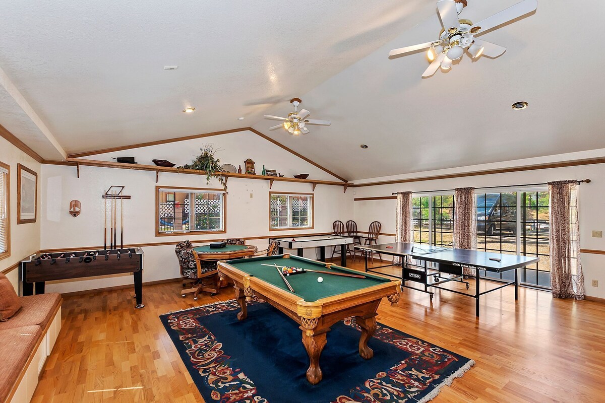 Game Room: Have a blast in the expansive game room featuring a pool table, ping pong table, air hockey, poker table, and Foosball table. Complete with a fireplace and TV for added enjoyment.