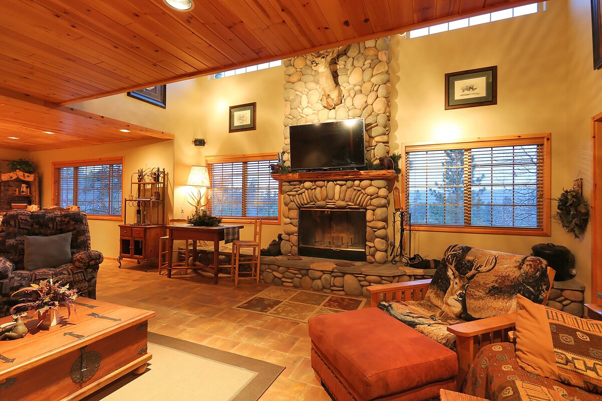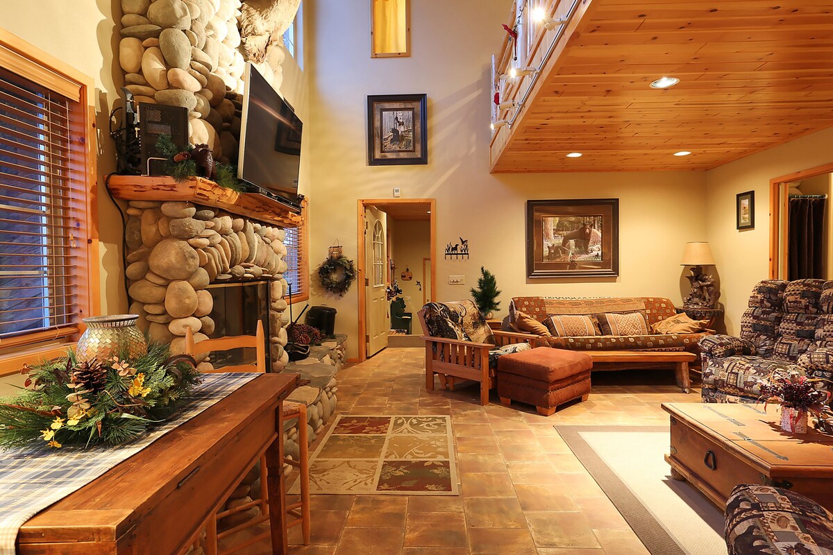 Ski to the slopes from this beautifully decorated, secluded, 2,200 sq. ft., 3 Bedroom, 3 Bath, two story home that backs right up to Snow Summit Ski Resort, surrounded by National Forest, providing access to the hiking trails right from the back yard. Enjoy the beautiful mountain views while soaking in the hot tub from the main deck, play a game of pool with your friends & family in the upper loft, sit in the indoor sauna after a fun day on the slopes or enjoy the peace & tranquility of nature from one of the outdoor decks. This vacation home has all the modern conveniences and amenities a home could offer and is perfectly comfortable and spacious enough for the whole family. With the living quarters on the entry level offering a wide-open living room, spacious kitchen with bar counter, dining area with a beautiful dining table to seat 8 guests and a full bathroom. On the upper level, you will find the loft game room with a pool table, mini bar, deck & vaulted ceilings with views of the mountains. The Master Bedroom offers a fireplace, sliding door to deck with a view of the lake, TV, full log queen bed and private bath with a sauna/shower combo. The 2nd Bedroom has a queen bed & TV, the 3rd Bedroom has 2 full beds, TV and sliding door to deck, also with a lake view, both of which share a full-size Bathroom. The Kitchen is fully equipped with a pantry, the Living Room has a large flat screen TV w/Blu-ray player, floor-to-ceiling river rock fireplace, Queen sofa sleeper, Queen futon bed, with expansive windows, vaulted ceilings and tile floors throughout. There is another bathroom with a shower on the entry level. The outdoor hot-tub is secluded on the main deck with a patio table, propane BBQ and forested views. The back of the property is fully fenced with gated access to the trails, which will take you right to the ski slopes, with an additional lot to the side, perfect for sledding. This secluded mountain home also has an attached garage for one car, large fenced backyard, 3 enclosed decks, propane BBQ, WiFi, BluRay, free Netflix, washer/dryer, parking for 5 cars, (very sloped driveway) pet friendly, accommodates 12 guests. Free Netflix & Hulu! Please note: the driveway is very steep. Fresh Linens and Towels are provided for your stay and the home will be professionally cleaned before your arrival. Our prices include all fees. No hidden fees.