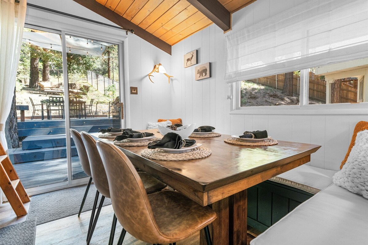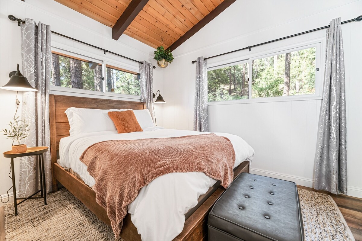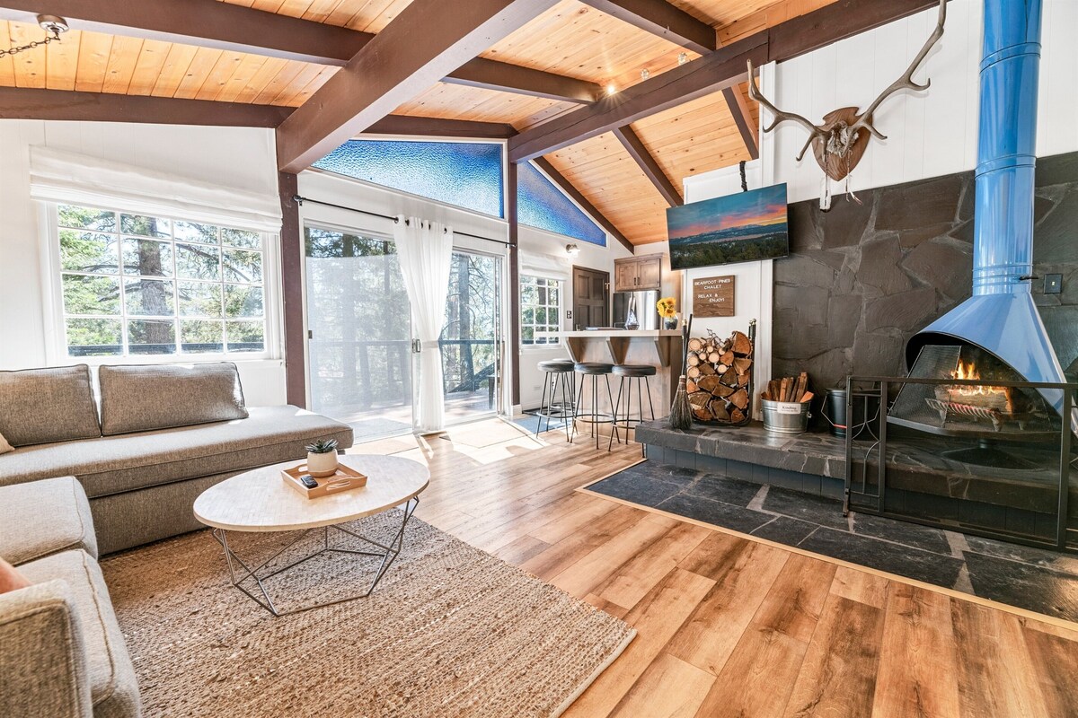 Breathe in the fresh mountain air and enjoy the view of Bear Mountain Ski Resort slopes while enjoying your morning coffee outside on the deck among the pines, or inside the cabin curled up next to the baby blue Swedish fireplace! Antler Inn offers a flexible floor plan and is perfectly located in Big Bear Lake's Moonridge neighborhood, and is just a short 5 minute walk to the zoo and shuttle for Bear Mountain Ski Resort, Snow Summit Ski Resort, and the Big Bear Lake Village. The instant that you make your way up the stairs from the driveway and turn around, you will immediately understand the steepness of the driveway. You'll find yourself transported to a serene mountain cabin. Take a moment or hour to just sit in the chairs on the far side of the deck and enjoy the beautiful view of the ski slopes to your left. Once ready, the rustic wood grain deck invites you to enjoy the cabin inside. Kitchen: Upon entering the cabin, notice the fully renovated kitchen, complete with quartz countertops, touch activated appliances, and mindful vintage touches throughout. Whether cooking a daily meal or a holiday feast, the kitchen is well appointed with a refrigerator, gas appliances, dishwasher and smaller appliances such as a microwave, toaster, hand mixer, crockpot, and coffee pot. There is even dishware for dining alfresco among the pines under the bistro lights! The cabin is stocked with the staples: coffee, tea, sugar, sugar alternatives, and cream at the counter coffee station and you'll find spices in the cabinet and condiments in the fridge. Whether for cooking or simply just chatting, a bar height counter with stools is perfectly situated between the kitchen and the living room so you will always be a part of the conversation. An Alexa show device lives above the cabinets for on demand music and can also be used to help with timers while cooking, or any other random information you need a third party to weigh in on. Living Room: Walking into the living room during daylight, you'll notice how the large windows illuminate the cabin fending off the need for electricity. Under the gorgeous pine ceiling and wood beams lies a large sectional couch with a chaise lounge (opens to a queen sized memory foam sofa sleeper) that is situated perfectly to stare out into the pines or enjoy a fire on a cool evening. After a long day of exploring Big Bear Lake, there is no better feeling than bundled up in a blanket on the couch listening to the crackling fire from the baby blue Swedish fireplace. The first bundle of firewood is included and pairs well with your family's favorite movie on the 42\ ll head toward a bedroom and one of the bathrooms. The master bedroom has a queen sized bed with a cooling gel mattress that is part memory foam, part coil, offering an option that is satisfying for those who appreciate a mattress on the firmer side, yet not so much that it is uncomfortable for those of us that appreciate a pillow top. Nightstands border the bed and dimmable sconce lights are mounted just above the nightstands on each side of the bed to make it easy to catch up on that favorite book just before bedtime. Silver branch curtains provide privacy, yet allow one to wake-up feeling like you backpacked in the mountains with the views of the pines! Prefer to sleep in and avoid the sunrise glow, close the blackout curtains and you ll find a built-in armoire (which stores a fan and high chair) and a sink! Who knew how handy a sink in the bedroom could be, but trust me, you ll find a full bathroom with a full sized shower/tub combination. The showerhead has been extended to create a comfortable experience no matter how tall you are! There are plenty of hooks to keep everyone Bedroom\ t any neighbors directly behind us, allowing you to fully immerse yourself in the mountain life and truly relax! The sprawling three-tier deck is perfect for morning yoga, grilling out among the pines, or just relaxing after a long day around the large table! The deck boasts an outdoor dining table that seats 7, a Weber grill, and a built-in bench, which is perfectly situated to chat with the grill master. When warm enough, we encourage you to opt for dinner alfresco under the blanket of stars and the beautiful bistro lights. Sun sails have been added to keep the sun a bay for an enjoyable experience anytime of the day, and year! Downstairs Bedroom/Game Room: Head back inside and down the recently updated spiral staircase (we re-built this by hand - think of layers of long puzzle pieces) to the second bedroom or what I like to think of as the land of opportunity! You may have noticed the second front door as you walked up the stairs. When snowing, I encourage you to enter through this door to avoid using those slippery steps. You s important to be mindful. You Our families first Christmas in Big Bear. Staying in this amazing cabin made it such a great experience! Tasha was a great host and her quick responses to help when we needed anything made us feel right at home . I would highly recommend this wonderful updated cabin if you’re ever coming to Big Bear Lake . All the amenities you’ll need and lots of sleeping space!” \ We’ve stayed in a lot of Big Bear cabins over the years Our prices include all fees. No hidden fees.