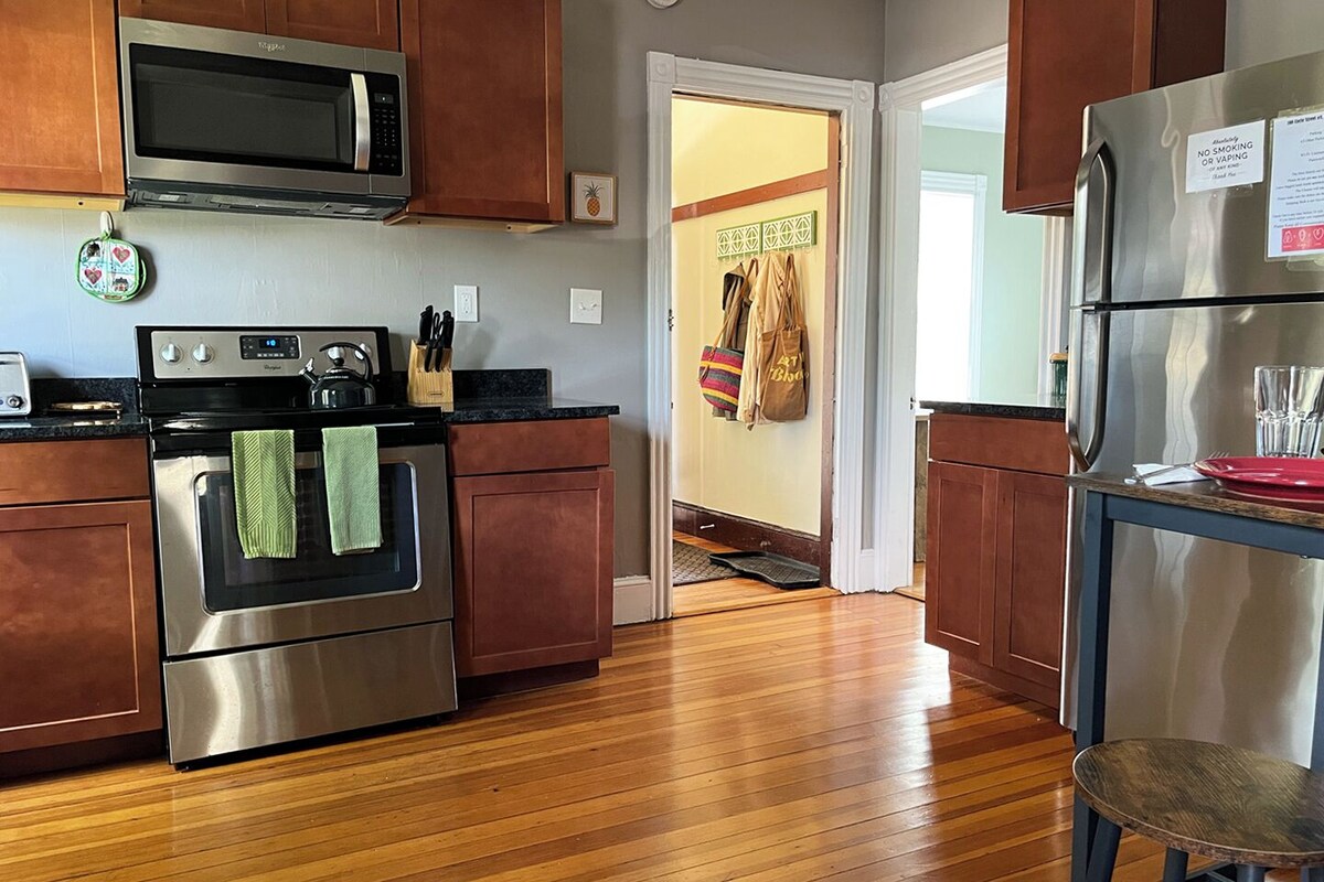 Spacious Cozy 4 bedroom, 1.5 bath Back Cove 1st floor condo in a lovely Portland neighborhood. Great for groups and families! Centrally located just off Forest Ave, near Woodfords Corner, Back Cove, and the University of Southern Maine. Walk to cute local eateries and The Great Lost Bear! Back Cove Trail just a 3 min walk down the street to see the ocean! 5 min drive to Old Port, or catch the #2 Bus to downtown (every hour). • Sleeps 12! Larger groups inquire about renting the 2nd floor unit in this building as well. • Off street Parking for 2 cars. Easy, free street parking as well. • Smart lock self check-in - Queen beds in each bedroom (2 queens in the largest bedroom). Queen pull out couch in the living room. - High-Speed Internet and Smart TV - Fully equipped kitchen - A/C window units - Designated Outdoor Grill & Picnic Tables - Relaxing Outdoor Porch - Beach Chairs & Insulated Coolers available for use. Guests have access to the First Floor Condo and will be given a unique code to enter and exit through the front door or back door at their pleasure. Please Note: The exterior home entrances are monitored by security cameras for your safety. There is NO SMOKING or vaping of any kind. Designated smoking area outside. Registration number Permit # 001321-2019 Our prices include all fees. No hidden fees.