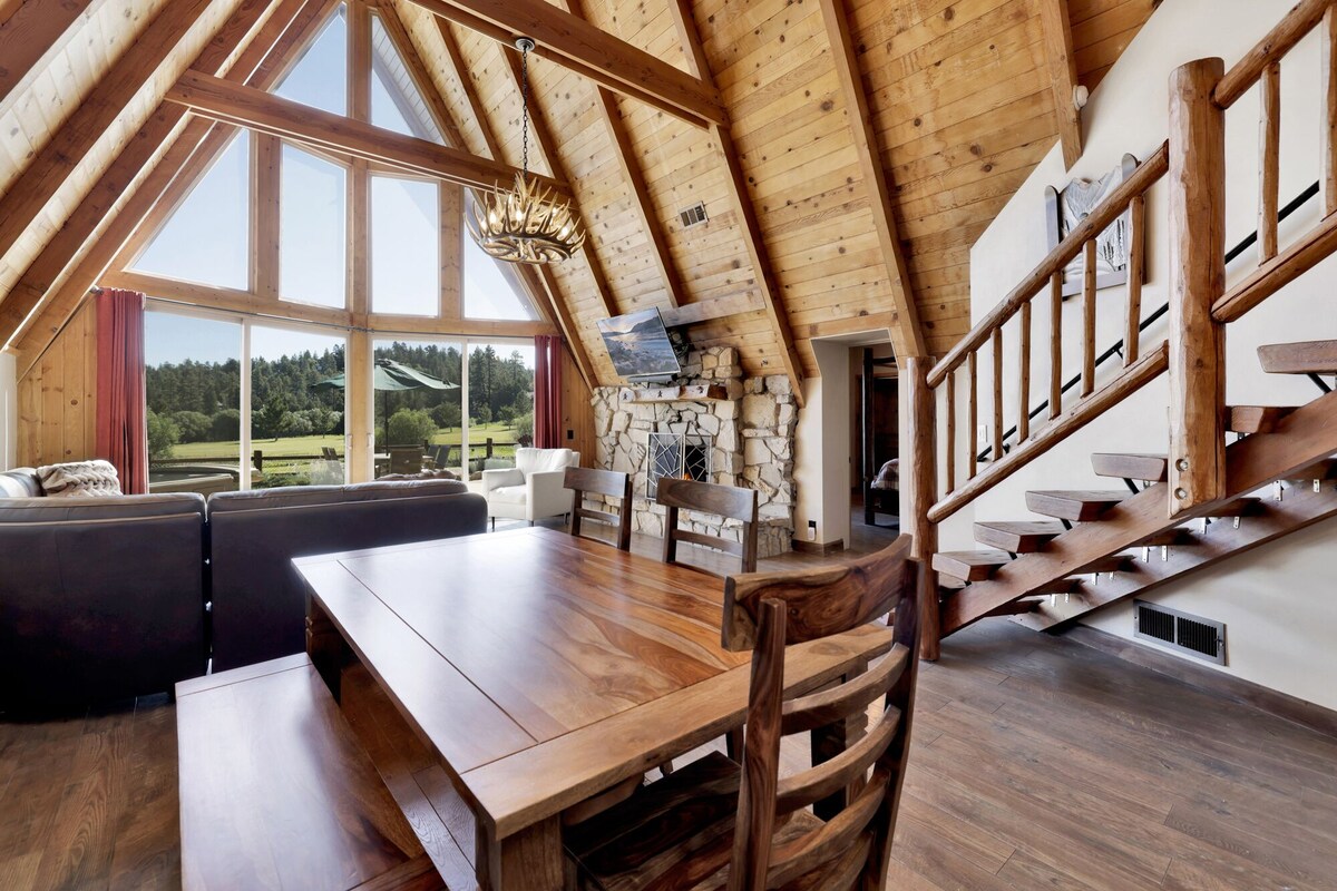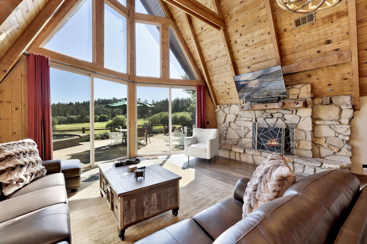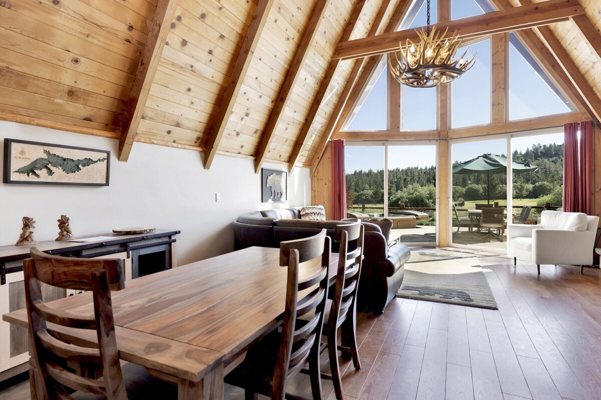 Big Bear Den | Golf Course Resort Location w/ Hot Tub & Firepit Perfect for a family vacation, group of friends, or even a corporate retreat our Big Bear Den is the ultimate vacation home to properly immerse your group in everything that an alpine vacation to the mountains should include! Located right on Bear Mountain's world-class 9-hole golf course you can schedule tee-time right from your backyard or grab a cart for the driving range nearby, take a short walk up to the ski lifts in the winter, or enjoy the newly renovated Alpine Zoo year round!! Boasting fine amenities paired with the comforts from home you will have everything you need for a memorable and relaxing vacation right on site! Enter your beautiful chalet on the lower level where you are greeted with gorgeous knotty pine beam vaulted ceilings combined with massive floor to ceiling windows that let in the perfect balance of natural lighting and amazing views. Hardwood floors and cozy rugs are available throughout your chalet adding to the mountain vibes the moment you enter your home. You will love snuggling up on the cozy couches and warming your toes in front of the toasty faux log gas fireplace as you pop on a movie on the mounted flat screen Streaming TV with complimentary hi speed WIFI internet provided by the owners for your enjoyment. (Guests must have their own accounts to enjoy Streaming Services.) The open floor plan is perfect for entertaining a dinner party or hosting your next family holiday as you flow seamlessly from the living room to the comfortable dining area and equipped kitchen, you will love staying connected as you prepare your snacks together. The custom log dining table is stunning and pairs with the breakfast bar stools to offers a great space to sit and enjoy your meals together as a group comfortably while taking in the great views and watching the snow falling outside. The chef of your party will absolutely love the kitchen here at Big Bear Den- complete with granite counter spaces, oak cabinets stocked with cookware and utensils for your use, and stainless appliances including a dishwasher for your added convenience during meal cleanup. This lower entry level boasts a beautiful hallway full bath for guests ordained in custom tile work and unique features along with a separate laundry room area that offers a washer and dryer for those wet snow clothes or extended visits to the mountains. The entertainment and bunk room here is perfect for the kids with built in bunks, an oversized sleeper sofa, and a massive 65'' Streaming TV and gaming consoles to keep the group entertained. This lower entry level is also home to your spacious primary suite which offers it's own private bath and amazing greenery views from the big window. Venture upstairs to find your other two sleeping quarters including the spacious open loft bedroom overlooking the living room as well as an added guest bathroom for your convenience, all of your rooms are made up for your group with warm linens, blankets, pillows, and fresh shower towels when you arrive for your vacation. Venture outside where you will find the most amazing property for your group to enjoy- a private and fully fenced backyard area offers a massive patio with built in bar for your adult beverages as well as a natural gas BBQ for you to grill up your freshly caught dinner from the lake. Unwind around the toasty outdoor fire pit in the evenings or you can soak up your fun day of adventures out on the mountain in your own private hot tub under a million stars right off of the awesome sun deck- the possibilities truly are endless here! Big Bear Den is a one-of-a-kind spectacular vacation home that has been meticulously furnished with your vacation stay in mind and boasts a prime central location no matter the season you choose to visit- make this your next home away from home today! Sleeping Arrangements: Bedroom 1: King Bed- Streaming TV, Private Full Bath- Downstairs Entry Level Bedroom 2: Two Twin/Twin Bunk Sets + Queen Sleeper Sofa- 65\ ,