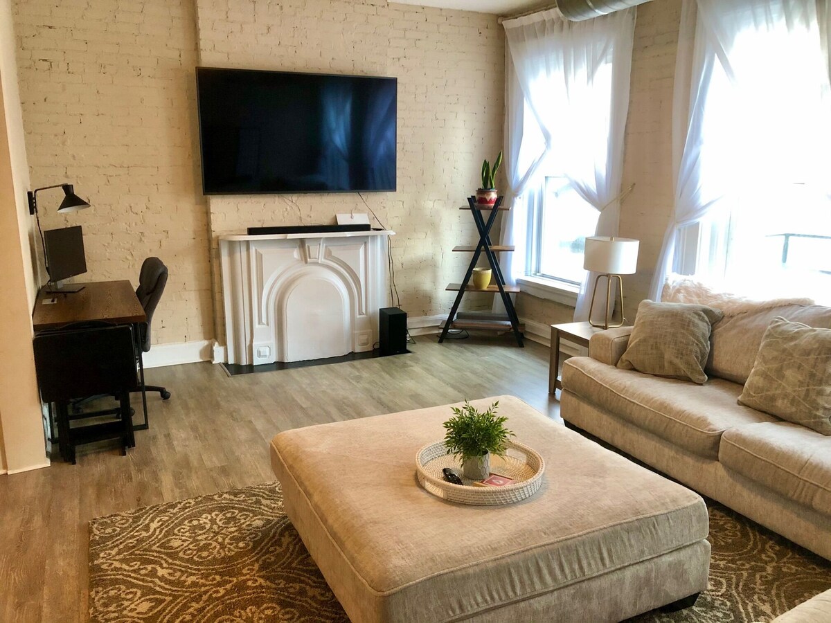 Light and airy, top floor condo in the heart of it all. Located directly on the Cincinnati streetcar circuit, just a half block from the Aronoff Center, or a short walk to all the entertainment in Over the Rhine, Fountain Square, and Downtown. Newly furnished, main living space features a huge comfy sectional with oversized ottoman, 75\