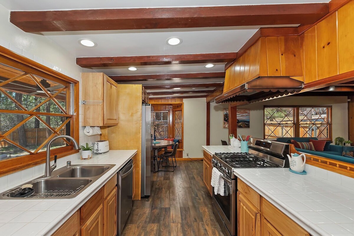 ✓ Fully Equipped Kitchen: Outfitted with modern stainless steel appliances, including a gas range, oven, refrigerator, microwave, toaster, dishwasher, and standard coffee pot.