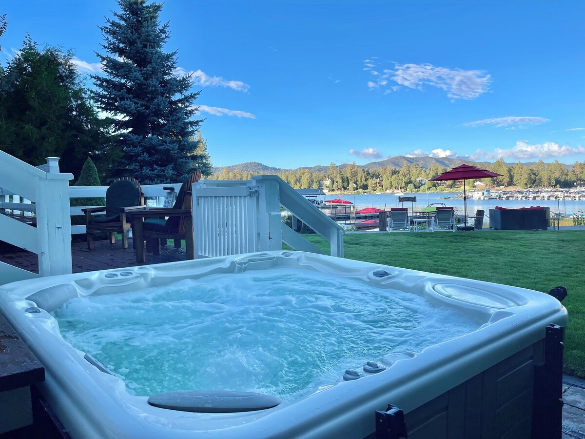 Experience the serenity of Big Bear Lake at our beautiful waterfront home with gorgeous views of Metcalf Bay. Our two-story 4 bedroom/3 bathroom lake view and mountain view home has spacious wrap-around decks, outdoor jacuzzi, BBQ, fireplace, two large family rooms, and all the modern amenities you'll need for your perfect family vacation, fishing expedition, or well-deserved getaway. Whether you're boating on the lake, soaking up the sun on multiple decks, or cozying up next to the fireplace during an unforgettable ski retreat in a magical winter wonderland, it is lakeside living at its best. Skiing, snowboarding, snowshoeing, or tubing in the wintertime, or boating, kayaking, paddle boarding, water skiing, horseback riding, hiking, golfing or mountain biking during the warmer months. We even have a private dock so you can bring your own pontoon, kayaks or jet skis and launch them directly from our private boat slip. It's the most picturesque setting to create lifelong memories in a nature lover's paradise. LIVING AREAS This lakefront home has a wonderful wrap-around deck providing amazing views of the lake, mountains & marina. Nestled on a 12,300 sq ft lot and boasting 75 ft of lake frontage, enjoy star-filled night skies from the hot tub, the expanse of lush grass & trees and the dock deck at water's edge. The house is nearly 2800 square feet with two spacious living rooms that are perfect for a large family to spend time together while having enough space to find comfort and relaxation. The main living space downstairs has tongue and groove ceilings with exposed beams, wide plank wood flooring, and comfortable furnishings, including a sectional sofa with queen-size sofa bed, two cozy armchairs, a Sony TV with Roku, a Bose speaker with Bluetooth connectivity, and an artful stone wood-burning fireplace. The upstairs family/game room has a brand new pool table/ping pong table, giant Jenga, TV, two cozy couches, a long sleeping nook with built-in bunks and three futon mattresses under sloped ceilings for reading or resting, thick carpeting for lounging and games, and a portable Harman Kardon speaker that you can connect to your phone to enjoy your own playlist. Inside the drawers, you can find extra bedding for the sleeping nook and sofa bed, as well as a variety of card and board games. A sliding patio door gives you access to a large outdoor mountainside deck. KITCHEN & DINING ROOM If the kitchen is your Happy Place, get ready to smile. Boasting lake views, this large, well-equipped kitchen has expansive granite counter tops, exquisite alder cabinets, and stainless steel appliances, including a Viking stove, double oven, wine fridge, dishwasher, refrigerator and microwave. Four bar stools at the granite bar are perfect for family and friends to hang out and visit while cooking up the perfect meal. The dining area has a fantastic view of the lake and mountains and Pleasure Point Marina. The dining table seats eight people comfortably for a nice family meal, and there is plenty of outdoor seating, along with four additional folding chairs and a card table. Just outside the dining area through the sliding door and onto the deck is a Weber BBQ grill. The gas line is directly connected to the gas line of the house, so there is no need for propane tanks – just fire up the grill and go! There is also plenty of outdoor seating available during warmer months. The fully-equipped kitchen includes a coffee maker, toaster, blender, rice cooker, non-stick T-fal cooking ware, cutting boards, cutlery and utensils, dinnerware, serving ware, coasters, trivets, glassware, and non-BPA plastic drink ware to enjoy wine or cocktails on the outside deck. Starter essentials, such as dish detergent, dishwashing tablets, soap, and paper towels will be provided. BEDROOMS & BATHROOMS Four comfortable bedrooms with comfy modern bedding can sleep 2 adults per room, and there is an extra queen-size pull-out bed in the living room for 2 more, for a maximum of 10 adults. In addition, there is a fun sleeping nook available in the upstairs family room where kids can relax or sleep. Total maximum occupancy is 13, including all infants and children under the age of 18. ~ Garden View Primary King Suite: King Bed, Inviting Bay Window Nook with grass and lake view, TV w/ Roku, and Ensuite Bathroom with luxury soaker tub, separate granite shower with seated bench, granite countertop with dual sinks - Downstairs/Entry Level ~ Lakeview King Room: California King Bed, patio door access to semi-private spacious upper deck with premium lake views - Upstairs/2nd Level ~ Lakeview Queen Sky Room: Queen Bed with oversized bedding, Slipper Chair, patio door access to semi-private spacious upper deck with premium lake views and sky views where you can gaze at the stars as you fall asleep - Upstairs/2nd Level ~ Cozy Queen Bedroom: Queen Bed with comfy, oversized bedding - this room was nicknamed \ by our guests! - Downstairs/Entry Level ~ In addition to the Ensuite Bathroom, there is a Full Bathroom with Shower, both Upstairs and Downstairs, for a total of 3 Bathrooms. All bathrooms have starting essentials provided, including bath towels, toilet paper, shampoo, conditioner, soap, and hairdryers. PRIVATE PARKING / PRIVATE DOCK There is ample parking in the driveway to park a MAXIMUM of four vehicles, and you can bring your own pontoon, wakeboard boat, jet skis or kayaks and launch them directly from our private boat slip. So come enjoy your home away from home at our Home Sweet Lake Home, and discover the magic of Big Bear Lake. NEIGHBORHOOD / LOCATION Home Sweet Lake Home is located in a quiet, tranquil neighborhood where you can have a leisurely stroll while taking in the fresh mountain air as you catch up with family and friends. You can also enjoy the serene views of the lake and mountains while lounging in one of the many cozy areas on the expansive outdoor deck, playing corn hole on the grassy lawn, fishing off the private dock fo