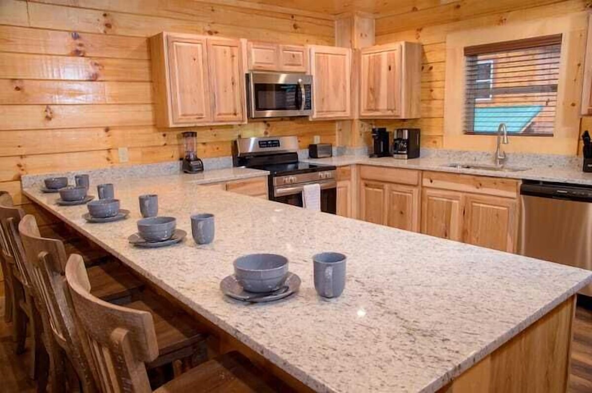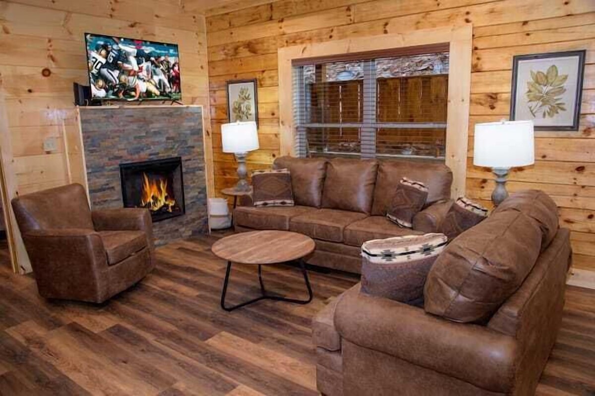 LARGE SPACIOUS 3 FLOOR WOODEN CABIN -1 MILE to downtown strip -5bd/5bh (each room w/private bathroom) -3 floors -2772 sq ft (large size cabin) -4 king bd/1 qn bunk/1 pullout -free parking (fit 6 vehicles) -Roku TVs -pool table -hottub -free wifi -stocked kitchen -Keurig and regular coffee machine -theater area w/big tv -charcoal park BBQ -electric fireplace in living room -NO STEEP ROADS, very easy drive, no need for 4 wheel drive - Pets allowed with fee The space Main Level - 1st floor (bottom most level that is direct street access without steps that is great for easy access for elderly) - kitchen - king bedroom - living room - dining room - hot tub on back deck Middle Level (2nd level/floor stairs/steps required to go up to this 2nd floor) - 2 King bedrooms - theater area Upper Level (3rd floor, steps/stairs required to go up to this level) - king bedroom - queen bunk bedroom - pool table Guest access The entire cabin is for our guest of reservation and is private, none of the cabin is shared with other guests. Other things to note We provide starter supplies for our guests: 1 single use shampoo and bar of soap per bathroom, 1 sponge, 2 dishwasher tablets, 1 laundry detergent packet, 1 roll of paper towels, 1 small liquid dish soap, and 2 rolls of toilet paper per bathroom, 2 trash bags for kitchen trash can, 1 trash bag per trash can located outside in the bear cage (total of 3 trash cans outside) All other cabin supplies will need to be provided by the guests i.e. charcoal, etc. - guests must notify of brining PETS to the listing, having pets and not notifying/paying for the pet fee is considered a broken house rule. There is a pet fee associated with this property. - food, beverages, spices, charcoal, coffee are not included - charcoal, lighter fluid, matches are not included - Roku TV offering channels/shows/movies - bring your passwords for streaming Our prices include all fees. No hidden fees.