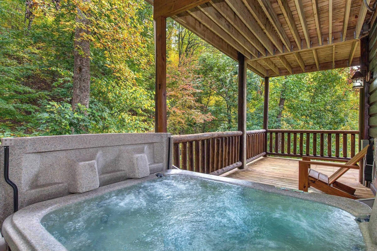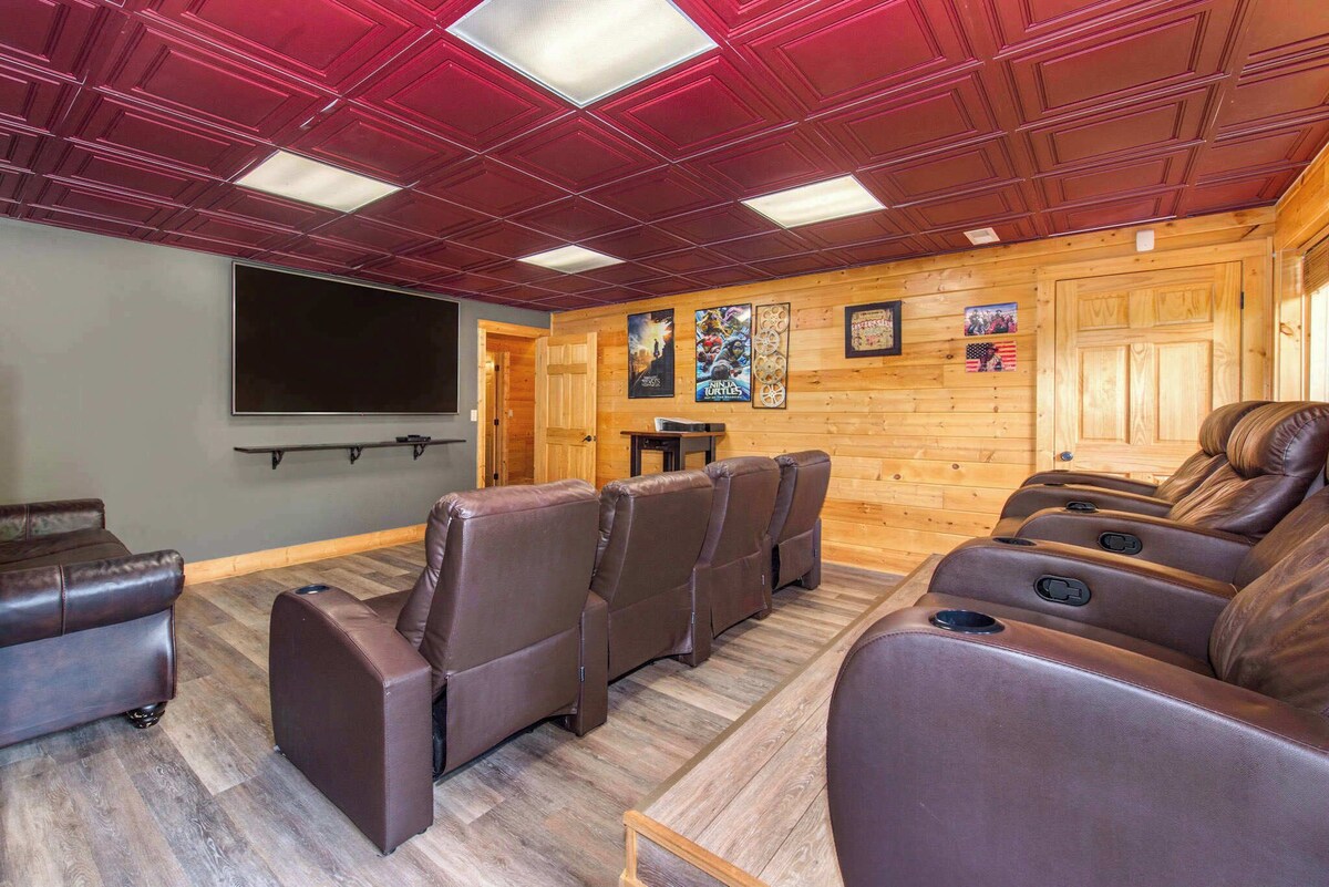 Summary: Cabin on the Edge is the perfect name for this magnificent and secluded 6-bedroom lodge, as you’ll quite literally be on the edge of everything – adventure, excitement, the Great Smoky Mountains National Park, and the vacation of your dreams! The Space: You’ll likely even be on the edge of your seat the entire time in anticipation of what you’ll discover next. Perfect for families or a traveling group of friends, this spacious home has everything you need to create the trip of a lifetime, with rustic furnishings and décor connecting you to the ruggedness of the surrounding nature paired with the modern amenities you desire to facilitate your ultimate rest and relaxation. You’ll be ideally located to the neighboring towns of Townsend, Gatlinburg, Pigeon Forge, and Sevierville, each of them offering their own unique options for shopping, dining, outdoor adventure, and energetic nightlife. Of course, you can’t pass up the opportunity to take a leisurely hike through the Great Smoky Mountains via one of several trailheads just a short distance from the home. In an area bursting with this much to see and do, all of your daytime hours can be spent fully immersed in nature. When you’re ready to call it a day, come back home to Cabin on the Edge to reconnect and recharge. One of the first things you’ll notice about this home are the multiple wraparound decks providing stunning panoramic views of the tree-lined forest and mountain canopy. Abundant options for seating allow you to take in the fresh air while catching up on a good book, enjoying a hot beverage, or even dining al fresco. Soak your weary bones in one of the two outdoor hot tubs, an opportunity for a peaceful moment away from the crowd. Heading indoors, you’ll be taken in by the soaring wood paneled ceilings and large picture windows creating a grand space for entertainment illuminated with natural light. The living room offers plush sofa seating and a smart TV creating the ideal ambiance for an evening streaming your favorite shows. The open kitchen is a chef’s delight with stainless steel appliances, plentiful counter space, and a full suite of cookware and dining ware to aid in all of your culinary goals. Enjoy meals together at either of the rustic dining room tables, with seating for 12. An additional 2 seats at the kitchen counter can be used for mealtime overflow or for more casual bites. If all that wasn’t enough, even more delights are in store! For an authentic movie watching experience, a separate theater room with a large screen TV and reclining seats will delight kids and adults alike. Pop up a bag of popcorn and queue up that new movie you’ve been saving for just such an occasion. To tap into your competitive side, make your way to the game room for hours of fun spent playing pool, or one of several arcade games. This home comfortably sleeps 22 guests between 6 private bedrooms and a sleeper sofa. Bedroom #1 includes a king size bed, smart TV, deck access, and ensuite bathroom with a single vanity, Jacuzzi bathtub, and walk-in shower. Bedroom #2 includes a king size bed, smart TV, deck access, and ensuite bathroom with a single vanity, Jacuzzi bathtub, and walk-in shower. Bedroom #3 includes a king size bed, smart TV, deck access, and ensuite bathroom with a single vanity and shower/tub combo. Bedroom #4 includes 2 queen-over-queen bunk beds, a smart TV, deck access, and ensuite bathroom with a dual vanity and shower/tub combo. Bedroom #5 includes a king size bed, smart TV, and deck access. Bedroom #6 includes 2 queen beds, a smart TV, deck access, and ensuite bathroom with a single vanity and shower/tub combo. The home also includes an additional full guest bathroom with a single vanity and shower/tub combo. THINGS TO NOTE: • Washer and dryer in home. • Driveway parking available for up to 6 vehicles. • Pet friendly! If you are bringing a pet an additional flat fee of $150 applies, and a maximum of 4 pets are allowed in the unit. If you have any questions or concerns, please feel free to contact us. To avoid fines, please keep your pet on a leash and pick up after your pet. • The gas fireplace is currently out of order. The property is located in the quaint and peaceful Wears Valley area of east Tennessee, with local shops, restaurants, wineries, and distilleries, as well as proximity to the \ Metcalf Bottoms entrance in Great Smoky Mountains National Park (1.5 miles). Nearby, the parkway in Pigeon Forge is just 12 miles from the home, and the historic charm of downtown Gatlinburg is 15 miles away. Take a trip into Townsend (9 miles) with additional national park access, shops, dining, and river tubing. Famous country singer, Dolly Parton, was born in Sevier County, making it a monumental place for devoted fans to visit. Dollywood, a family theme park jointly owned by Parton is located 15 miles from the home. If you’re looking to shop till you drop, the town and surrounding areas are dotted with galleries, boutiques, antique malls, flea markets, and so much more! Whether you’re chasing waterfalls, seeking out the best southern BBQ, or just wingin’ it, you’re sure to make lasting memories in the gorgeous Smoky Mountains. Our prices include all fees. No hidden fees.