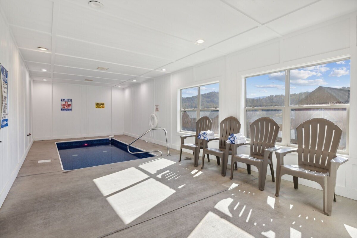 This is a new listing! What a location! No scary roads! This dog-friendly 4 bedroom, 4 ensuite bathroom Pigeon Forge cabin, with a private pool, hot tub, and game room, is only 0.3 miles from the Parkway and right in the heart of all the excitement! The Island in Pigeon Forge is less than 5 minutes away, and you'll be at Dollywood in just 10 minutes. Planning to explore Gatlinburg? It's a quick drive of less than 7 miles, where you can experience the Skybridge and Skypark. Whether you're planning a day of adventure or a night out, you're never far from the action at Pigeon Forge Plunge. The modern yet rustic decor in Pigeon Forge Plunge complements its unbeatable location. Each of the 4 bedrooms boasts an ensuite bathroom, giving you the privacy of a smaller cabin with the spaciousness of a larger one. Enjoy the convenience of the fully equipped kitchen, Smart TVs in every room, and an electric fireplace perfect for cozy nights in. Want to avoid climbing stairs? Two of the bedrooms are located on the first floor, making this cabin accessible and comfortable for all guests. Unwind in the front porch rocking chairs while watching Dollywood's nightly summer fireworks (most nights) next to the fire table—it's the perfect way to end a day in the Smokies. The game room is a hit for all ages, featuring a pool table, Smart TV, and Whiskey Barrel multi-cade Arcade with classic games like Pac-Man and Galaga. Splash around in the private indoor pool or take a relaxing soak in the hot tub on the covered porch. Outside, enjoy a meal on the grill or gather around the propane fire pit for a night of s'mores and laughter. With its wooded setting and convenient location, Pigeon Forge Plunge offers a serene retreat close to the best attractions. Explore the Great Smoky Mountains National Park, take a scenic drive through Cades Cove, or visit Clingman's Dome for stunning views. For more excitement, head to downtown Gatlinburg's Skybridge and Skypark, or enjoy shopping and dining in the vibrant area. Perfect for families or groups, Pigeon Forge Plunge combines modern amenities with a cozy cabin atmosphere. Book your stay today and experience the best of the Smokies in this one-of-a-kind vacation rental! Sleeping arrangements: 3 King Beds, 1 Queen Bunkbed, 1 Sleeper Sofa Notice: The pool is cleaned and serviced every Wednesday between 10 a.m. and 5 p.m. Delays may occur if issues arise with other appointments. This schedule is non-negotiable. **Dog Fee: $95 per dog plus tax, up to a maximum of 3 dogs.** *You must be 25 years of age* Please note: The cabin is supplied with linens and bath towels. We only supply a starter set of paper towels, toilet paper, garbage bags, dish soap & liquid, and bath bar soap. You are then responsible for said items during the remainder of your stay. **To finalize your booking with Red Door Getaways, you must sign a Rental Agreement and provide a state or federal photo ID. We will send you a link to our \ guest portal via text message, where you can securely upload your ID and a matching selfie. Once these are completed, you will receive access to the property guidebook. Your reservation is confirmed only after we receive the signed agreement and valid ID.** Our prices include all fees. No hidden fees.
