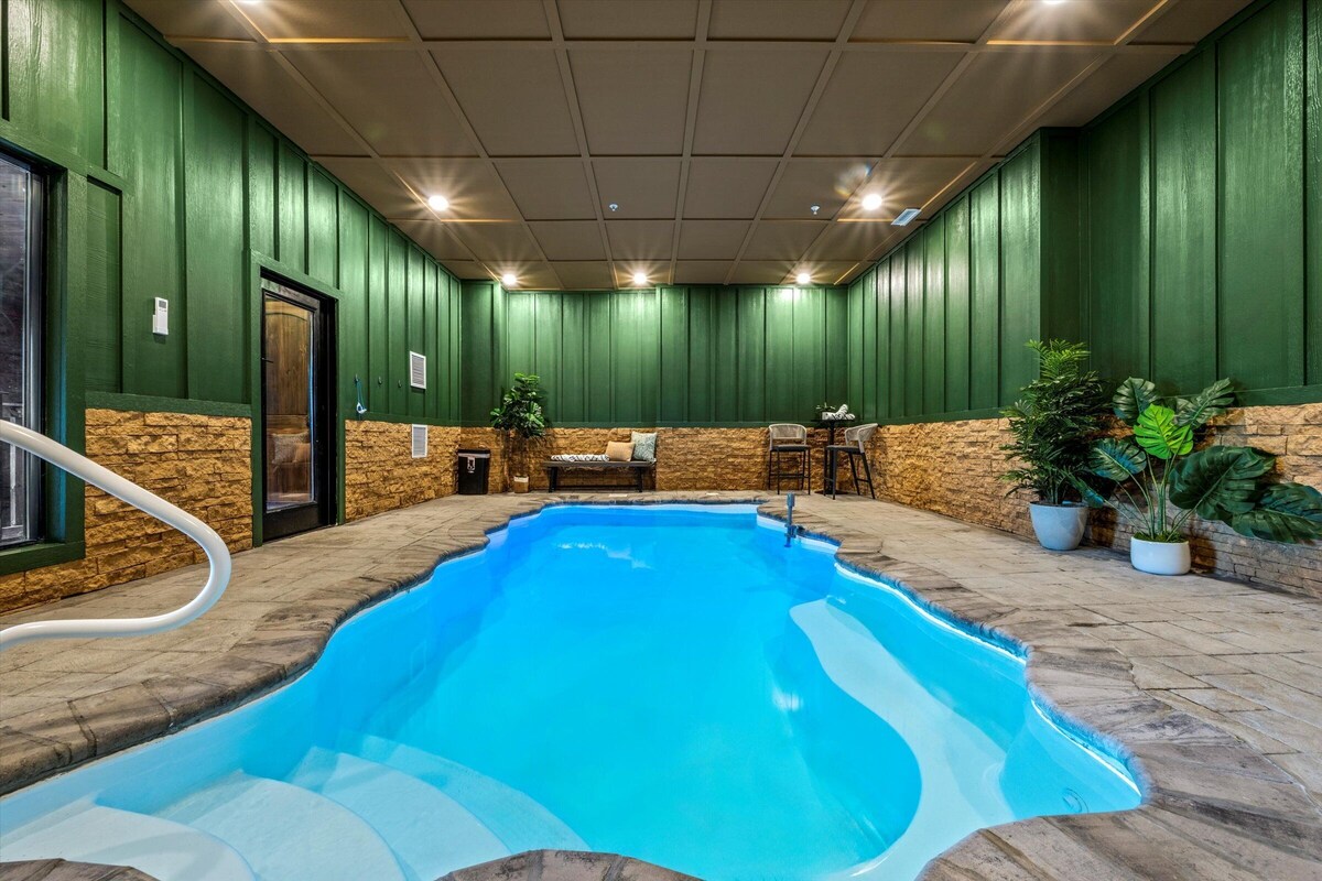 Escape to this breathtaking 6-bedroom, 4-bathroom modern cabin, nestled on 4 private acres in the heart of Pigeon Forge, Tennessee. Perfect for families and groups, this secluded retreat offers luxury, adventure, and relaxation in a serene mountain setting. This Cabin features an indoor pool, an outdoor swim spa, and endless entertainment, including pickleball, basketball, badminton, and soccer. Secluded Luxury & Comfort Tucked away from the hustle and bustle, this stunning cabin is accessed via a scenic gravel road, leading you to a peaceful oasis surrounded by nature. Inside, the open-concept living space welcomes you with stylish décor, an inviting electric fireplace, and floor-to-ceiling windows that frame the picturesque views. The fully equipped kitchen boasts stone countertops, a spacious island with bar seating, and top-of-the-line appliances—perfect for cooking family meals or whipping up snacks after a day of adventure. Spacious Sleeping Arrangements Lower Floor: 1 King | Bunk Room (2 Twin & 2 Queen) Upper Floor: 3 Kings | Bunk Room (4 Queens) Outdoor Porch: Queen Daybed Living Room: Pull-Out Couch Basketball Room: Pull out Couch For added convenience, the cabin includes two Pack ’n Plays, a high chair, a washer/dryer, fast Wi-Fi keyless entry. and even heated toilet seats for extra comfort. Outdoor Bliss & Private Recreation Step outside to your expansive deck and patio, where you can gather around the wood-burning fire pit with cozy seating or unwind by the propane fire pit near the back patio. The outdoor space also features a daybed, swinging chairs, and a dining area, making it the perfect spot to relax and soak in the peaceful mountain air. Swim, Play & Unwind Take a dip in the indoor pool or outdoor swim spa, or challenge your group to a friendly match on the private pickleball court. Whether you're swimming, playing, or simply unwinding by the fire, this retreat offers something for everyone. Enjoy a cozy fire by the pickleball court with the provided fire pit. Just bring your own firewood which can be easily purchased at a nearby store. A charcoal grill is also available for use; guests will need to supply their own charcoal and fire starter. With its secluded location, luxury amenities, and endless activities, this Pigeon Forge retreat is the ultimate getaway for families and friends seeking adventure and tranquility in the Smoky Mountains! We provide all bed linens and bath towels for your stay. To help you settle in comfortably, a starter supply of essentials is included: bath soap, toilet tissue, paper towels, laundry pack and two trash bags. These are intended to get you started before your first grocery run. Note: Before you arrive you will be asked to complete guest verification through third-party provider Truvi. This is done to ensure we are keeping up-to-date with short-term rental regulations as well as providing both our guests and our properties with extra protection. Truvi will contact you via email and/or text to complete the verification. Please do so prior to arriving at the property to enable a quick and easy check-in process. Guests must be at least 25 years old to book this cabin. A security deposit is required for guests who are exactly 25 or for those without established reviews. Private driveway with easy parking access. No construction and no community, ensuring a quiet and peaceful stay. During the winter months, 4-wheel drive or all-wheel drive vehicles are highly recommended to access our cabin due to potential snowy or icy conditions. For added peace of mind, we also encourage guests to consider purchasing travel insurance in case of unexpected weather-related changes to your plans. Your safety and comfort are our top priorities! Our prices include all fees. No hidden fees.