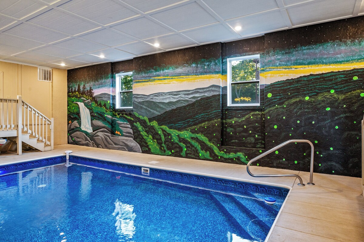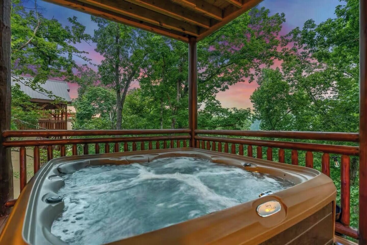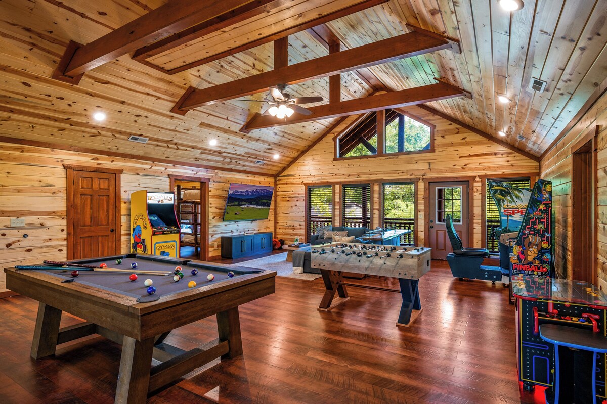 Feel like you are vacationing in the treetops with your family and friends at TWILIGHT IN THE TREETOPS, a luxurious 8 bedroom cabin that sleeps 30. Located a short 15 minute drive to Dollywood and 18 minutes to Pigeon Forge, this sprawling cabin boasts a heated indoor pool, a huge covered outdoor patio, and a fully decked out arcade game room. The new owners have just installed a high end outdoor kitchen and dining tables/bar as well as an outdoor movie theater area on the covered patio accompanied by surround sound and a 100 inch screen for a fully immersive viewing experience. Soak in the hot tub on one of the expansive decks or sip a coffee while curled up on a sofa in front of the fireplace while taking in the mountain views; you will have a truly unforgettable vacation! ★★★★★ THE SPACE ★★★★★ Our TWILIGHT IN THE TREETOPS luxury cabin is a truly picturesque, sprawling mountain cabin in Sevierville that will serve as the center of adventure and personal connection for you and your family and friends in the Great Smoky Mountains! Whether celebrating the holidays with your loved ones in cozy luxury or planning a summer getaway in the mountains, TWILIGHT IN THE TREETOPS will be the perfect vacation cabin for you! ★★★★★ UPON ARRIVAL YOU WILL FIND ★★★★★ A large CHEF'S KITCHEN features full size appliances, granite counter tops, and a kitchen island with bar seating. A fully stocked COFFEE STATION with Keurig machine, drip coffee pot, K cups, ground coffee, filters, coffee creamer, and sweetener for the perfect cup of coffee while you relax looking at the treetops. The DINING AREA just off the kitchen features dining tables with seating for 20, and there is also an outdoor table on the Deck with seating for another 8. An expansive LIVING ROOM with an indoor fireplace, large Smart TV, and views of the mountains beyond. An OUTDOOR MOVIE THEATER area on the massive covered patio with SURROUND SOUND, a 100 INCH SCREEN, and a new high-end custom OUTDOOR KITCHEN and DINING/BAR area. Two massive COVERED DECKS, one located off the Living Room featuring a hot tub overlooking the mountains, outdoor dining table and rocking chairs. An INDOOR HEATED POOL with pool toys provided as well as pool towels accompanied by a hand-painted black light mural on the wall A stocked LAUNDRY ROOM with a full size washer and dryer. A fantastic ARCADE GAME ROOM with pool table, foosball and a wide variety of arcade games, including a vintage Cruis'n World racing game. ★★★★★ SLEEPING ARRANGEMENTS ★★★★★ Bring everyone you know - literally! This cabin has eight oversized BEDROOMS and sleeps up to 30 people: Four Main Level MASTER BEDROOMS (each sleeps 4), each of which has one King bed and one Twin day bed with a Twin-sized trundle underneath. One Upstairs MASTER BEDROOM (sleeps 4) that has one King bed and one Twin day bed with a Twin-sized trundle underneath. One Upstairs BEDROOM (sleeps 4) that has two Queen beds. Two Upstairs BUNK BEDROOMS (each sleeps 8), each of which has two sets of Queen-over-Queen bunk beds. Each of the BEDROOMS is equipped with its own EN SUITE BATHROOM, wall-mounted Smart TV and a ceiling fan. ★★★★★ DRIVING UP TO THE CABIN AND PARKING ★★★★★ The drive up to the cabin weaves through hills until you find yourself in the treetops. The road on which the cabin is situated can be steep at times, so please use caution. The paved driveway easily fits up to twelve cars. The cabin is only 18 minutes to the strip in Pigeon Forge through the less-traveled backroads, so you can avoid a lot of traffic. Dollywood is even closer, only 12-15 minutes away. ★★★★★ WE ARE EXCITED TO HOST YOU ★★★★★ Whether you are visiting this ~6K square foot cabin for a family vacation, a girls’ or guys' weekend, or a birthday celebration, this oversized Sevierville vacation cabin will serve as the center of everything fun! Don't wait ... hurry and make your reservation before the dates fill up for this one-of-a-kind space! WILDLIFE: The Smoky Mountains are home to a multitude of wildlife including bears, coyotes, racoons, possums, birds, snakes, etc. Please be aware of your surroundings and keep all food items/trash appropriately stored and disposed of. Please clean the grill promptly after using to prevent wildlife from visiting! SECURITY CAMERAS: There are two security cameras located on the front exterior of the home. These cameras record audio and video but only of the front exterior of the cabin. PEST CONTROL: This property is in the heart of the Smoky Mountains, which is an extremely woodsy area. We have pest control that comes out every month to prevent bug issues, but on occasion, bugs may find their way into the home through open doors and windows just like any other home. Please keep doors and windows shut whenever possible to prevent bugs from entering behind you. PETS: We are dog friendly (sorry, no cats or other pets of any kind), and we are happy to welcome your pooches during your stay! If you plan to bring your dog, there is a pet fee of $50 per dog per night plus tax. This will be included in your reservation total prior to booking if dogs are included in your reservation. If you need any help adding your pet dog after your trip is booked, please do not hesitate to let us know! Pet fees are due in full prior to your check in date. By including pet dogs in your reservation or by bringing pets that are not listed in your reservation to the property, you are authorizing us to collect all applicable pet fees. If you have any questions about our pet policies or how pet fees are processed, please let us know! Our prices include all fees. No hidden fees.