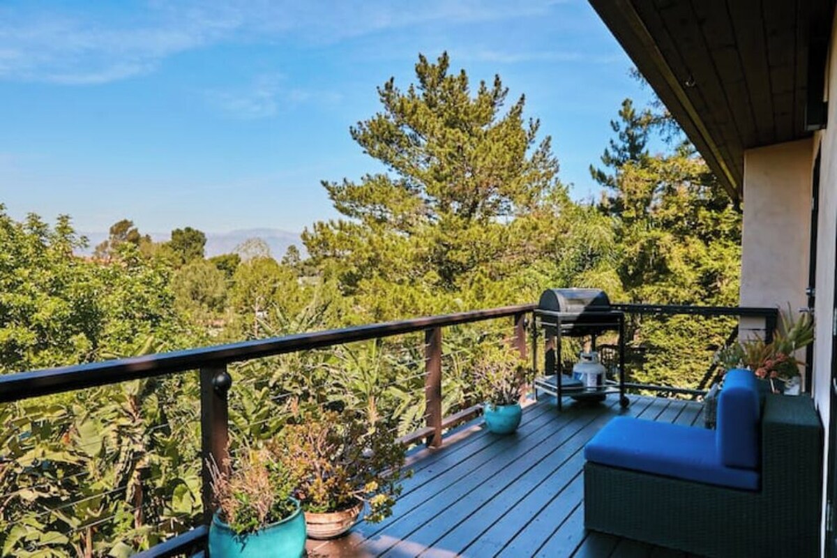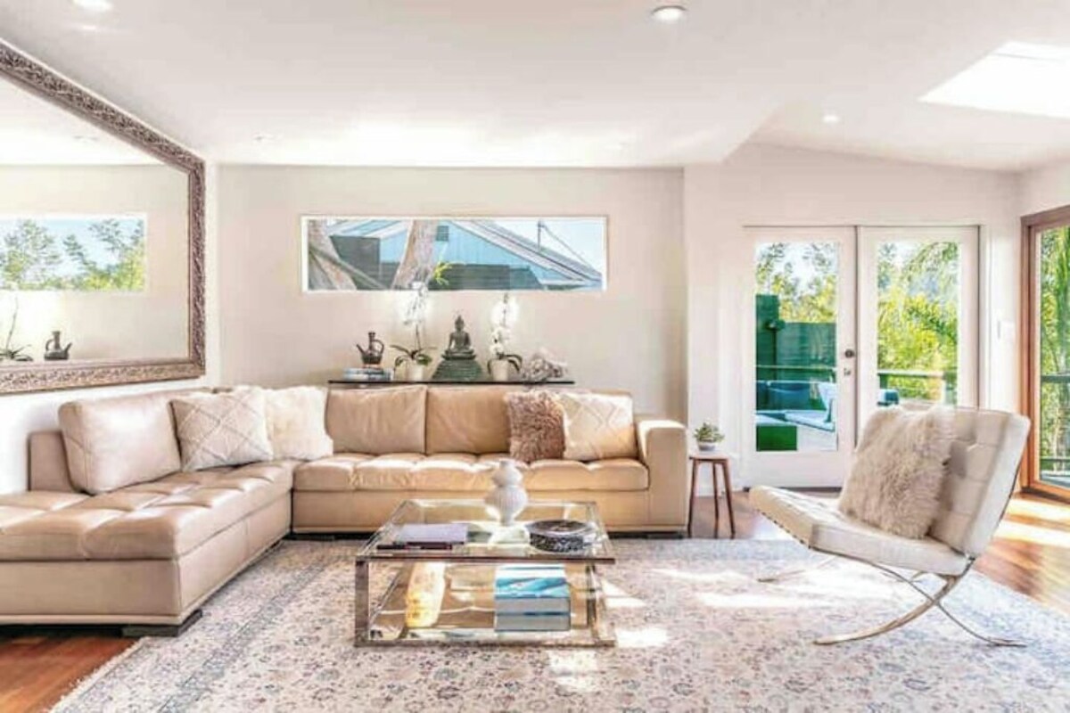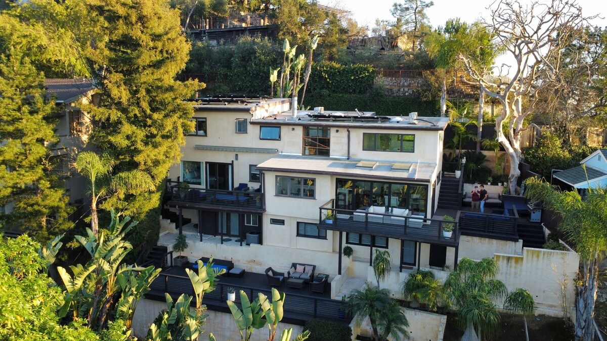 Welcome to your stunning modern retreat nestled in the iconic Hollywood Hills! This 3-bedroom, 3-bathroom home offers breathtaking 280-degree views of lush gardens, rolling hills, and the dazzling Los Angeles skyline. Just off Mulholland Drive, this serene yet luxurious hideaway is perfect for experiencing peaceful nature while staying close to Hollywood’s top attractions. ⭑CONTACT US FOR SEASONAL OFFERS⭑ The space ⭑Master Bedroom:⭑ ✔ King-sized bed with floor-to-ceiling windows overlooking city views ✔ Direct access to a private deck for ultimate relaxation ✔ Elegant en-suite bathroom with dual sinks (note: right sink not operable) ⭑Second Bedroom:⭑ ✔ Queen-sized bed with sleek, modern decor ✔ Access to private deck with tranquil hillside views ⭑Third Bedroom:⭑ ✔ Queen-sized bed located on the bottom level ✔ Separate entrance for enhanced privacy ⭑Living Space:⭑ ✔ Open floor plan with Brazilian cherry hardwood floors and skylights ✔ Spacious family room with cozy seating and a 60-inch HDTV with premium cable ✔ Accordion glass doors (note: only the far-right door is operable) ⭑Kitchen and Dining Area:⭑ ✔ Top-of-the-line appliances: Sub-Zero Refrigerator, Miele Stove, and Thermador Oven ✔ Kerala marble countertops and island cooktop ✔ Fully stocked kitchen with condiments and utensils ⭑Bathrooms:⭑ ✔ Three elegant, modern bathrooms with premium fixtures ✔ Immaculately clean and well-maintained ⭑Outdoor Space:⭑ ✔ Private sauna overlooking lush hillside scenery ✔ Multiple levels of outdoor deck space with sectional seating ✔ Magical sunset views that flood the home with golden light ⭑Additional Amenities:⭑ ✔ Dedicated workspace with fast WiFi ✔ Pet-friendly accommodation ✔ Housekeeping and private masseuse services available upon request ✔ Grocery delivery in under 30 minutes ⭑Safety and Security:⭑ ✔ Keypad remote entry for added security ✔ Exterior security cameras monitoring street-level activity only ⭑Entertainment and Connectivity:⭑ ✔ 60-inch HDTV with premium cable channels ✔ Easy access to Uber, Doordash, Postmates, and more ⭑Parking and Facilities:⭑ ✔ Free parking on the premises ⭑Services:⭑ ✔ Chef and private dining experiences available upon request Your stay at this Hollywood Hills retreat promises tranquility, luxury, and breathtaking views. Located at the end of a cul-de-sac, this private haven offers easy access to iconic attractions: ✔ 10 minutes to Universal Studios and the Hollywood Bowl ✔ 15 minutes to Griffith Observatory and Beverly Hills ✔ Close to Sunset Boulevard, Melrose Street shopping, and top comedy clubs ⭑Important Notes⭑ ✔ The accordion doors are for viewing only; only the far-right door is operable. ✔ Guests have full access to all spaces, including private decks and the sauna. ✔ Please respect our quiet community—no parties or loud music allowed. ✔ Book your stay today and experience the perfect blend of nature, luxury, and city life in this Hollywood Hills gem! Registration number HSR23-003741 Our prices include all fees. No hidden fees.