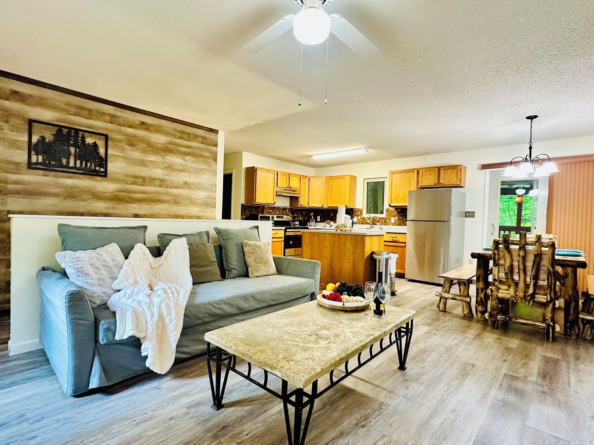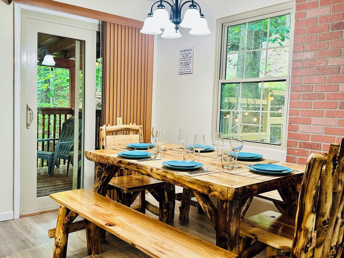 Escape to this cozy cabin nestled perfectly between Pigeon Forge and Gatlinburg! Ideal for families or friends, it sleeps 9 with 2 bedrooms, 2 bathrooms, and a game room with arcades. Unwind in the private hot tub, soak up seasonal mountain views, and enjoy outdoor seating and fresh mountain air. Explore Dollywood, The Island, and Great Smoky Mountains National Park—just minutes away. Experience the best of both towns in one perfect mountain retreat! Book your stay for an amazing trip! Sugar Mountain cabin is minutes away from top attractions like Dollywood, The Island, and the Great Smoky Mountains National Park. ● Parkway - 3 minutes away ● Gatlinburg Downtown - 10 minutes away Comfy Accommodation ● 2 bedrooms and 2 full bathrooms. ● Sleeps up to 9 guests — perfect for families and groups. ● Open-concept living area with plenty of space to relax. Relaxation and Fun ● Private hot tub for unwinding after exploring. ● Seasonal mountain views and outdoor seating to soak in the fresh air. ● Game room with classic arcades and games for endless fun. Modern Amenities ● Fully equipped kitchen with everything you need. ● High-speed Wi-Fi, smart TVs, washer and dryer. ● Heating and air conditioning to stay comfortable year-round. Tranquil Setting ● Surrounded by nature for a peaceful, quiet escape. ● Woodsy charm and cozy cabin feel throughout. ● Large deck for gathering and enjoying the outdoors. Easy Access ● 2 parking spaces for vehicles. ● Just minutes from shopping, dining, and attractions. ● Convenient drive to everything in the Smokies. Our prices include all fees. No hidden fees.