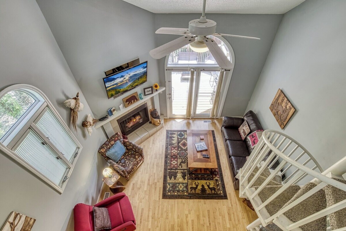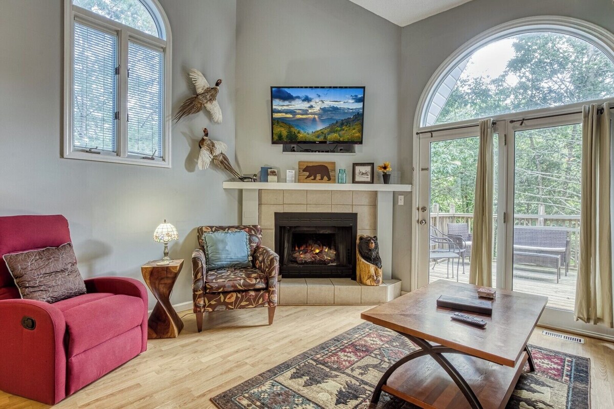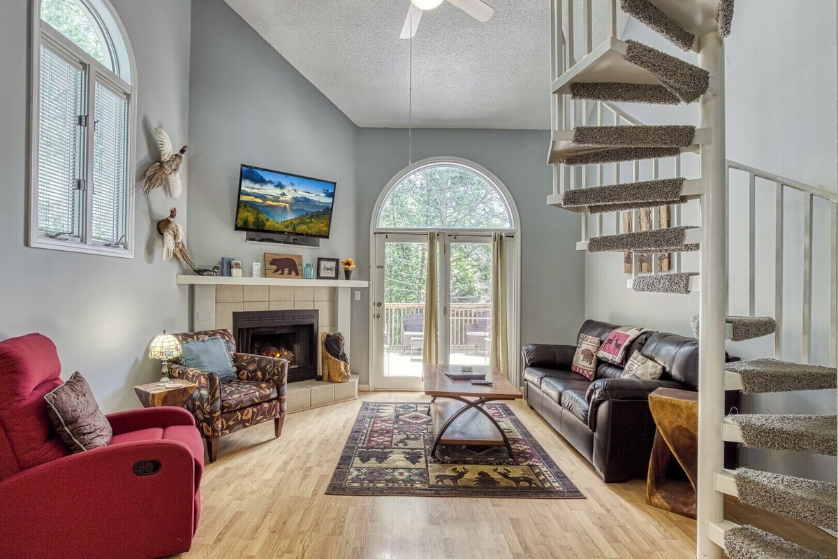 Pigeon Forge Vacation Rental, unit 400 Feathers and Fur, is a beautiful two bedroom two and a half bath townhome that is in the Woodridge Village Resort which is just minutes from downtown Pigeon Forge, and townhome itself is within walking distance to the seasonal outdoor swimming pool! The main level of this property features a fully furnished kitchen and a living room offering a tile encased seasonal gas fireplace. There is also a private deck on the main level offering plenty of seating and a gas grill where you can cook your favorite meal while taking in the beauty of Woodridge Village. The whole level downstairs is a private bedroom offering a queen size bed, 32-inch TV, a oversized private bathroom with a Jacuzzi and a separate walk-in shower, and a private deck with a four-person hot tub. The upper level of the cabin is accessed by a spiral staircase and features a private bedroom with a queen size bed, 32-inch TV, and a private bath with a walk-in shower. This beautiful property has everything you need to for an unforgettable trip to Pigeon Forge and the Great Smoky Mountains. The property has two assigned parking spots, and parking is limited to two vehicles only. Dogs are welcome but must be under 35 lbs and additional fees apply and must follow Fireside Chalets pet policies. WIFI included. No-Smoking. Sleeps 6. Our prices include all fees. No hidden fees.