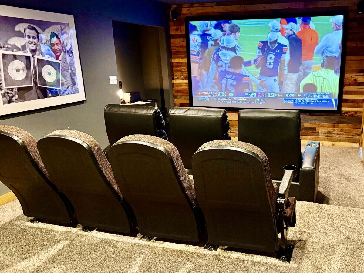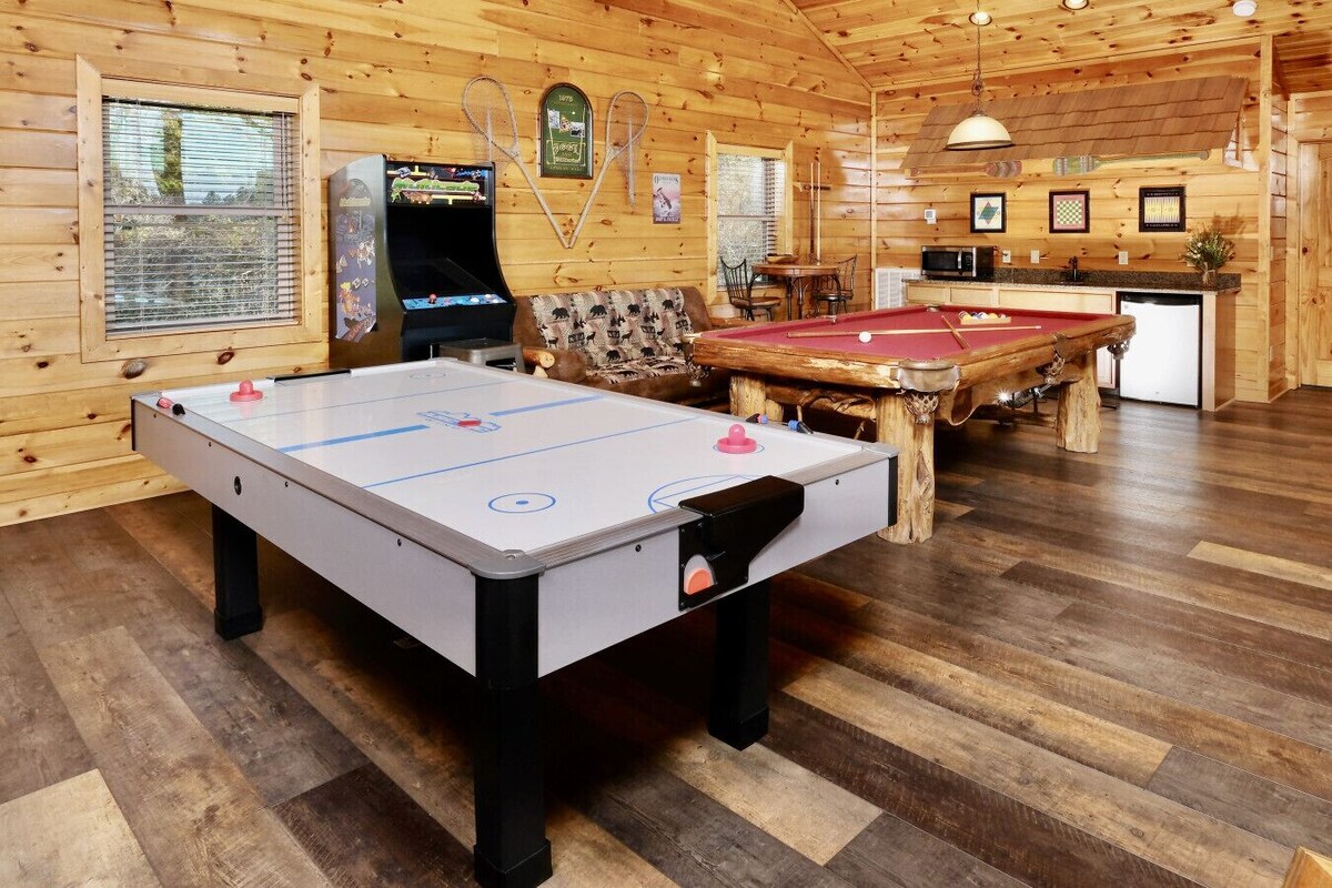 Centrally located in the gorgeous area between Pigeon Forge and Gatlinburg, Mountains, Movies and More is a spacious upscale cabin that provides all of the amenities you need for that perfect vacation getaway. This cabin`s fine amenities include 3 king suites, theater room, game loft, hot tub and mountain views. After taking in the beautiful mountain views from the hot tub outside as well as the two-story great room inside, you can enjoy your favorite movie in the cabin’s own theater room that comfortably seats 11 people. Other entertainment options are in the cabin’s large mountain-view game loft – air hockey, pool table, wet bar, and Multicade arcade system (containing tons of classics like Pac-Man, Galaga, Frogger, Donkey Kong, Space Invaders, Ms. Pac-Man, etc.). Following a lively evening with family and friends in the rockers on the deck, you can relax in one of the cabin’s three private king bedrooms that each have their own Jacuzzi tub, shower, flat screen TV, and private balcony with a view of the mountains. Two of the three bedrooms are located on the main floor, which is perfect for families with older, less mobile guests. The cabin has also two queen sleeper sofas in the great room and a full size futon in the game loft. Due to these sleeping arrangements, this cabin is not recommended for more than 6 adults, but can sleep up to 12, assuming 6 guests do not mind sleeping on sleeper sofas or the futon. There is only one crew of housekeepers that clean this cabin (most cabin rentals are serviced by rotating crews who clean many cabins per day). Many previous guests have described this cabin as very clean. We have two full sets of luxurious sheets and towels for this cabin that are meticulously cleaned and switched out before each stay, so you are not dealing with linens that were previously used in a cabin that allowed smoking or fraternity parties. We have added liquid hand soap to each sink to ensure that all guests can continue to keep themselves and others germ-free. Also, if you decide to leave your mountain paradise, you are only minutes away from the attractions of Pigeon Forge and Gatlinburg. Enjoy attractions such as Dollywood, Dolly Parton`s Stampede, or The Island in Pigeon Forge. Mountains, Movies & More is less than 9 miles and 17 minutes away from these locations and the most popular area attractions (driving time is approximate): Parkway: 1 mile, 3 minutes Pigeon Forge: 2 miles, 4 minutes Gatlinburg: 3 miles, 6 minutes Dolly Parton`s Stampede: 3 miles, 8 minutes Rocky Top Mountain Coaster: 4 miles, 9 minutes Dollywood & Splash Country: 5 miles, 11 minutes Food City grocery store: 5 miles, 11 minutes Ripken Baseball: 5 miles, 12 minutes Island in Pigeon Forge (including Old Smoky TN Moonshine): 5 miles, 11 minutes Ripley`s Aquarium & SkyPark: 6 miles, 12 minutes Titanic Museum & Hatfield & McCoy dinner show: 7 miles, 13 minutes Great Smoky Mountains National Park: 7 miles, 15 minutes Tanger Outlet Mall: 8 miles, 16 minutes Mountains, Movies & More is also only about 38 miles (62 minutes) from the Knoxville airport and 32 miles (56 minutes) from the University of Tennessee. Unlike many area cabins with all concrete in the front and a steep drop-off in the back, Mountains, Movies & More has a slightly sloped grass yard for pets to relieve themselves. If you are bringing a dog(s), you must check the box in the Travelers section `I am traveling with pets`. The nonrefundable pet fee for the first dog is automatically included in your price assuming that you checked the box. If you are bringing a second dog, a nonrefundable pet fee of $25 per night ($100 max per week) will be collected sometime between your booking date and check in date. House-trained dogs of any size are welcome. You are responsible for picking up after your dog(s) and keeping your dog(s) in a crate (guests must bring them -- they are not provided) when guests are not in the home. If additional costs are incurred for cleaning, pick-up, or damage as a result of the dog(s), you will be billed for those costs. Due to the incline of the driveway, this cabin is not RV accessible, however normal passenger cars/vans/trucks can easily drive up and down the cabin`s paved driveway. This cabin also has: *Beautiful mountain views *Deluxe theater room with seating for 11, 120 inch UHD/3D/TD screen, Blu-ray DVD player and Xbox One *New 65` Samsung 4K TV in great room *Approximately 4 minutes/2 miles to the Parkway, yet back road access in times of congestion (via Upper Middle Creek and Veterans Blvd.) *WiFi *9ft decorated Christmas tree from mid November to early January *Quality linens *Washer/dryer *Two coffee makers - one Keurig and one regular drip coffee maker *All flat screen TVs *A large deck with hot tub, rocking chairs and incredible mountain views *3 large king bedrooms, each with its own private bathroom, flat screen TV, and private balcony with a view of the mountains *3 full bathrooms, each with a Jacuzzi tub, shower and double sinks *2 half bathrooms, next to the open kitchen/living room and next to the theater room *Starter supply of toilet paper, paper towels, dish liquid, dishwasher pods/packets, garbage can liners and hand and bar soap (for large groups and longer stays, additional items can be purchased at nearby grocery stores or delivered by Instacart) *Later check-out time (11:00AM) than many similar cabins in the area ***This isn`t a late night party spot or a crash pad. Please be respectful and take care of it as if it were your own. Additionally, per the terms of our rental agreement, YOU MUST BE 25 YEARS OF AGE OR OLDER in order to rent this cabin. Otherwise you must be accompanied by a responsible parent or guardian /group leader. Guests have access to the entire cabin except for one small locked owner`s closet. Although I am not available in person, I am just a text or cell phone call away. I answer my phone 24/7 and contact my housekeeping and maintenance crew that live less than