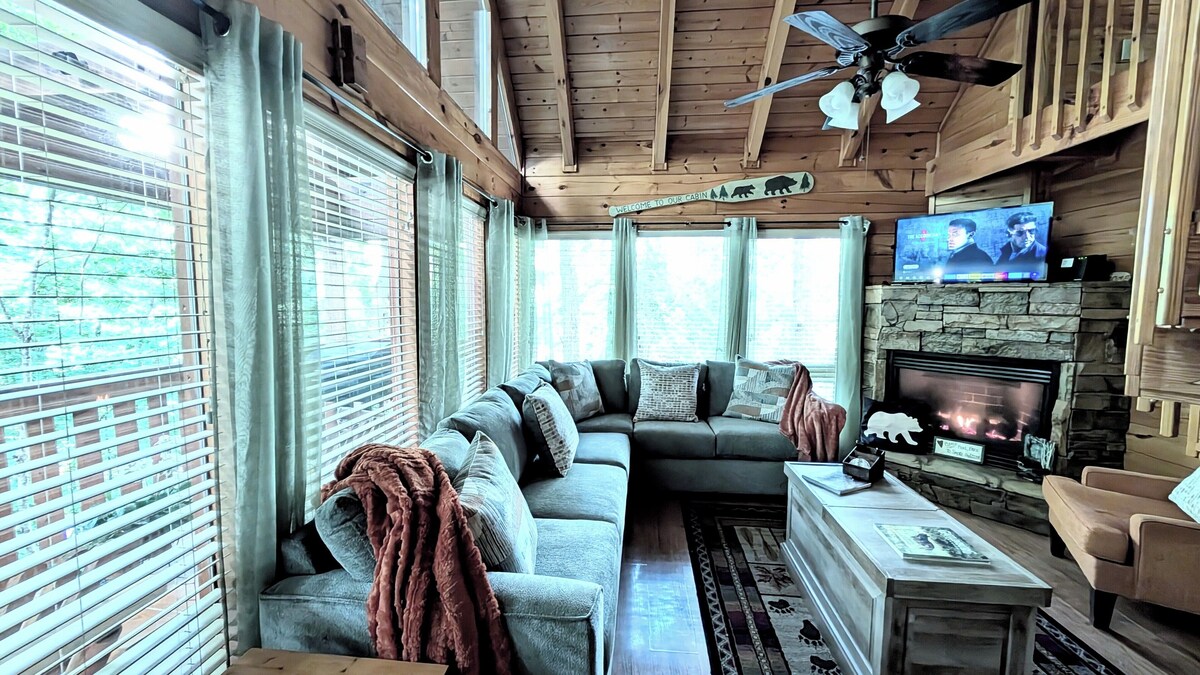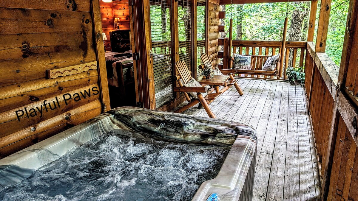 Looking for a romantic getaway or a small friends or family vacation, Playful Paws Cabin will offer you the rustic elegance you are looking for. Conveniently located between Gatlinburg and Pigeon Forge, less than 3 miles off of the main parkway, this cabin has a peaceful private wooded setting on the side of a beautiful mountain with two decks featuring rockers, porch swing, grill, and a large bubbly hot tub. While on the deck you will feel completely surrounded by nature, a million miles from the bustle left behind. This beautifully decorated cabin offers custom log furniture, a stone fire place, a full kitchen, washer/dryer, large screen HDTVs (with digital cable package), High-Speed WIFI Internet, a flat driveway, beautiful black bear decor, and more. Come play in our spacious game room filled with a 6ft pool table, foosball table, air hockey table, board games, and puzzles, . The Master Bedroom is designed with a luxurious King bed, cozy stone fire place, a romantic waterfall Jacuzzi for two, its own private deck with a hot tub, a separate full bathroom, HD TV, and floor to ceiling windows that look out to the mountain setting views. Playful Paws Cabin is the perfect place to unwind for a well deserved getaway. Reserve your stay at Playful Paws Cabin by submitting a date request on the right of this screen or by choosing the book now option. This cabin is pet friendly for one dog pet less than 50lb with $150 pet fee per stay. Please seek prior-approval of pet, house rules apply . With your stay at Peaceful Paws Cabin you access to: *Charcoal Grill * TV and Movies Apps * Books, Puzzles *Board Games *WIFI Internet *security cameras in safe community *Recommendations to restaurants and attractions We also provide added security to this safe monitored neighborhood while maintaining your privacy. Exterior security cameras cover front exterior entrance to the home and parking. Ready for winter magic, Peaceful Paws Cabin is just a 10 minute drive from Gatlinburg's Winter Wonderland Festival activities with music, street performers, venders, arts and crafts, food, light displays, huge Christmas tree, and more.. Festival runs Nov-Feb. Within 15 minutes to Ober Ski Mountain for skiing, sledding, and ice skating. If your looking for Spring and Summer Fun book Peaceful Paws Cabin now. The cabin is also within a 5 minute drive or a nice walk to a creek and ponds. only a 10 minute drive to 3 rivers great for swimming, wading, frog hunting, or just sitting on a rock relaxing. Close to the national park where there are many waterfalls some with reflective pools to swim in, hiking trails, bike trails, and motor trails. This cabin's location is prime. You will be minutes away from the attractions of Gatlinburg: Explore great Gatlinburg attractions at one of its unique museums, craftsmen fair, miniature golf courses, water parks, motion simulators and Go-Karts or bumper cars. Check out one of the nation's best aquariums, Ripley's Aquarium of the Smokies. The Gatlinburg Ripley's also features mini golf, haunted adventures, mirror maze, a moving theater, a fun zone and, of course, the famous Ripley's Believe it or Not Museum. Gatlinburg is also known for its Golf, specialty shops, restaurants, Whitewater Rafting, biking, hiking, and Canopy zip lines. Or adventure out on one of the many amazing hikes in Smokey Mountain National Forest, here you will find true serenity. Playful Paws Cabin is also minutes away from downtown Pigeon Forge: Here you can enjoy a day at Dollywood. Or one of the many other activities found in Pigeon Forge, such as water parks, Titanic Museum, Wonder Works, Magic Quest, miniature golf, go karts, fairs, dinner theater shows, shopping outlets, and pancake houses galore. Playful Paws Cabin is a great location to try out Dollywood — Now known for the first winged roller coaster in the country. The ride delivers a heart-stopping twist on regular roller-coaster seats. Seats jut out on either side of the track, so have nothing above or below them but air — giving them a real sensation of flying as they scream at more than 60 mph through four inversions and a zero-gravity roll. Of course, the 200-foot-high coaster’s cars are built to look like the national bird. Some of our favorite hikes are: Mingo Falls Mingo Falls is on the Cherokee Indian Reservation (Qualla Boundary), just outside Great Smoky Mountains National Park. No special permits are required for access to the reservation. At 120 feet tall, the waterfall is one of the tallest and most spectacular in the southern Appalachians. The hike to the waterfall is only 0.4 miles in length, but is considered moderate in difficulty. Access Trail: Pigeon Creek Trail Trailhead: From Oconaluftee Visitor Center, drive south (toward Cherokee) on US-441 and take the second left onto Big Cove Road. At the first stop sign turn left and drive 4.5 miles to Mingo Falls Campground, where the trail begins. Juney Whank Falls Juney Whank Falls is divided into an upper and lower section. Both can be viewed from the footbridge which crosses Juney Whank Branch at the falls. Together they drop 90 feet from top to bottom. The trail to the waterfall is 0.8 miles roundtrip and is considered moderate in difficulty. Grotto Falls Trillium Gap Trail meanders through an old-growth hemlock forest and actually runs behind the 25 foot high waterfall. The cool, moist environment near the falls is ideal for salamanders and summer hikers. The hike is 3 miles roundtrip and considered moderate Trailhead: From the parkway in Gatlinburg, turn at traffic light #8 and follow Historic Nature Trail into Great Smoky Mountains National Park. Take Roaring Fork Motor Nature Trail to stop #5 where there is a large parking area. This one is close and absolutely beautiful. I last hiked it with my 60 year old mother and 4 nieces and nephews ranging in age from 3-11 years old. We saw 3 bears at a distant, swam in the reflective pool of the falls, and had a fun-filled day without ove