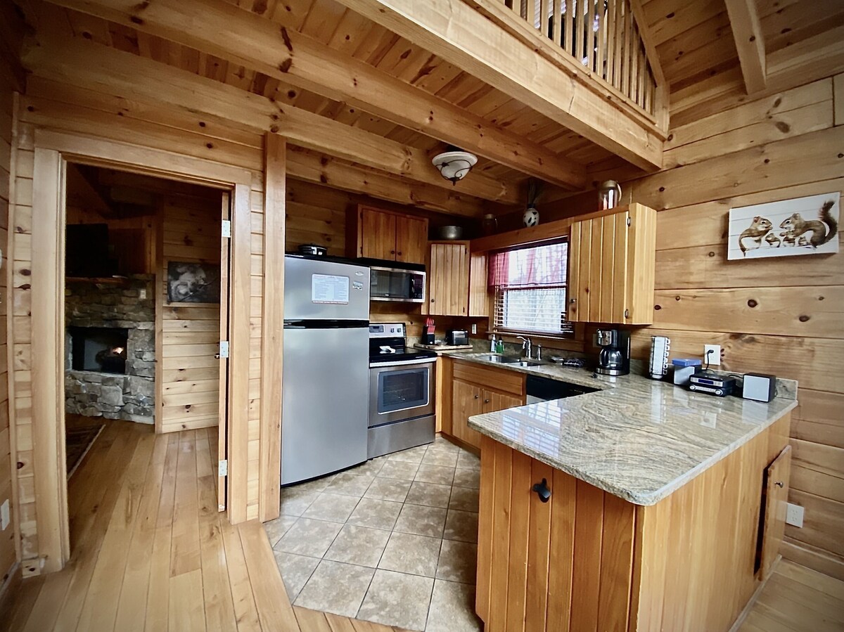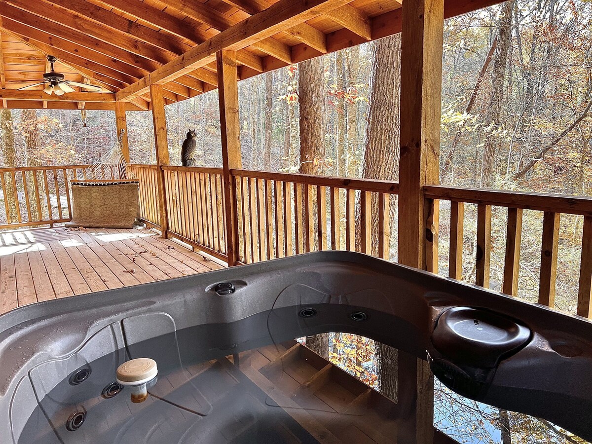 Flying Squirrel is a private, secluded one bedroom, one bathroom cabin that is tucked away in the woods making for a perfect romantic getaway or a quaint, small family vacation. *** PLEASE NOTE: Maximum occupancy is 5 people, BUT only 4 adults max. Also, the only bathroom is accessible from the bedroom*** If you are ready to unwind and enjoy your time away from \ look no further. Unwind in the hot tub, play a couple hands of cards, shoot some pool, watch a little TV, play horseshoes outside, or take a stroll around the area. Entering Flying Squirrel's private drive, You will find yourself swept away into the secluded woods surrounded by nature and the beauty of the Smoky Mountains. There are only 3 cabins in this private 7 acre area and they are situated in a way to provide ultimate privacy. Flying Squirrel is directly between Pigeon Forge and Gatlinburg and a quick half mile off the main Parkway. You will feel as though you are away from it all yet still are so close to enjoy all the town has to offer. The master bedroom has a king sized bed that sits next to a stone-stacked gas fireplace where you can relax. The bathroom - only accessible through the master bedroom - has a custom tiled jetted shower with no bathtub. The cozy living room is surrounded by a wall of windows and has a beautiful gas fireplace. There is a new couch with a pull-out sleeper sofa and comfy recliner. The kitchen comes fully stocked with appliances, cookware, and utensils for those nights you want to stay in and cook with the food you supply. The dining room which seats 4 will have you feeling as though you are eating in a tree house as your are surrounded by walls of windows looking into the woods. The upstairs loft is a fun little spot where you can play pool or sit on the couch and watch tv. The upstairs loft has a pull out sofa. There is WiFi but it is not High-speed data therefore not intended for streaming movies, videos, tv, or music. **Check in: After 3 PM **Check out: Before 10 AM **Non-Smoking **Pet Friendly —> you must check the box for bringing a pet and pay the $18 per night fee per pet (2 max). You must inform me if bringing two pets so I can update reservation and fees PLEASE NOTE: You must keep pet leashed while outdoors and crated when left alone. Any information in the description BELOW this paragraph is automatically generated by Vrbo’s AI description generator. It’s subject to change and inaccurate information. Please rely only on owner description above this paragraph and feel free to reach out with any questions. Our prices include all fees. No hidden fees.