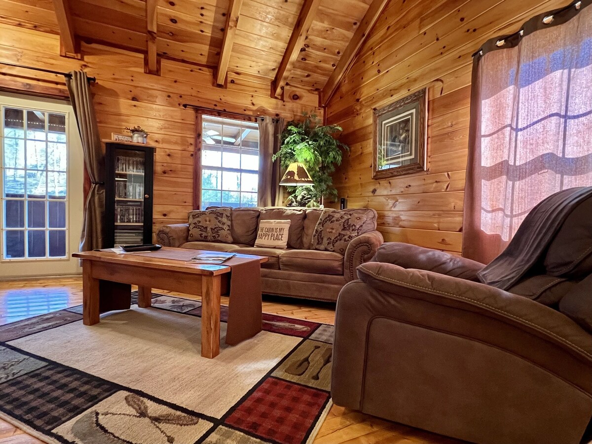 ▶︎ All dogs must be PRE-APPROVED. Please inquire BEFORE you book. ▶︎ Dog owners, click VIEW MORE and scroll 🔻 to the bottom to request a pet stay. With its peaceful location at the edge of a private community fishing pond, Water's Edge is not your typical cabin in the Smokies. FISHING FUN Few cabins in the smokies offer a fishing pond right out your front door. Catfish, bass and bluegill await your line and no fishing license is required. Water's Edge overlooks a peaceful pond and the closest cabin is 200 feet away. Catch and release fishing only. ROMANTIC MASTER BEDROOM This pet-friendly log cabin may be a fisherman's paradise outside, but inside it's all about creature comforts. Beautiful vaulted wood ceilings keep this 792 square foot cabin feeling spacious. The king bedroom offers a new mattress, double sided fireplace (available Oct 1-April 1), 25-inch TV and heart shaped jacuzzi. The attached bathroom has a generous walk-in shower. LIVING AND DINING AREA In the living and dining area, the stacked stone fireplace shares the focal point of the room along with a 42 inch flat screen TV. Enjoy DVD movies, Gamecube video games, free WI-FI or catch a favorite show on TV. The sleeper sofa in the living room folds out to a queen bed. We also have a Pack-N-Play and high chair in the closet if needed. SCREENED PORCH The hot tub and outside dining area are located on a screened porch that runs the length of the cabin. Rope lights add a festive touch and since it's bug free, you'll find yourself enjoying the outdoor living space that much more. Another plus is that this porch is totally enclosed so your pets can be with you and you don't have to worry about them getting loose. DINE AT THE CABIN The kitchen is compact but well outfitted for dining in. You'll have plenty of good quality kitchen wares and small appliances for making a simple snack or a BBQ dinner. Hard anodized cookware, Pyrex baking dishes, half sheet baking pans and good quality utensils make up the kitchenware. NO STAIRS AND EASY ROADS=GREAT ACCESSIBILITY One of the nicest things about Water's Edge is the ease of access. You're 4.5 miles from the heart of Pigeon Forge at Traffic Light 3--only a few minutes away. But with no steep mountain roads to climb, winter time access is very good. Plus if stairs are a concern, the cabin has a simple ramp that leads inside and all living is on one level. (Note: while Water's Edge has easy accessibility, there is a slightly raised threshold at the entry door and the shower floor has raised edge to keep water in the shower base.) 🐾 🐾 HOW TO REQUEST A PET STAY 🐾 🐾 Water's Edge welcomes adult dogs up to 75 pounds. Sorry--no puppies, kittens or cats. The pet stay fee is $125.00 plus tax and is charged PER PET. We appreciate any supporting details so we can determine if you pet is a good fit for the cabin. We may be able to consider two dogs. Dogs must be experienced travelers. Absolutely no confining of pets to the bedroom or bathroom. ▶︎ Fill in your travel dates, guest and pet info in the form. ▶︎ Click on CONTACT HOST (look for bold blue text). ► Reply in the \ box with your inquiry and pet details: 🔲 Provide NAME, AGE, BREED, WEIGHT 🔲 Flea/tick control program 🔲 Confirm you will bring a crate or indoor dog play-pen and use it for when your dog is staying alone at the cabin. 🔲 Agree that you will not allow your pet on the bed(s) 🔲 Agree to pick up after your dog in the yard or on walks Thanks for providing your pet info and we'll follow up with you promptly! Our prices include all fees. No hidden fees.