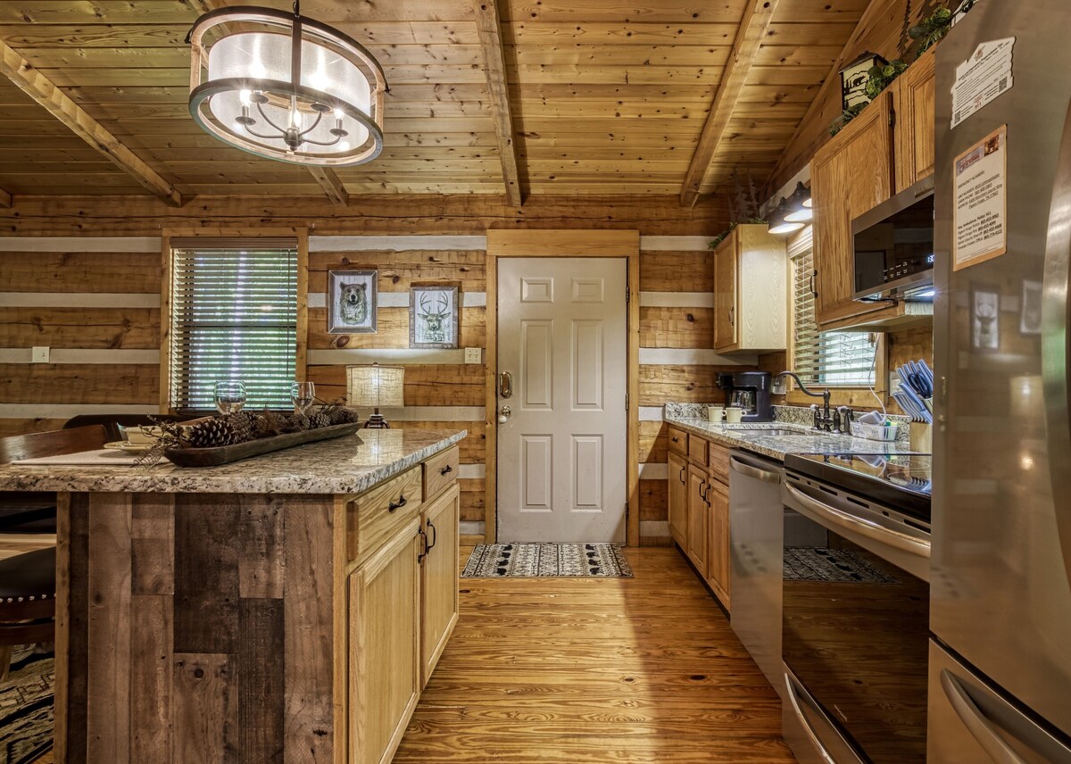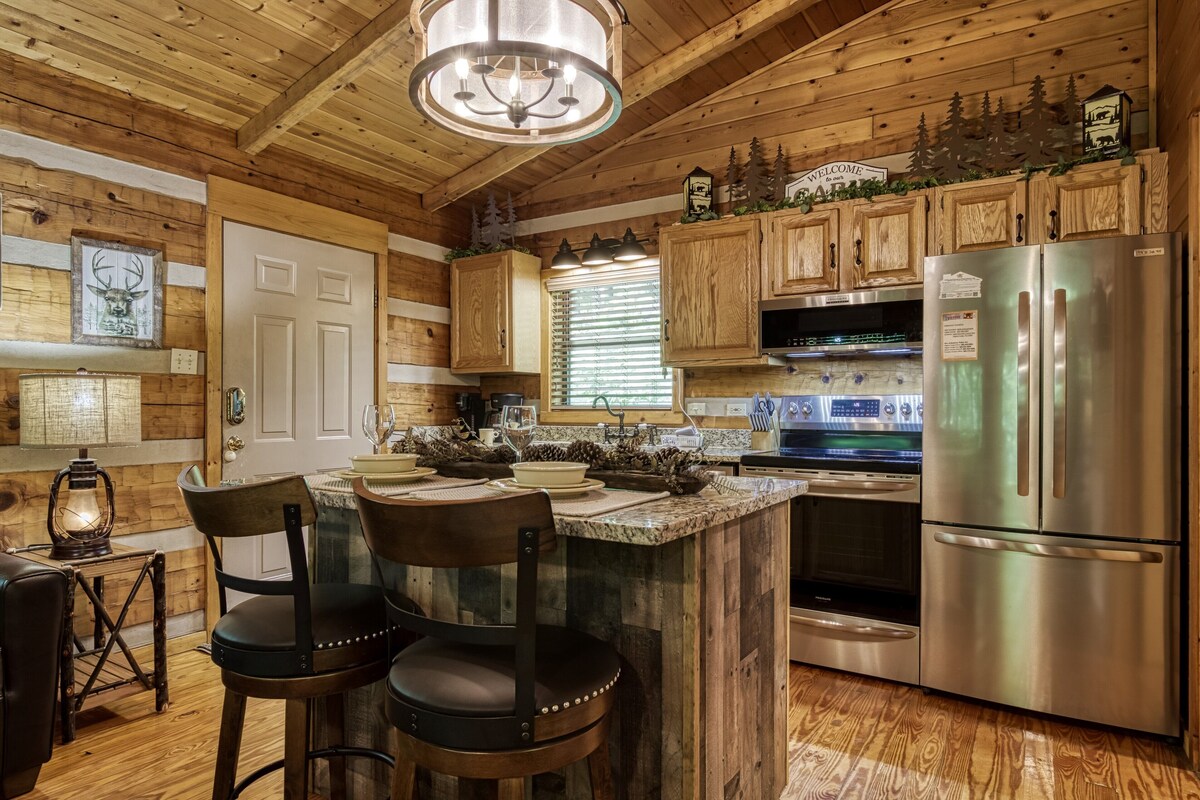 Pigeon Forge Cabin Unforgetable, Unit 920 is located in a secluded resort called Caney Creek Mountain located conveniently to the attractions of Pigeon Forge and Gatlinburg, including being only 6 miles from Dollywood. The resort area offers privacy, hiking trail, stocked fishing pond (no license required), and pavilion (reservations required). This cabin is great for a getaway with its fully equipped kitchen and living room area with flat screen television. This studio cabin has a Queen Size Bed and dual soaking tubs. There is also a gas fireplace! The covered back porch offers a view of the resort's wooded scenery around the hot tub. There is also outside deck furniture to sit and enjoy the wooded scenery. This secluded cabin sleeps 2. No Smoking. Parking for up to 4 vehicles. Dogs welcome. Must weigh 35 pounds or less. Fees apply. Must follow fireside chalets pet policies. Our prices include all fees. No hidden fees.