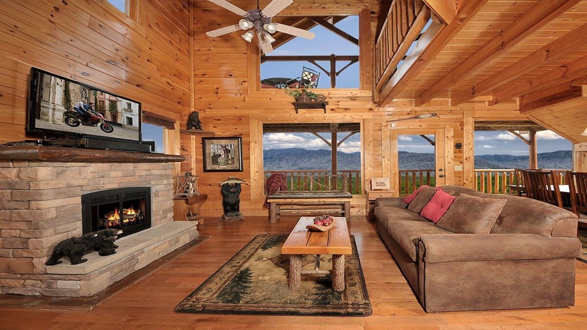 \ is a modern log home in the Great Smoky Mountains! This lavish cabin is located in Legacy Mountain Resort. The resort has wide, paved and well maintained roads. Legacy Mountain Resort cabins are very well built with much attention to details. While at \ you will experience luxuries such as: 1. A Jetted tub 2. Outdoor hot tub 3. Two spacious decks 4. Electric stone fireplace 5. Vaulted cathedral ceilings 6. Tongue and groove walls & ceilings throughout 7. Rustic yet elegant log furniture 8. Floor to ceiling glass windows 9. And in our opinion some of the best views of the Smoky Mountains. The main level features an open floor plan. Enter the cabin into the stunning full galley kitchen where you will be welcomed by stainless steel appliances, cement tile floors and everything you need to prepare your food. The kitchen opens up to the dining area. The handsome dining room table has seating for six. The living room and dining room have beautiful hard wood floors. Enjoy the electric stack stone fireplace in the living room while taking in the Smoky Mountain Vistas. The home is decorated with log style furnishings. The main level has an open floor plan. The living room and dining room look out over the breathtaking views of Mt. LeConte. On this floor is a master suite with its own private bathroom. This bedroom has an incredible view out its windows as well. \ is the first house you come to on the street. It's bedroom windows face east. Wherever you choose to sleep in this cabin, you will awake to a spectacular view. You will be greeted every morning with a beautiful sunrise. Upstairs is a huge open loft bedroom / game room. There is a full bath on this level with a Jetted tub. This bedroom has large glass floor to ceiling windows to enjoy the magnificent Smoky Mountain Views. From here, you can walk out onto the deck where there is a hot tub to soak in after all the day's activities in the Great Smoky Mountains or in Pigeon Forge. The upper level has a small kids loft which is accessed by a ladder. Here they will enjoy their own little sleeping area. There is also a video game area on this level for the children to unwind after all your days activities. \ can accommodate up to 4 adults and up to 4 children for a total of 7 people. There is a fireplace up at the amenities center that you can bring your own wood to and enjoy a fire. There is space for 2 large cars or 3 small cars out front. Come experience everything that \ has to offer. Legacy Mountain Resort has an amenities center with a fireplace. There is no fire pit at the cabin. You are welcome to bring your own wood and have a fire up at the amenities center. The distance to local attractions by the map on VRBO is in miles \ . The owners do ask that you do not lower the temperature of the AC in the summer below 72. There is an additional charge for any adult in your party over 4 adults. There is also a onetime pet fee plus tax per pet per stay. When you check the box that you are bringing a pet, VRBO will only charge you for one pet, please let us know how many pets you will be brining. You will receive your directions and key code email from our property management software about 2 days prior to your stay. Please check your spam folder for emails from us, not VRBO. Our prices include all fees. No hidden fees.