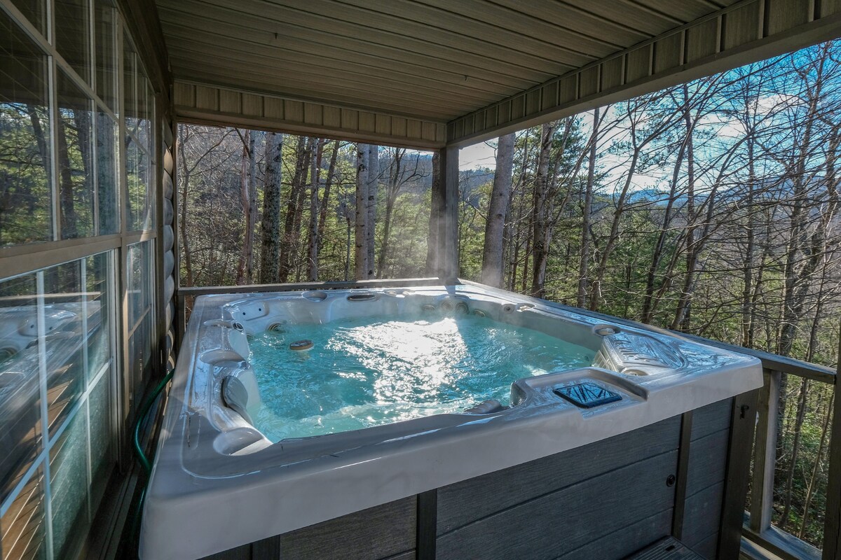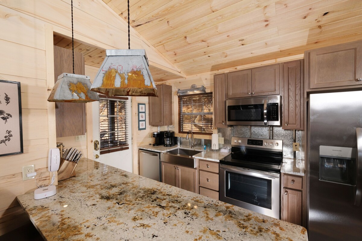 Pigeon Forge cabin The Hidden End, unit 924, is in the Caney Creek Mountain which is just three miles from downtown Pigeon Forge, 6 miles from Dollywood, and offers a privately stocked catch and release fishing pond, hiking trails, fire pit, gazebo, and a private pavilion. This beautifully remodeled two-bedroom two bath cabin comes with everything that you are looking for to create a memorable Smoky Mountain vacation. Entering the cabin, you come into the newly remodeled kitchen which is fully furnished with brand new stainless steel appliances and granite countertops. Just off the kitchen is the living room which offers leather furniture, a 50-inch flat screen TV with DVD player, cocktail style multi-cade machine, and a stone encased wood burning fireplace. The master bedroom offers a king size pillow top bed and a 43-inch flat screen TV. The master bathroom is beautiful with a dual vanity, spa soaking tub, and a spa shower with multiple shower heads including a rain shower feature. The second bedroom also offers a king size bed with a 43-inch flat screen TV, and the second bathroom comes with a spa shower with multiple shower heads with a rain shower head feature. If everything inside is not enough, you can step out on to the large front deck that offers 5 rocking chairs, a swing, a 50” flat screen TV, and a hot tub work you can sit back and soak your worries from the day away, all while taking in the beautiful views of the Smoky Mountains. The Hidden End is the perfect cabin to get away and escape to the Great Smoky Mountains. Dogs are welcome by must be under 35lbs and additional fees apply and must follow Fireside Chalets pet policies. Parking for 2 vehicles. No Smoking. Sleeps 4. Our prices include all fees. No hidden fees.