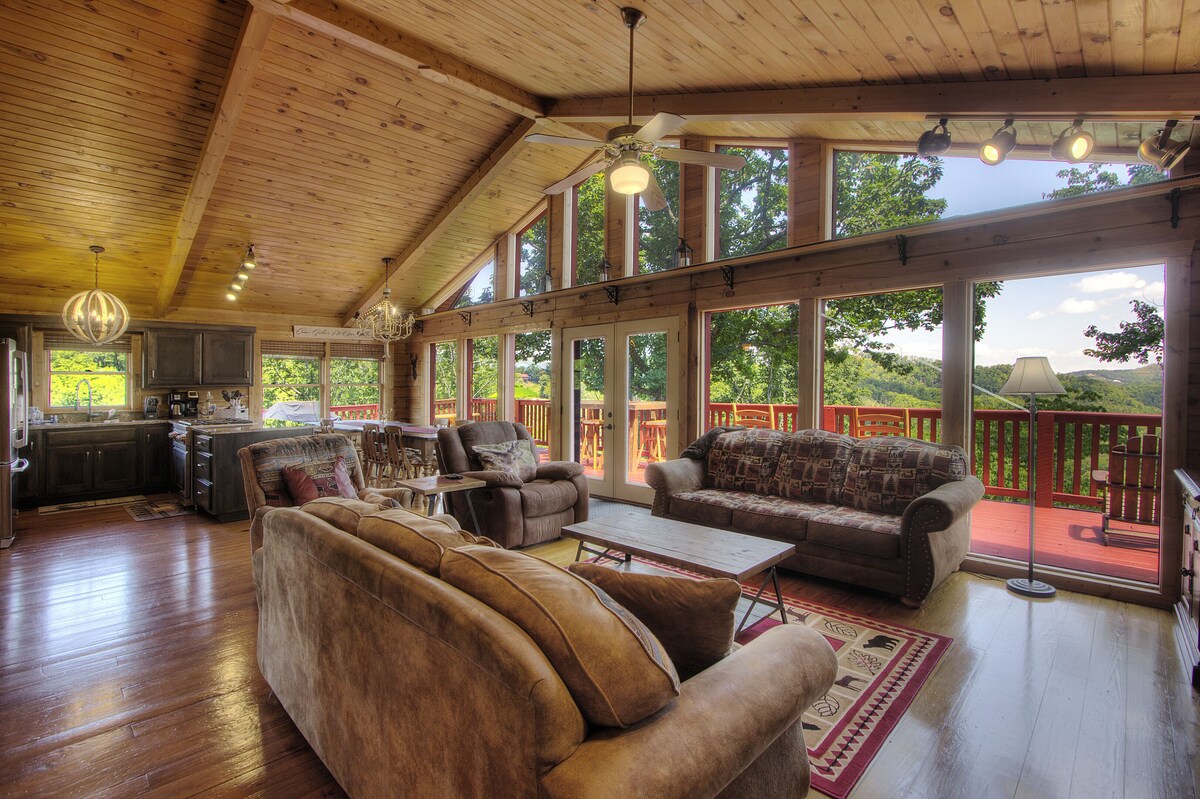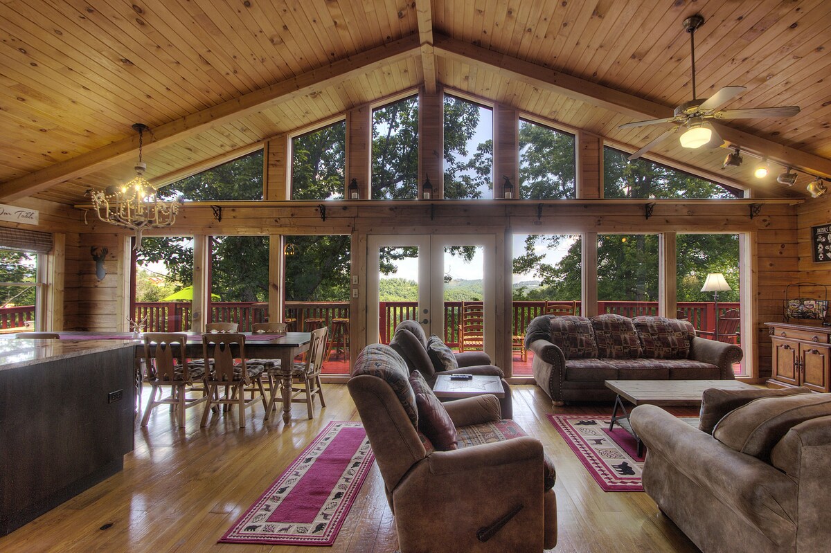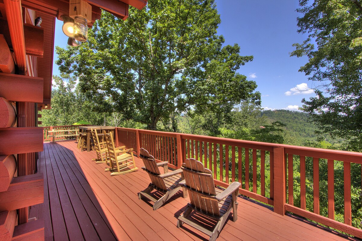 Woodhaven Retreat is a spacious 4 bedroom, 3 bath genuine log cabin that comfortably sleeps 14. At 2200 sq ft and located just 5 miles from the Pigeon Forge Parkway, it's ideal for a group of family or friends looking for a mountain getaway. With easy-access streets and no steep, mountain roads, Woodhaven Retreat provides you with plenty of level parking and a flat, wheelchair-accessible entry straight into the cabin. An entire wall of windows and high-vaulted ceilings fill the cabin with natural light and the open-floor plan across the main level allows everyone to be part of the conversation and enjoy the stone gas fireplace. The kitchen is well-equipped, has a gas stove top, granite counters, and a large pantry with plenty of storage for any groceries or items during your stay. Our large dining room tables provide plenty of seating for your group. There are two bedrooms with king beds and private bathrooms on the main floor. Each is equipped with a ceiling fan and flat-screen TV. One bedroom has a walk in shower. Head downstairs to challenge your friends and family on a pool table, air hockey, foosball, board games, or on some retro arcade games like Rampage. You can also draw the curtains to watch a movie, sports game, or favorite show on the easy-to-use 100 inch projection screen connected to Roku. Or relax and take a dip in our 7-person hot tub with great views. On the lower level there is a 3rd bedroom with a queen bed and twin bunk bed with a flat screen TV and 4th room with a bunk bed and flat screen TV. There is also a large bathroom with shower and tub. You can have a seat on our rocking chairs and enjoy the views on our wrap around deck and the blooming dogwoods in the spring. Located just 5 miles from the Pigeon Forge Parkway, Woodhaven Retreat provides a convenient location close to Pigeon Forge, Dollywood and Splash Country, the Island, and Gatlinburg. For our guests who also come for the beauty of the Great Smokies, Woodhaven Retreat is located just 10 minutes from the National Park. We invite you to come spend your getaway in our comfortable home that offers modern conveniences and decor, but enough privacy to remind you that you're at the heart of the Smokies with that authentic log cabin feel. We invite you to come spend your getaway at Woodhaven Retreat. We decorate for Christmas!! Pet fee is per pet and maximum of 2. Our prices include all fees. No hidden fees.