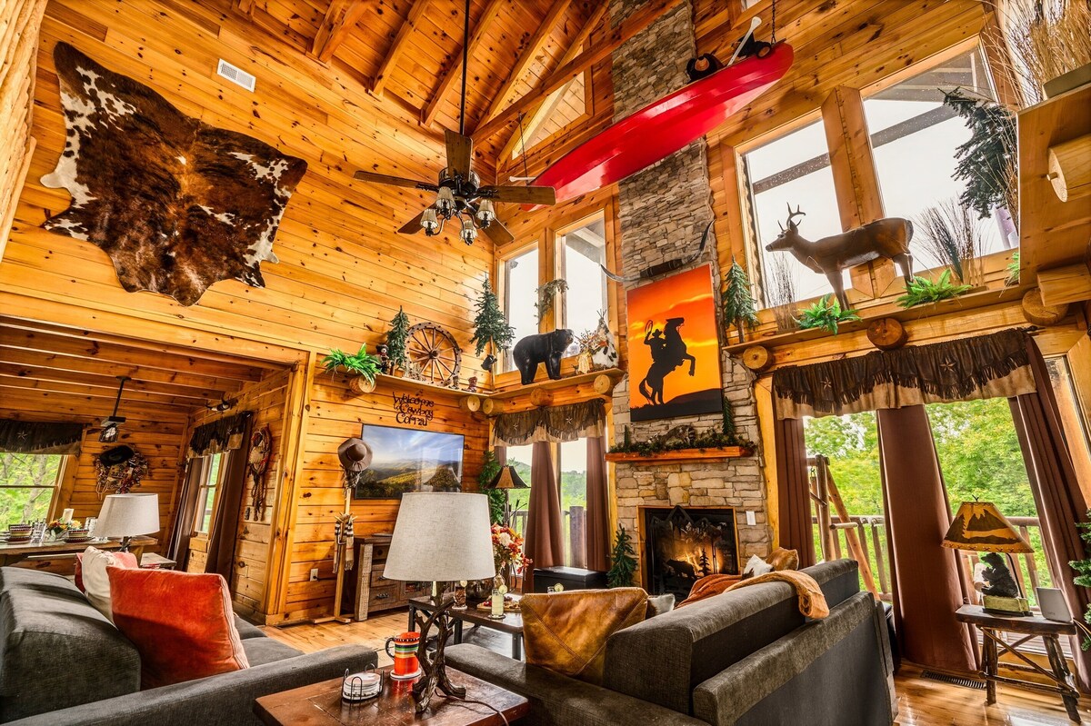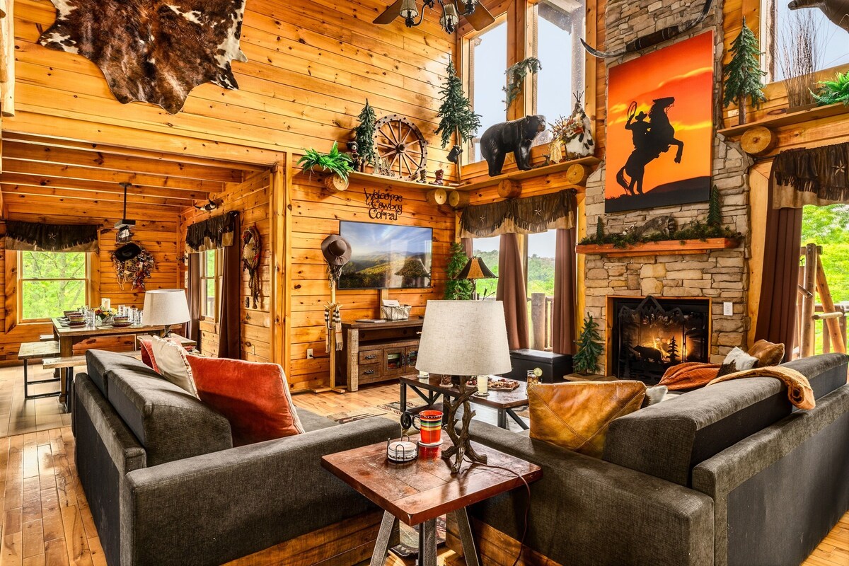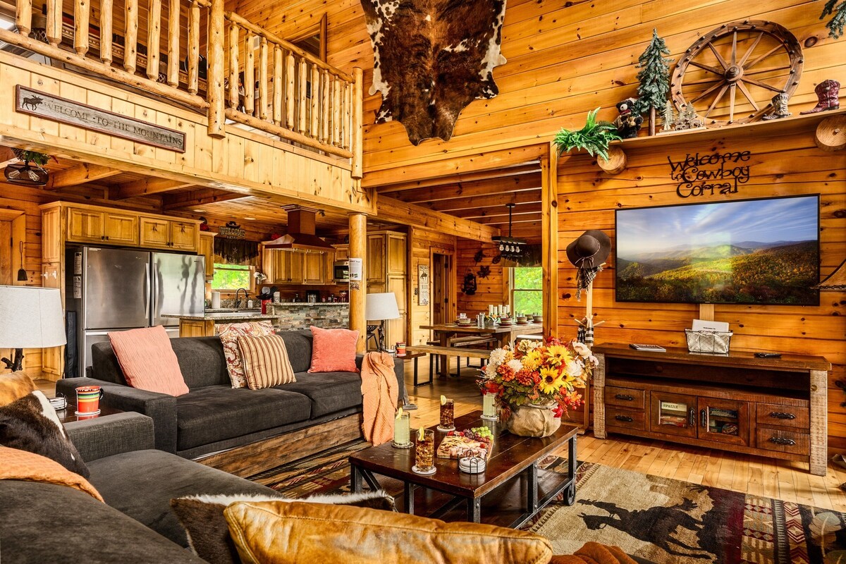 WELCOME TO COWBOY CORRAL! NOW DOG FRIENDLY!* NOW WITH 4 KING SUITES, EACH WITH PRIVATE BATHROOM AND TV. This is premium cabin with beautiful finishes. We've put great care into providing all that you might need, and we don't allow parties or events. Thank you for your understanding. Saddle up your horses in your own private Western-Cowboy Themed Cabin just 12 minutes from Pigeon Forge! This beautiful, redecorated/remodeled 4-1/2 bedroom cabin, over 3462 square feet, 3/4 of an acre of land, 5 decks boasting over 2400 square feet of space, FOUR KING suites, one adorable bunk area, and one \ bunk bed area for the most adventurous of the bunch! This cabin features all the bells and whistles and features SIX full bathrooms, a stacked stone fireplace, hot tub, theater with 150 inch screen, and 10 leather recliners, a fully remodeled kitchen with TWO refrigerators, TWO dishwashers, a 5 burner stainless \ gas range and oven, granite counters, copper sink, and beautiful maple cabinets. *DOG INFORMATION: Up to two kennel trained dogs allowed, maximum weight 50 lbs. 150 pet fee, non refundable. No cats or other animals allowed. YOU AGREE TO KEEP DOGS IN KENNEL IF YOU LEAVE THE PROPERTY. Note - there is no fenced yard. Dogs must be kept on leash when outside. BE SURE AND TAKE A LOOK AT OUR FLOORPLAN DRAWINGS IN THE PHOTOS, THEY WILL GIVE YOU A BETTER IDEA OF THE LAYOUT! . LOCATION: We are located in a community called \ . It is between Wear's Valley and Pigeon Forge, just off Little Cove Rd., No crazy roads, or drop offs to reach our cabin. Easy drive on paved roads. There is one hill to get into our community with a tight turn, but that's it, and there is plenty of room to back up if you need. No scary roads! . PARKING: Our driveway is approximately 30 feet by 40 feet and can hold about 4-6 cars depending on size. . -10-12 minutes from Pigeon Forge (5 miles to the parkway) - 25 minutes from Gatlinburg - 13 minutes from the nearest entrance to the Great Smoky Mountains National Park - 20 minutes from Dollywood - 15 minutes to Publix or Koger in Pigeon Forge - 40 minutes from Douglas Lake - 55 minutes from Knoxville Airport . **TOP AMENITIES** - Up to two kennel trained dogs allowed, maximum weight 50 lbs. 150 pet fee, non refundable. No cats or other animals allowed. YOU AGREE TO KEEP DOGS IN KENNEL IF YOU LEAVE THE PROPERTY. Note- no fenced yard. - 4 KING BEDROOMS, EACH WITH ATTACHED FULL BATH - 6 FULL BATHROOMS! - WESTERN THEME THROUGHOUT - REMODELED KITCHEN WITH TWO DISHWASHERS, TWO REFRIGERATORS AND PROFESSIONAL GAS STOVE - ONLY 10 MINUTES TO PIGEON FORGE - DRAMATIC LIVING ROOM WITH 20+ FOOT FIREPLACE, CANOE AND LOFT - OVER 2400 SQUARE FEET OF COVERED DECKING WITH MANY SITTING AREAS - CUTE GAS FIREPIT TABLE WITH VIEWS - VERY FAST AND RELIABLE INTERNET, ROKU TV'S IN EVERY BEDROOM, THEATER AND LIVING ROOM . BEDROOMS: (SEE FLOORPLAN LAYOUT IN PHOTO SECTION) 5 bedrooms, each with it's own theme! FOUR KING BEDROOMS FEATURE PRIVATE ATTACHED BATHS, a flat screen TV, ALL MATTRESSES have been recently replaced. Some are comfortable memory foam, and some are nice quality standard mattresses. ALL BEDDING, pillows, blankets, sheets, etc. is premium quality. All bedding, towels, and linens are included! - BEDROOM 1: LONGHORN BEDROOM: Main level, King bed, TV private attached full bathroom with a Longhorn Cattle theme -BEDROOM 2: BUFFALO BEDROOM: Upstairs, King bed, TV, private attached full bathroom, vaulted ceilings, access to deck, with a buffalo theme -BEDROOM 3: HORSIN' AROUND BEDROOM: Upstairs, King bed, TV, private attached full bathroom, vaulted ceilings, access to deck with a horse theme -BEDROOM 4: OUTLAW BEDROOM Basement, adjacent to game/theater area, King bed, TV, private attached full bath. -SMALL ALCOVE AREA 5: BUNKHOUSE: Not an actual bedroom, but a small alcove just of the game area, housing a twin log bunk bed, only for your most adventurous small kids! . OTHER SLEEPING AREAS: -DOUBLE SIZE BUNK \ BUNK BED IN THE GAME THEATER AREA super cute double bunk beds in a custom made CABIN THEMED BED. FULL BATHROOM ADJACENT TO THEATER AREA. -TWO TWIN WEST ELM MARRIOTT DAYBEDS, WITH TWIN TRUNDLE'S Located in the living room. FULL BATHROOM ADJACENT TO THE KITCHEN. KITCHEN: This beautiful kitchen was remodeled in recently. You will find a fully equipped kitchen, with new dishes, glassware, pots, pans, Keurig coffee machine, regular coffee machine, coffee grinder, crock pot, blender, all the utensils you need, and much more! You will have the luxury of TWO refrigerators with ice makers, TWO almost new dishwashers, and a 5 burner stainless steel gas stove and oven. There is seating for 6 at the multi level granite counters, seating for 10 at the large dining table, and seating for 6 more at the smaller dining table just adjacent to the kitchen. GAME ROOM: There is a large game room in the basement featuring a projection screen theater, 150 inch screen, and 10 new leather recliners. The second row is on a riser. We feature a ROKU system on all TVs, which offers hundreds of apps that allow you to sign on with your subscription and watch all your favorites. If you don't feel like a movie, try your hand at an air hockey game, or arcade game! The hot tub is right outside if you want to relax. GRILL: We have a new (2020) large charcoal grill out front. WIFI: We have great, fast internet, ROKU SYSTEM on all TV's, no need for cable with all of the apps you can use! PARKING: DRIVEWAY IS APPROXIMATELY 30X40' and holds 4 cars/trucks. . **RESERVATION REQUIREMENTS** 50% due at time of booking, remaining balance due 30 days prior to arrival and will be automatically charged to your credit card on file on the due date. Minimum age of primary renter: 25 Maximum guests 18 (including up to 12 children or infants) Non-Smoking cabin - smoking is allowed outside with windows closed. Up to two kennel trained dogs allowed, maximum weight 50 lbs. 150 pet fee, non refundable. No cats or other animals allowed. YOU AGREE TO KEEP DOG