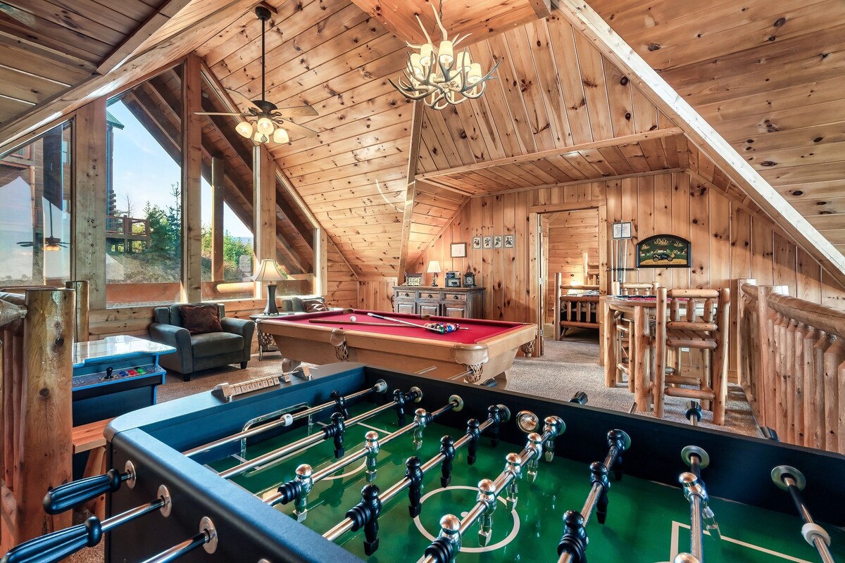STOP, LOOK NO FURTHER! Why book with us: 8-Bed Luxury Cabin. Only minutes to the heart of Pigeon Forge and Gatlinburg. Stunning long-range views from every deck! 4 Master en-suites! 2 Floors with lots of entertainment! Let the fun begin! This impressive 8 private-bedroom log cabin is the perfect getaway for the extended family, group of friends, couple retreats, church groups, wedding parties, or business retreats. 4 King bedrooms, each with private en-suite bathrooms. 2 of them with twin pull out sofas. (Memory foam mattresses) and 2 of them with daybeds/sofas with two twin beds with trundles (Memory foam mattresses). Ideal for kids or teens or simply relax. 3 Queen bedrooms, 1 two twin bunk beds bedroom and one queen sleeper sofa in the living room will give everyone privacy. Open concept Living/ dining and kitchen on the main floor. 2 Game rooms, Pool table, multiple arcades, foosball table, air hockey table combined with movie room with comfortable seating!!! its like having 3 living rooms!! Top and bottom floor each feature a game room. *You communicate directly with the owners. We have intimate knowledge of the cabin, community, the area, and their attractions*. As you enter you will be dazzled by the open floor plans of the living spaces. The stunning open high vaulted ceilings of this 3-story cabin showcase spectacular views. Each floor has its own living room with plenty of seating, perfect to gather or spreading out and if needed to a quiet corner to wind down and enjoy a fabulous book. All decks have plenty of seating to enjoy the morning coffee or evening beverage while enjoying spectacular sunset views. The stone fireplace, panoramic windows, well equipped Kitchen with granite counters and tasteful décor invite everyone for a good time. Conveniently located just an easy 3 mile drive from the Pigeon Forge Parkway. The beautiful resort's swimming pool opens from April 1 to September 30 (weather permitting) just 2-3 min walk from the cabin! Whether you relax in your very own private hot tub with a spectacular view or challenge your friends to a game of pool, Foosball or arcade games this Pigeon Forge cabin rental has it all and more. Washer and Dryer are available in the laundry room. Enjoy the endless views of the Great Smoky Mountain National Park from the seemingly endless decks or venture into town and enjoy all of the attractions Pigeon Forge, Gatlinburg, and the surrounding areas have to offer. Spend the day at Dollywood, or take the kids to Wonderworks, no matter what you do, you are close to the action. Experience the beauty of the Great Smoky Mountains National Park just minutes away! Additional amenities include: Home theater-like living/gamer room w/81\ inch streaming HDTV, Foosball table and arcade game. • 1 Bedroom with two twin bunk beds and • 3 Queen Bedrooms with log beds • 2 full shared bathrooms with shower/tub combination are available on this deck • Laundry Room, There is a stack-able washer & dryer set up for your convenience on this level. Decks Overall • The decks provide majestic mountain views while rocking away in the rocking chairs as you enjoy a cup of coffee to start the day or unwind from an outdoor adventure. • One charcoal grill is located in front of the cabin. Fire them up to enjoy your favorite barbecue with view of the National Parks beautiful forest/ rolling hills and Mountains. Property Amenity Details: • 9 HDTVs, with streaming channels plus1 85\ ,