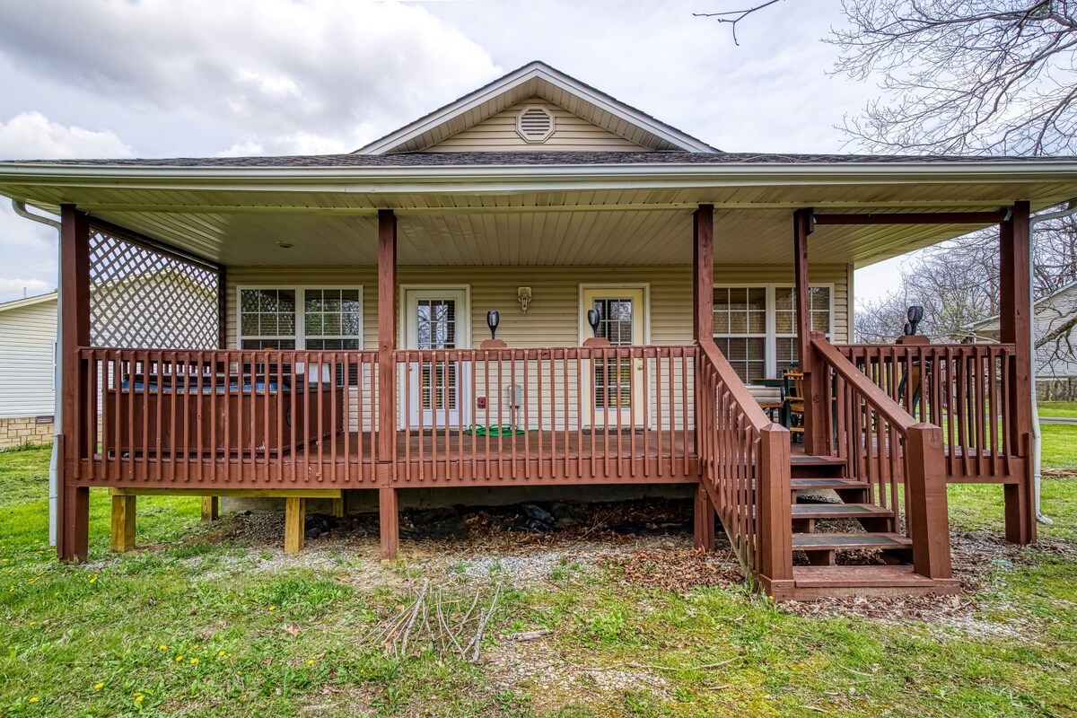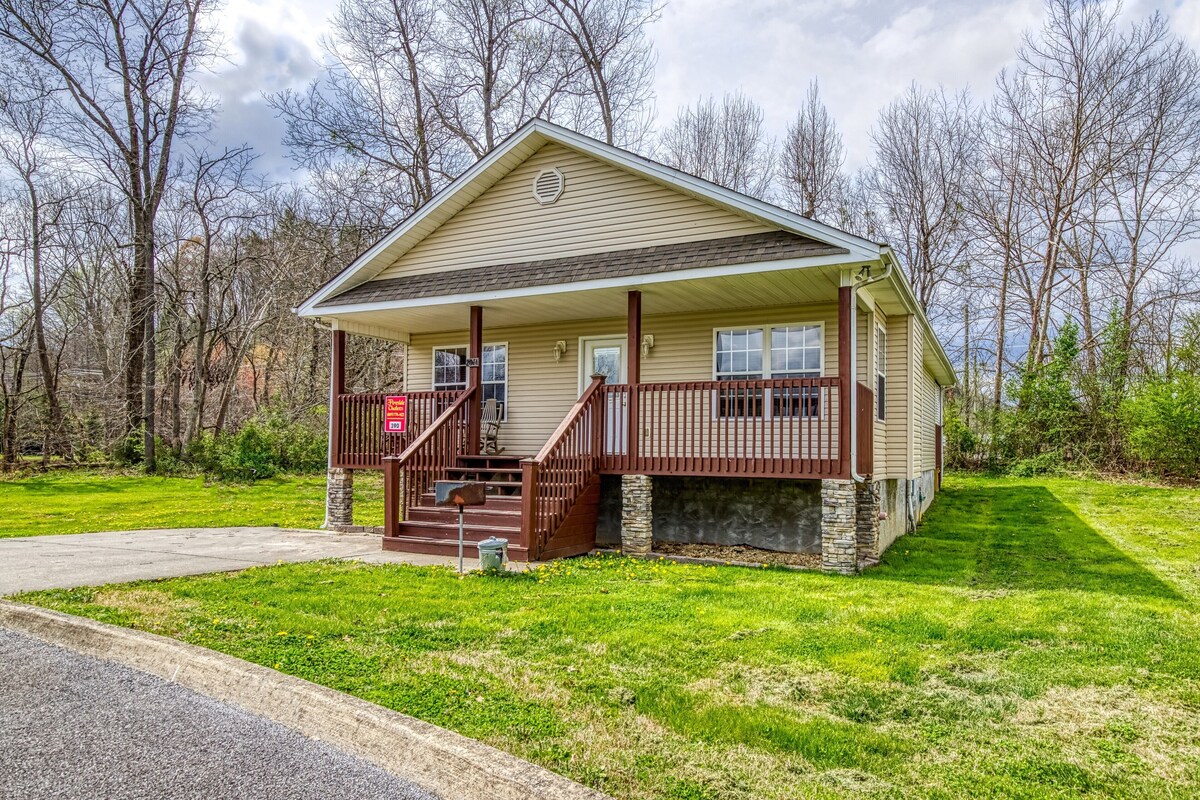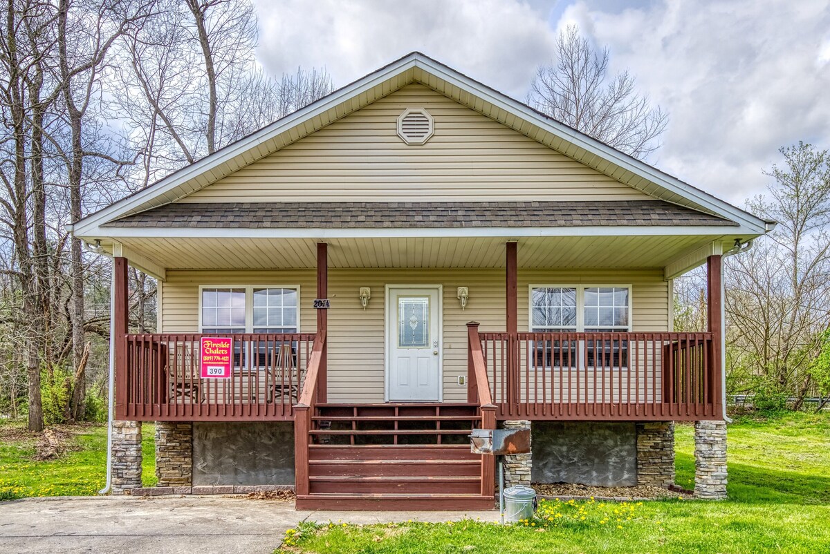 Pigeon Forge Chalet Unit 390-Lee's Creekside is located right on the creek. This is a 3 Bedroom and 2 bathroom one story chalet. The roads are all level driving to the cabin and is only 3 miles from down town Pigeon Forge and just 8 miles from Dollywood. There is a front covered porch area with only 7 steps getting in the chalet. Upon entry you will have a living room with a pull out sofa sleeper, chair, year round electric fireplace, and 40 inch flat screen tv. Lee's Creekside is an open floor plan with dining room area with a table that seats 6 people and bar area with 2 bar stools. The kitchen is fully equipped with dishwasher, toaster, range, refrigerator and microwave. The master bedroom comes with a king size bed and the other 2 bedrooms have queen size beds. One bedroom has an on suite bathroom with a Whirlpool/shower tub. There is another bathroom located off of the hall with tub/shower combo. Two of the bedrooms lead to the back covered deck area facing the creek. There is a hot tub and table with 4 chairs on the back covered porch. What a great place to relax reading a book and enjoying the creek sound and view. Would you like to go fishing while you are in town or go swimming? Lee's Creekside has access to Honeysuckle Meadows seasonal outdoor swimming pool, deli, and year round outdoor fishing access. The pool is located about 8 miles from the cabin. Lee's Creekside cabin offers wireless internet is Non Smoking. There is a charcoal grill to enjoy. This cabin is motorcycle friendly. Dogs are welcome but must be under 35 lbs and additional fees apply and must follow Fireside Chalets pet policies. Parking for up to 2 vehicles. Non-Smoking. Sleeps 8. Our prices include all fees. No hidden fees.