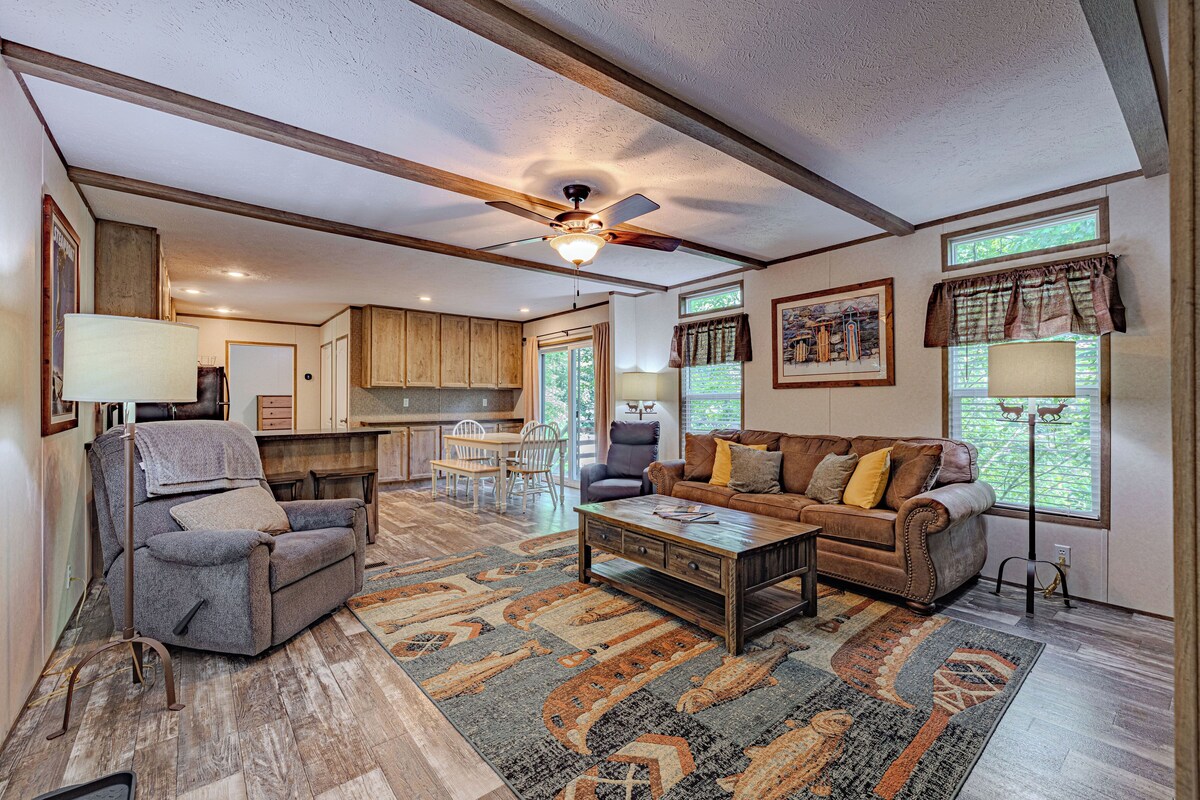 Bear Pause is a two-bedroom, two bath cabin that has a KING size bed in each room and the living room has a queen-size pull-out couch. You can make your way to the porch through a large sliding glass door that offers views overlooking the forest. This home is very well equipped, secluded and is a relaxing place to stay that is very close to everything Pigeon Forge has to offer.