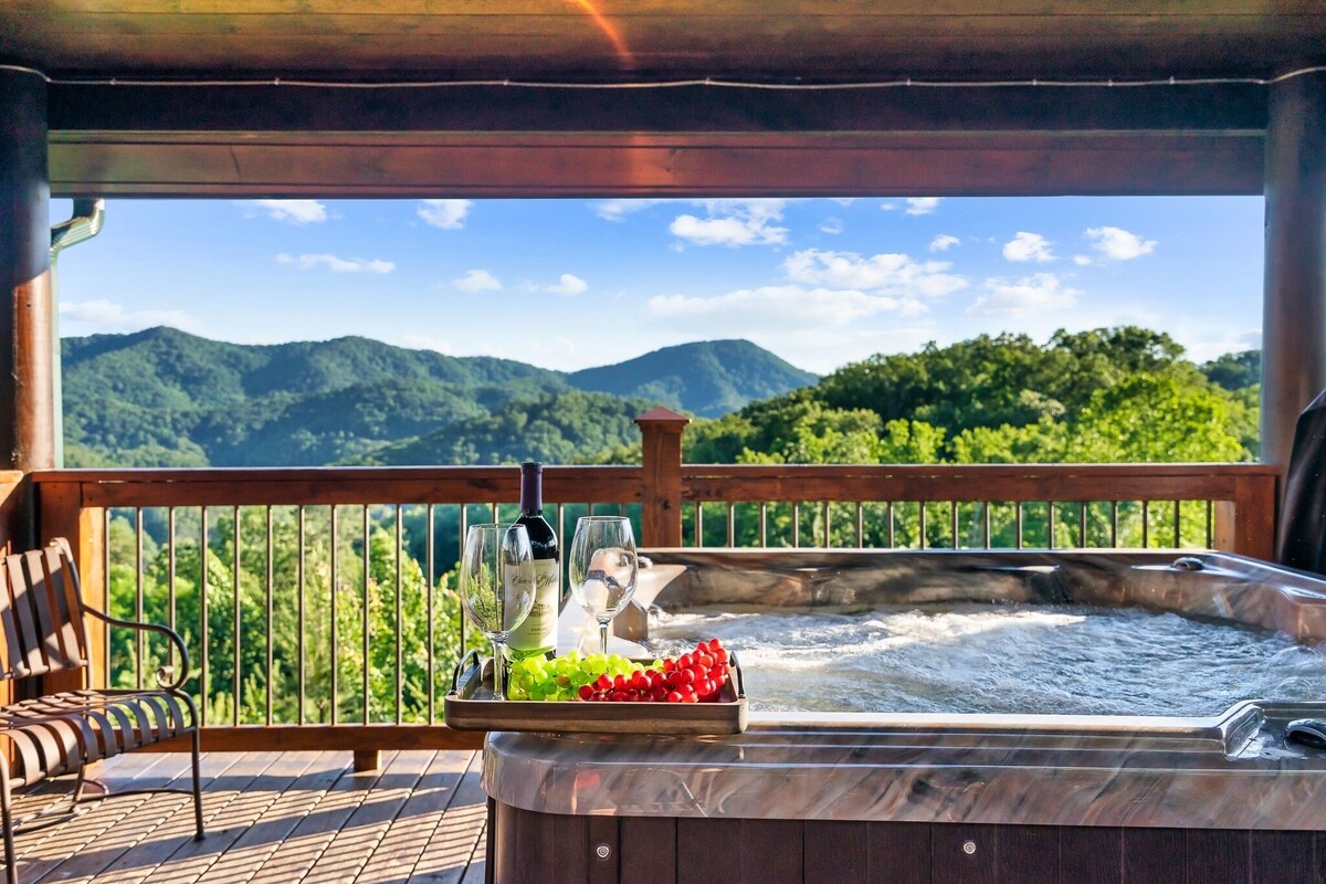 Perched amongst the clouds overlooking cove mountain valley below, Summit's Peak is the Wears Valley retreat you’ve been yearning for... Relax in the Swedish style SAUNA. Soak in the covered HOT TUB overlooking miles of mountain skylines. Behold both stunning SUNSETS and SUNRISES from the full length deck perched above the valley below. Enjoy the company of good friends and family with the POOL TABLE, AIR HOCKEY, and CARD TABLE. Cozy up in front of the GAS FIREPLACE in the Great Room with cathedral ceilings and hand-carved timber beams, all with miles and miles of views before you. Entertain your guests and family at the banquet style dining table, or for a simple breakfast at the island counter with bar seating from our well STOCKED kitchen with utensils, dinnerware, pots and pans, drip coffee maker, Keurig machine, and pantry basics. Or, enjoy al fresco dining with the CHARGOAL GRILL and picnic tables on the front patio. In the evening, retire to the 4 bedroom suites with KING beds and each with attached private bathrooms, or the 2 brand new sofa queen sleepers—there's a place for everyone. Unwind with our board games stash, catch a movie or the game on one of the 6 Satellite TVs (in each bedroom & living room), connect via Wi-Fi, or enjoy a night cap on the porch furniture or lounge in the hot tub while gazing across the starlit sky. **Great news! We recently upgraded our WiFi internet to a new provider -- you can now connect, stream, and browse from multiple devices up to 50mbps!** Our prices include all fees. No hidden fees.