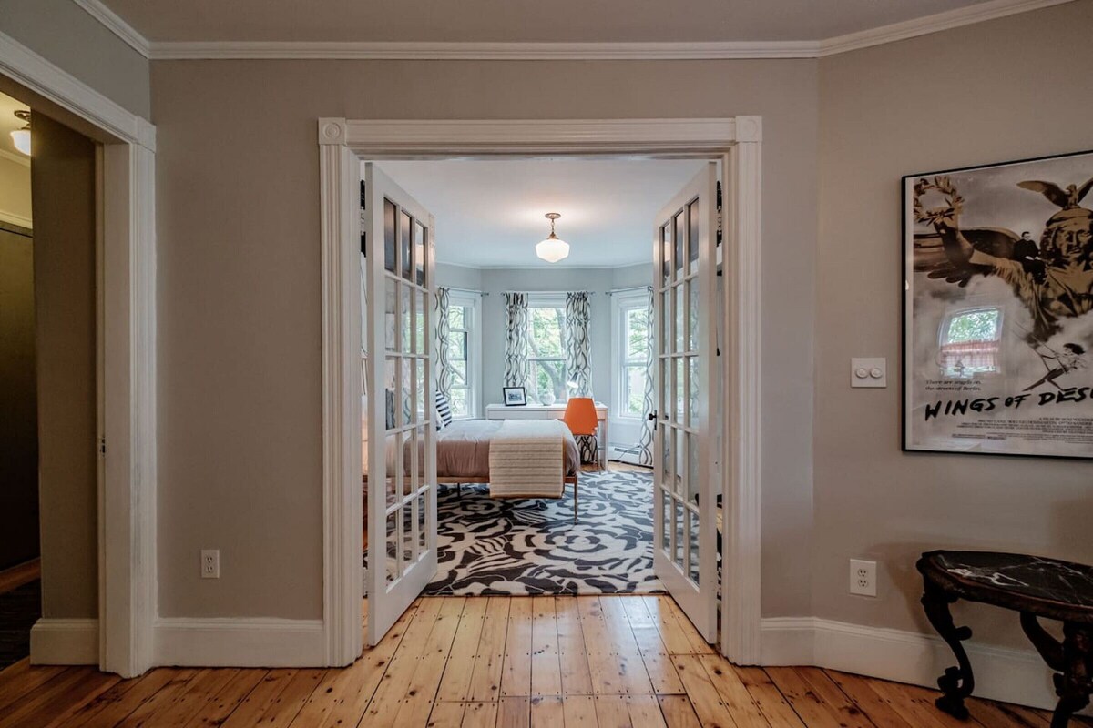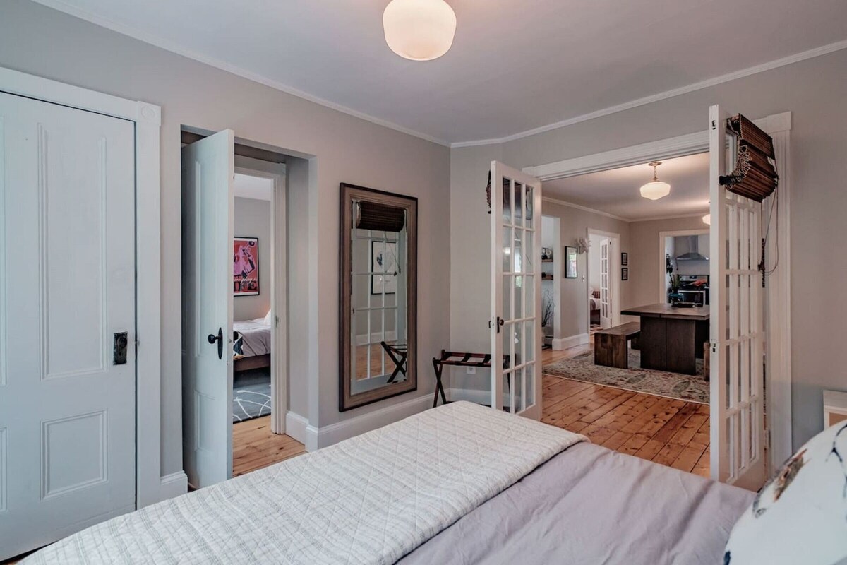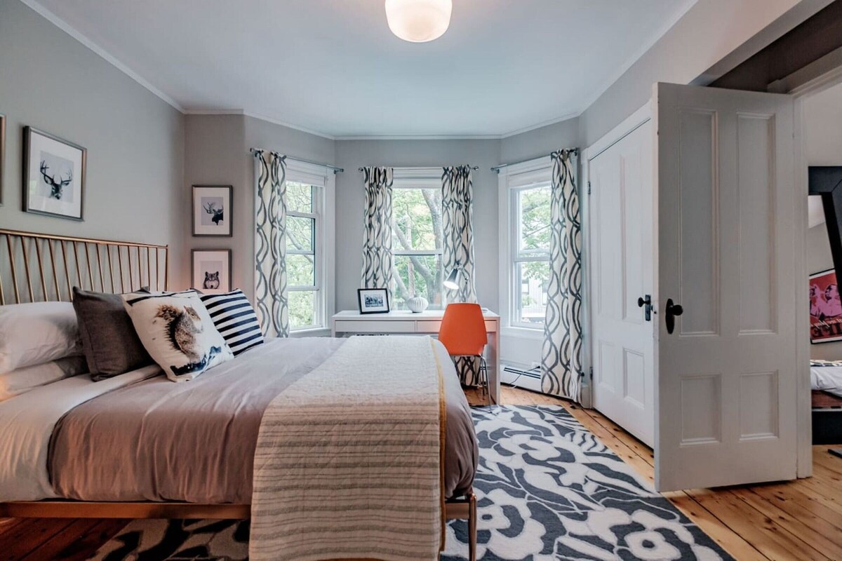 Registration #2018-4090. Walk everywhere from the SWEET! This huge, beautifully furnished space w/4 full bedrooms, plus a daybed room. Relax in the comfy leather furniture & stream movies on the 50` smart TV, gather round the big farm house table, sip coffee in our sunny yellow orb chairs...take a bath in the original claw foot tub...it`s both incredibly spacious and cozy. Luxurious beds w/lots of pillows, quilts & duvets. **Groups must agree to House Rules before booking will be confirmed. The style is very Maine...a mix of original, and new, with a sense of humor and a sense of history and place. Antiques mingle with brand new furniture, the bathroom still has original clawfoot tub but beautiful updated fixtures. We love design that`s playful and has purpose, and we love to mix things up. You`ll see pipes for hooks, a tool chest on wheels for a kitchen cabinet, open shelves and baskets for your clothes...wire baskets for your shower essentials...and we love mixing patterns in a very visually interesting way. Guests have access to all of the space, the entire second floor of the building. Four bedrooms plus a daybed room, brand new kitchen with gas stove, big farm house table for dinners in, lots and lots of windows looking onto leafy trees...oh and of course a new 50` smart TV for those rainy stay-in nights. I`m just around the corner at my other building at 70 Waterville Street. I own and operate two pet supply boutiques..one here in Portland, and one on Newbury Street in Boston...so sometimes I`m in Boston but I`m always just a message away. I grew up in the restaurant world and used to own my own restaurant here in Portland, so to me, hosting is really fun and comes naturally. One of the things I love most about it is sharing what I love about Portland so feel free to ask for more suggestions (there are lots in the listing, but it only gets updated from time to time) There are two window AC units, one in the bedroom with the brass bed, and the other in the living room. Fans are also provided. Our prices include all fees. No hidden fees.