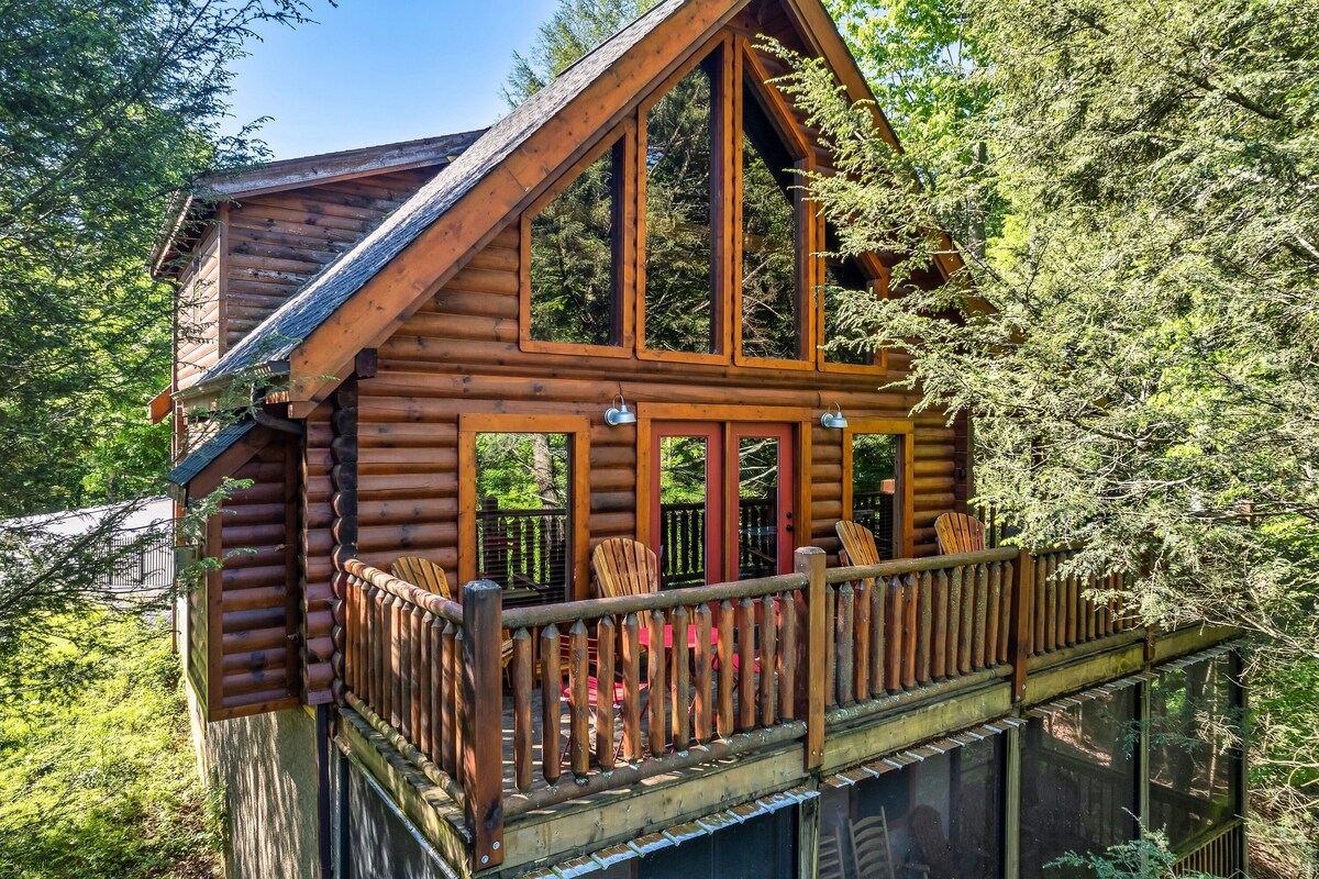 - LOCATION! centrally located in Pigeon Forge! - 2 min drive to Pigeon Forge Parkway - 8 min drive to Dollywood - Hot tub - Community pool - Game Room w/ billiard table & arcade games - 4 bedrooms / 4 bathrooms - Sleeps up to 14 guests - Pet friendly (up to 3 dogs) - Located within the renowned Brookstone Village Resort w/community pool. - Parking for 3+ vehicles - Paved roads / No winding roads - Fully equipped & stocked kitchen - All TV’s with 125+ channels and High Speed WIFI \ is a Luxury 2,200 sq' log Cabin located in the beautiful Brookstone Village Resort with access to a community pool. ★ BEDROOMS ★ This three-story cabin accommodates up to 14 guests. Main Level: - 1 Master bedroom with a King size bed & an in-suite bathroom (sleeps 2). - The living room can turn into a sleeping space with the Queen sofa bed (sleeps 2). Lower Level: - 1 bedroom with a King size bed and a full bathroom (sleeps 2). Upper Level: - 1 bedroom with a Queen size bunk bed (sleeps 4) and an in-suite bathroom. - 1 bedroom with a Full size bunk bed (sleeps 4) and a bathroom. ★ KITCHEN ★ The kitchen is equipped with all the cookware, cutlery, and appliances you need to prepare delicious meals during your stay. Refrigerator, stove, microwave, dishwasher, toaster, blender, tea kettle, Crockpot, Keurig Duo with carafe & single serve pod coffee maker. The dining table comfortably seats eight, and there are four additional stools at the large kitchen island so everyone in your group can enjoy meals together. ★ OUTDOOR GRILL ★ There is a private Gas Grill. We provide the Gas. ★ OUTDOOR SPACE ★ After a day of hiking and sightseeing, you have a lot of options to chill: *soak in the private hot tub *kick back in the rocking chairs and enjoy the fresh mountain breeze *take a dip in the pool. Community pool is only 2 min walking distance (open May-September). ★ GAME ROOM ★ All ages will fall in love with this fun space! The room has a billiard table, an arcade game, a lounge area with a large TV where you can watch your favorite shows/games. There is also an assortment of board game & an Xbox. ★ PETS ★ We are a pet friendly cabin and you can bring up to 3 dogs as long as they are house broken/potty trained. We welcome all breeds of dogs and have no restrictions on weight. The pet fee is $150 per stay for up to 3 dogs (the fee is not per dog). ★ INTERNET/CABLE ★ High Speed Wireless Internet Smart TVs in the living room/game room as well as in each bedrooms. ★ LAUNDRY ★ Full size washer and dryer. ★ AMENITIES ★ Our cleaning service provides start-up supplies including: paper towels, dish soap, dish washer soap, kitchen trash can liners, toilet paper, hand soap and bathroom trash liners. Depending on the length of your stay, you may need to purchase additional items when the initial supply runs out. ★ PRIVATE PARKING ★ Flat parking for up to 3 vehicles in the driveway. ★ ENTRY ★ The front door is equipped with an electronic keypad, we will send a personalized door code. ★ SMOKING ★ No Smoking indoors. You can smoke on the decks though. We will always strive to obtain a 5-star ★★★★★ review from all our guest and can’t wait to host your next holidays and make them UNFORGETTABLE! *** Please favorite the property by clicking \ or \ in the upper right-hand corner, this will help you find it again and share with others *** Our prices include all fees. No hidden fees.