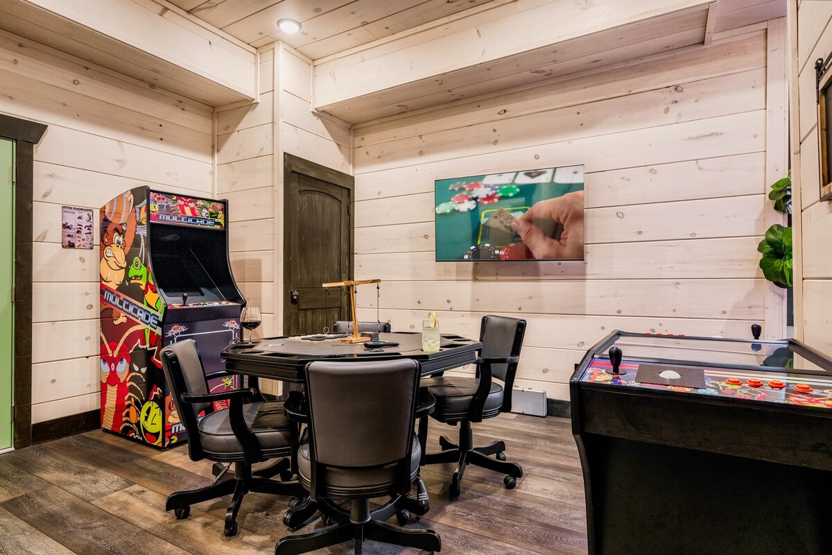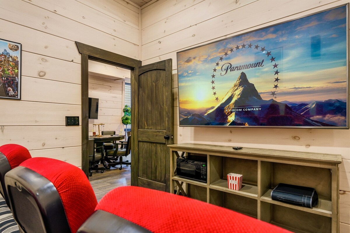 Fall Break | Mountain Views 🌄 | Hot Tub 🛁 | Heated Indoor Pool |5 Bedrooms 🛏 | Theater Room 🎬 | Game Room 🎮 | Location 📍 | Paved Roads 🛣 | SIX Vehicle Parking 🚗 | High-Speed Wi-Fi 📶 | Smart TV 📺 Key Features LIVING ROOM ● 65\ LG Smart TV 📺 with LG live stations & streaming TV (bring own passwords 🔑), theater seats for EIGHT 🎟 (+ pouf seating 🛋) ● Microwave 🍿 for popcorn/movie nights 🎥 ● Game room 🎮 w/ stand-up arcade game 🕹 + seated arcade games 🎮, Boss-toss 🏐, and poker/card table ♠ ● Indoor heated pool with fountain ● Hot tub 🛁 ● 2 covered decks ● Mountain views 🏞 KITCHEN + DINING ● Open-plan kitchen 🍽 w/ eating peninsula 🍳 ● Refrigerator 🧊 ● Smooth-top range/oven 🍕 ● Dishwasher 🍽 ● Microwave 🍿 ● Dining room table for 8-10 🍴 + counter stools for 4 🍽 ● Park-style charcoal grill outdoors 🍖 (bring own charcoal 🔥) ● Dual coffee pot (brew/Keurig) ☕ OTHER KEY FEATURES: ● Parking: Flat parking space for 6 cars 🚗, depending on vehicle size ● Laundry: Stackable washer + dryer 🧺 ● High-speed internet: 🌐 ARRIVAL ● Plan on arriving at the cabin during daylight if at all possible to make navigating and finding the cabin easier. Cabin access via a smart lock (4 digit code). Code and directions will be sent 24 hours prior to check-in. Must notify the host in advance if planning arrival after 9PM. RENTAL AGREEMENT ● The Guest must sign our rental agreement, provide ID, and provide a credit card for a security deposit hold within 24 hours of booking or booking may be canceled. Access code to the home will not be granted until these items have all been provided. In booking this home you agree to such all house rules noted in this listing as well as the rental agreement. PROPERTY USAGE ● Use all furniture, appliances, home goods as intended • no parties or large events •no pets or animals allowed onsite without prior permission/paid stay for pet • no smoking/vaping • no illegal uses allowed • no drugs allowed • no fireworks allowed • no firearms allowed on premises ● No open flames, including candles MAXIMUM CAPACITY ● Up to 13 people, including children may use the cabin at any given time. Infant in crib/pack-n-play excluded from this number. MINIMUM AGE ● Must be 25+ years to book this cabin. Person who books cabin must remain present throughout the rental period. Minimum of 1 person 25 years of age per 6 persons in each group. TRASH ● Do not leave any food and trash on the outdoor porch and decks because bears and other critters may get into it and cause damage or harm to your party. Dispose of all trash in the bear-proof receptacle located at the far side of the parking area in front of the cabin. Do not let trash overflow PERSONAL SUPPLIES ● While we strive to offer a few basic amenities to get you off on the right foot, these are not meant to last the duration of your stay. Please expect that you may need additional toilet paper, paper towels, dish soap, coffee, etc. Please bring your own personal toiletries, condiments, favorite oils + spices, ziplock bags, plastic wrap, aluminum foil, etc. BUGS, BEARS, CRITTERS, and WILDLIFE ● Please be aware that we perform regular pest control, but given the location of the cabin, you may see or encounter wildlife while in the home or neighborhood, including but not limited to: birds, bees, wasps, bats, mosquitoes, spiders, snakes, fireflies, butterflies, beetles, lady bugs, ants, skunks, raccoons, black bears, etc. Wildlife encounters may happen: these are at your own risk and we are not liable to compensate you for these encounters that occur during your stay. Bears are DANGEROUS. Please be responsible and deter unwanted wildlife where possible by not leaving food, compost, or birdseed outside that attracts wildlife, insects and other pests. Bug spray is recommended in warmer months. Please put garbage outside ONLY in the bear-proof enclosure on the front porch, and make sure it is closed. Lock your car doors. BUGS INSIDE HOME In certain seasons, the climate may cause an influx of bugs. Please make sure all doors and windows are closed when not in use. We perform regular pest maintenance, including bed bug preventative measures, but there is no perfect solution to keeping a mountain home completely bug-free.During fall/winter \ season, Asian beetles and stinkbugs are especially persistent in trying to sneak in. This does NOT mean the cabin has not been cleaned- it has! We provide a dustbuster so you can easily dispose of them UTILITY DISRUPTIONS Electricity, internet, and/or cable services may get interrupted during storms and other issues beyond our control. These disruptions are rare and services usually resume after a couple of hours. We cannot offer refunds for outages. WEATHER CONDITIONS Although it is rare for ice and snow to impact the roads, please plan accordingly by obtaining necessities and having all-wheel drive transportation. No refunds will be given for inclement weather conditions. AMENITIES We are always working to be sure the cabin is in excellent condition but occasionally things will break down, get damaged, require servicing or replacement and are out of our immediate control. We do not offer refunds for non-working amenities. SECURITY DEPOSIT + FEES A refundable $500 security deposit is collected as a credit card HOLD to pay for extra cleaning fees, repairs, or damages caused by you and your guests during your stay. The cleaning fee of $395 per stay includes both the cleaning fee and the pool maintenance fee to have the pool prepared for your stay. FYI/MISC A composting facility is located up the road from our neighborhood, and on occasion, it may release an odor that can spread to our vicinity, also encompassing the Parkway, The Island, and Dollywood. While this is generally not an inconvenience, its frequency is unpredictable and influenced by a variety of facto