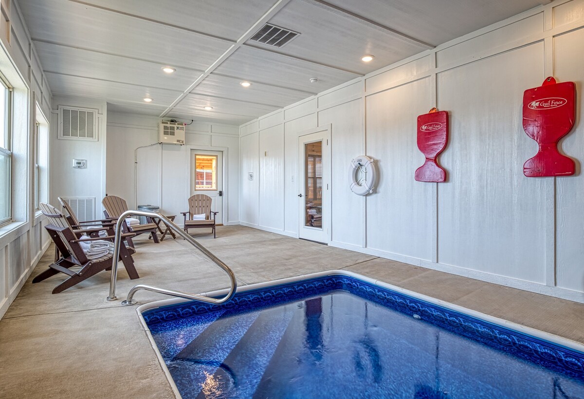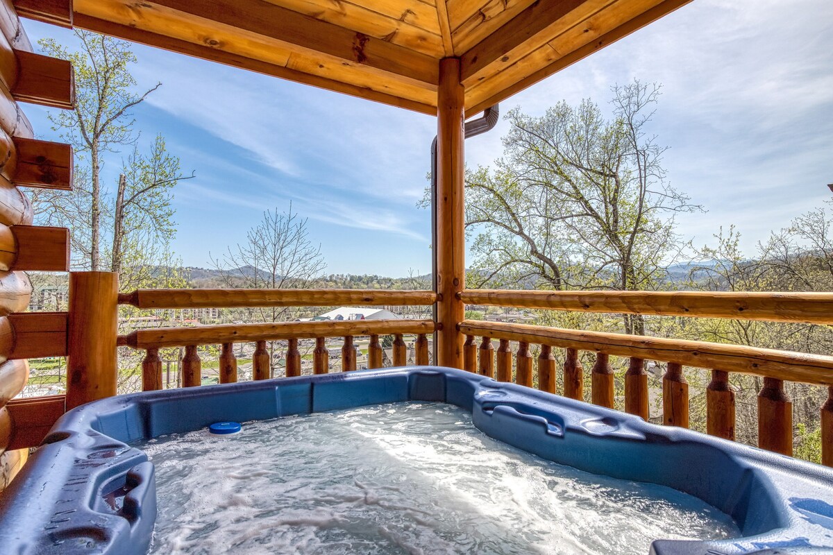 Heritage Hills Luxury Pigeon Forge Cabin with a indoor Heated private Pool, unit 850 Blue Bear Splash, is located just one mile from downtown Pigeon Forge, three miles from Dollywood, and has amazing views overlooking the Dixie Stampede and the Parkway in Pigeon Forge. This beautiful 4-bedroom 4 bath log cabin features an indoor swimming pool, pool table, cocktail game table, 4 bedrooms, 4 bathrooms and everything you would need to create the perfect Smoky Mountain Getaway. As you enter this brand-new cabin you are greeted with hardwood throughout the entire cabin and a fully furnished kitchen with granite countertops and stainless-steel appliances. There is a large dining room table with dining for 8, and a fully furnished living room with a stone encased year-round electric fireplace, and a 65-inch flat screen smart TV. Just off the living room there is a private indoor swimming pool that is exclusive for this property and offering views overlooking downtown Pigeon Forge and Dolly Parton's Stampede. There are two bedrooms off the main level, each with a king size bed, private bathroom, and a 40-inch flat screen TV. When you go upstairs you enter the game room loft area that has a pool table, cocktail style arcade machine, and a 50-inch flat screen TV. On either side of the game room are the two additional bedrooms. On features a king size bed, private bathroom, and a 40-inch flat screen TV. The other bedroom offers a set of queen size bunk beds, private bath, and a 40-inch flat screen TV. When you are not inside enjoying everything that the cabin offers, you can step out on the deck and use the gas grill to cook out with family, or soak away your worries in the hot tub. Unit 850 Blue Bear Splash definitely has everything a family would need to create memories that will last a lifetime. Come enjoy the 24 hour view this cabin offers. Dogs are welcome but must be under 35 lbs and additional fees apply and must follow Fireside Chalets pet policies. Parking for up to 3 vehicles. No Smoking. Wi-Fi included. Sleeps 12 Our prices include all fees. No hidden fees.
