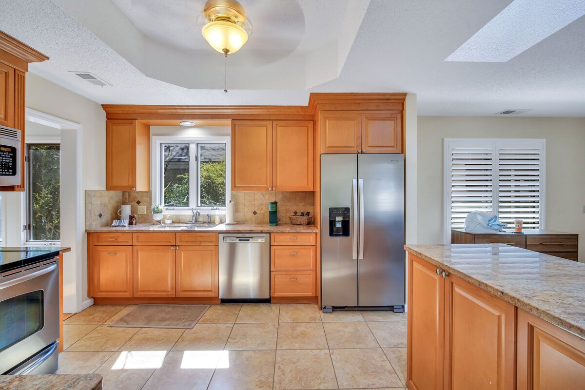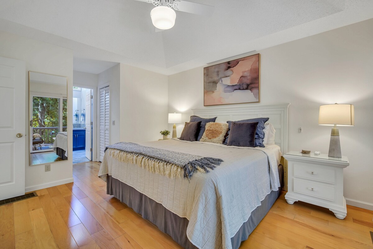 Located less than a mile inside the Sea Pines front gate this updated Carolina Place home has lagoon views framed by traditional South Carolina live oaks. This scene can be enjoyed on the elevated back deck complete with comfortable outdoor seating, and a full size grill. Carolina Place offers owners and guests a large beautiful private community pool and pool area with additional grills, a shaded space, and first come first serve tennis and pickleball courts – just a five minute walk away!