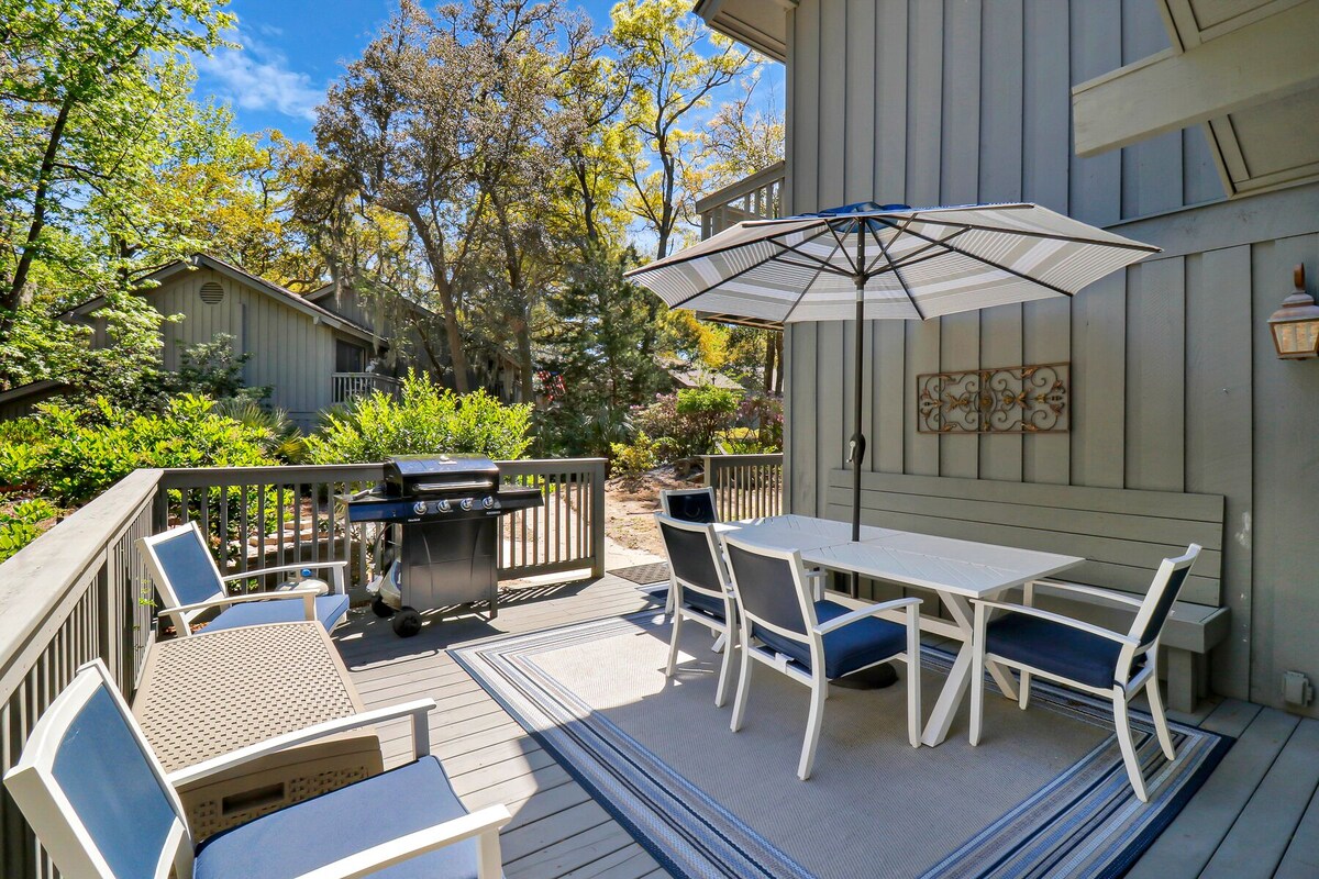 Welcome to this distinctive vacation property managed locally by Island Time Hilton Head. Located in Palmetto Dunes, it is just steps away from the community pool and a 5 minute walk to the beach. The villa features two bedrooms and three bathrooms, providing ample space and is Pet Friendly! Upon entering, you find yourself in a bright and open living room, characterized by large windows that allow ample natural light to fill the space. The living area seamlessly connects to a dining space that leads to the kitchen as well as a spacious deck. The dining table seats six, with three bar seats. The kitchen is well-equipped with stainless steel appliances and stone countertops. Located on the first floor is the primary bedroom. The primary bedroom features a king bed and a private deck. The primary bathroom has been completely updated. An additional bathroom is on the first floor with a walk-in shower. Upstairs, you'll find a landing with a queen bed in the loft space. Adjoining this space is the guest bedroom. The guest bedroom has two double beds. The second bathroom features a combination tub and shower. Relaxing on the deck of this charming villa, one can truly appreciate the tranquility of nature as the view unfolds to a canopy of lush green trees. The deck is an ideal spot to unwind, sip a cup of coffee, and immerse oneself in the calming embrace of nature. Key Features: • Proximity to the beach: 5 minute Walk to the Beach • Community Pool • Pets are allowed for an additional charge. • Palmetto Dunes Amenities Rent price includes: Rental Rate, Hospitality Program, Beach Gear Credit, Booking Processing Fees, and Departure Clean. Your Luxury Concierge is included with no additional cost. Our prices include all fees. No hidden fees.