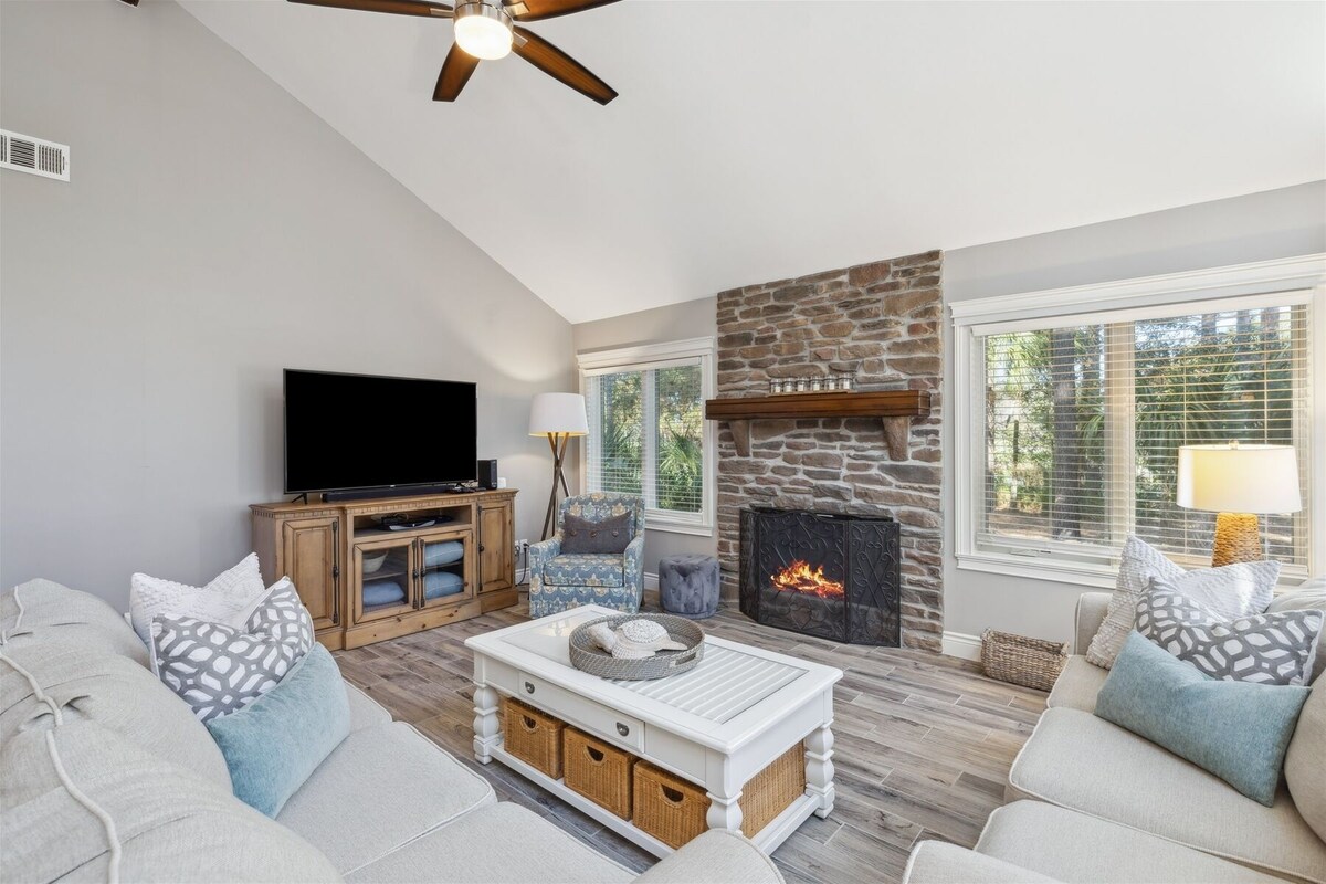 Your search for the perfect vacation home on Hilton Head Island has ended! Welcome to 48 Full Sweep, located mid Island in Palmetto Dunes. Palmetto Dunes Resort is a private paradise nestled between the Atlantic to the East and Broad Creek to the west on Hilton Head Island. This tranquil resort boasts maritime forests, marshlands and lagoons, beautiful stretches of beaches and an abundance of wildlife away from the crowds for a true barrier island getaway. Nestled in a quiet section of the resort, 48 Full Sweep is an updated, stylish, pet friendly three bedroom, three bath vacation home, just a short bike ride or 12 minute walk to the beautiful beaches on Hilton Head Island. This home boasts 2,100 sq ft of beautifully appointed interiors with walls of windows offering loads of natural light and tranquil views. The main floor offers a living room with comfy couches,flat panel TV, a spacious dining area and full kitchen complete with modern appliances and everything you may need to prepare snacks between beachtime or sumptuous seafood feasts at the end of the day. An expansive outside patio with a BBQ grill offers spacious and private outdoor living for dining , or drinks while you enjoy coastal breezes. 48 Full Sweep comfortably accommodates up to 6 guests. The master bedroom has a King bed, flat panel TV, a spacious private bathroom with double vanities ,walk-in shower, and direct access to the rear deck. Bedroom 2 has a King bed and private ensuite bath. The 3rd Bedroom has a comfy Queen bed and a full sized desk and work space, just in case you have to work a bit while you are here. Upstairs, in the loft, you will find an additional seating area for reading, enjoying the smart TV or just a place to spread out for an evening card game. Forgot your clubs? No problem, the owners have provided three sets of clubs for your use! No promises on whether they will improve your game, but maybe! Kids will love the lighted, full height basketball goal in the driveway. NBA stars are welcome! Enjoy the best of Palmetto Dunes’ championship golf only minutes away at the pristine Robert Trent Jones Course (views from this property), the George Fazio Course or the Arthur Hills course, a shot-makers favorite! Tennis, pickleball, and bike paths are available in Palmetto Dunes, all just a short distance from this lovely home. Nearby Shelter Cove Harbor has every water sport imaginable, all waiting for you and your family to enjoy. Tuesday nights during the summer months are extra-special as the Shelter Cove Community celebrates Harborfest, a free family friendly music and vendor extravaganza, ending the night with fireworks at dusk. No matter why you plan to come to Hilton Head, this clean and immaculately maintained home would be the pefect spot to enjoy it all... come see why! *2 car passes are included with your reservation, addtl passes are available if needed please inquire at the time of your reservation* Our prices include all fees. No hidden fees.