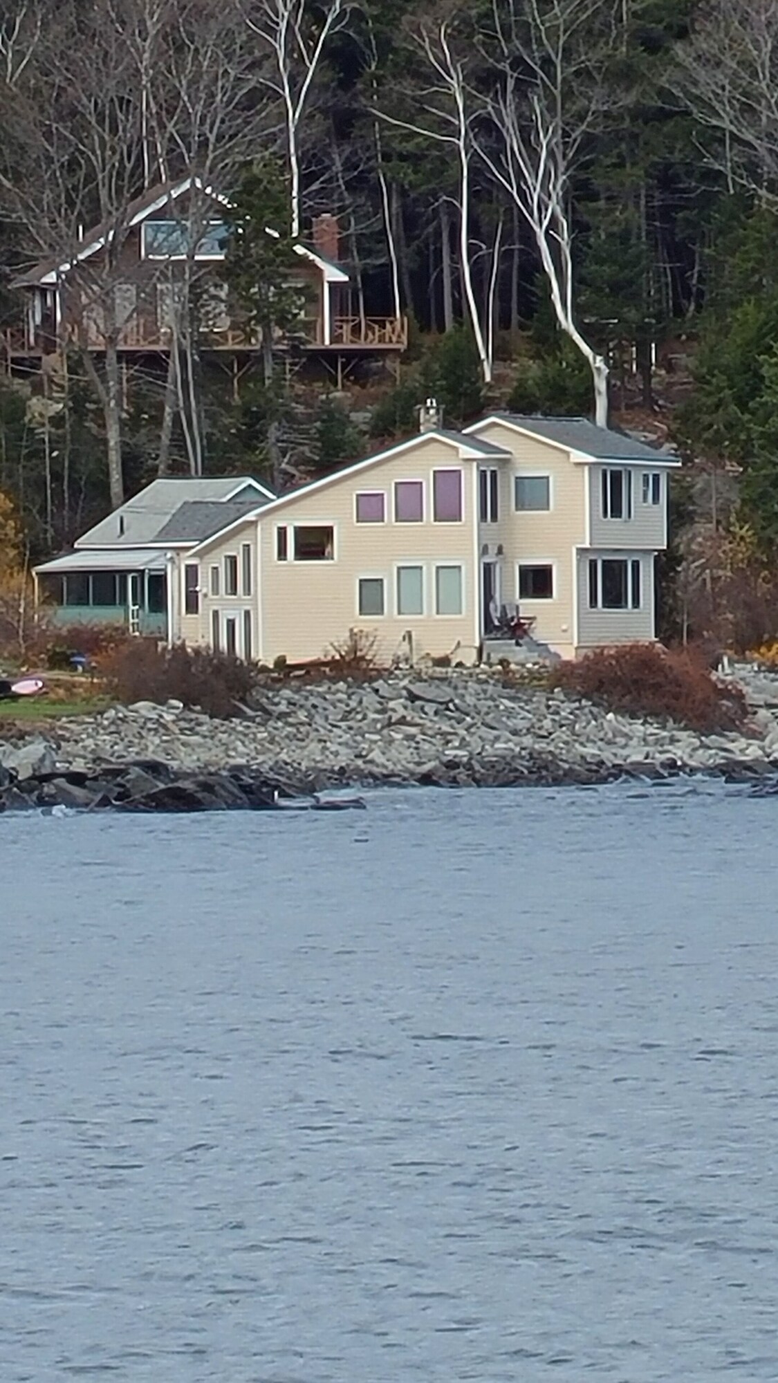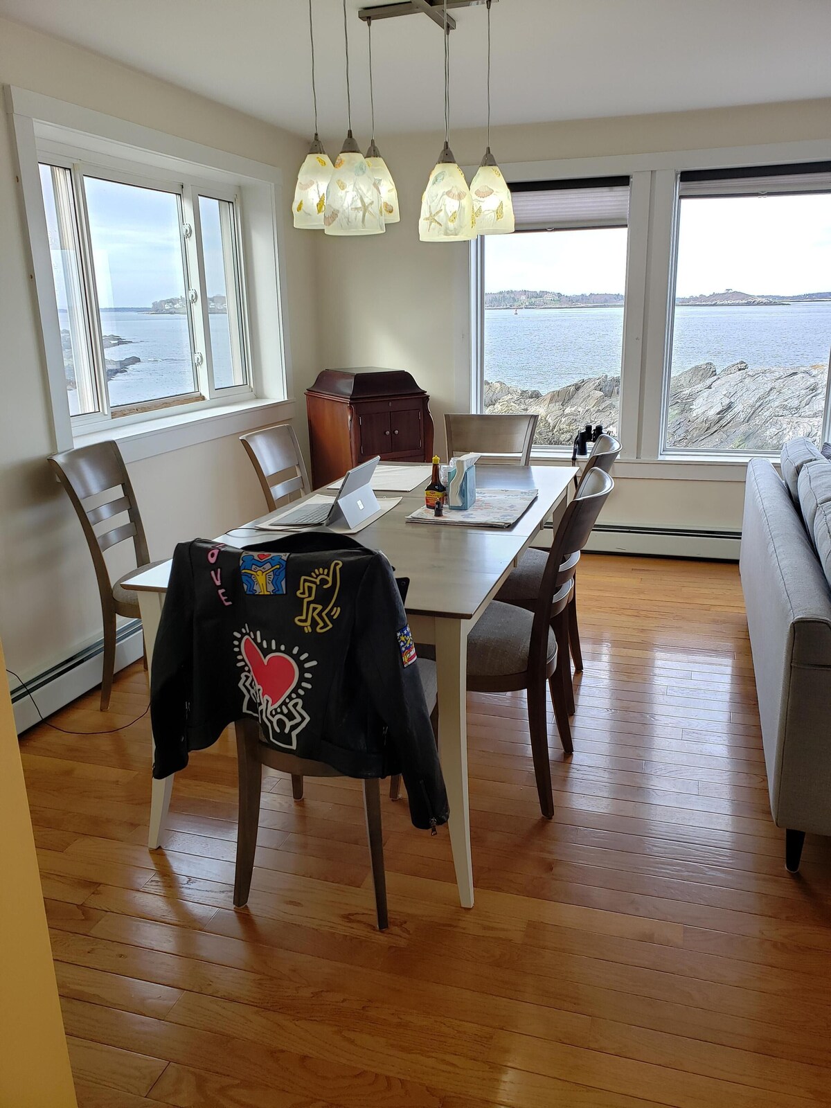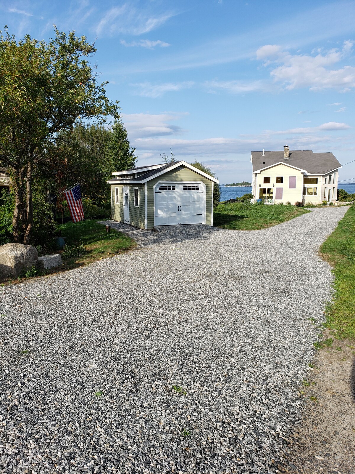 Panoramic Oceanfront and island view direct sunrise. Nature preserves and hiking trail next door and nearby. Away from tourist traffic but convenient to restaurants, sailing club, shopping, etc. Home was built in 2006. Immaculate with new furniture. Unique home with 36 windows throughout capitalizing on view from nearly every room. Second floor has master bedroom and bath suite with tub and upstairs sitting area. Incredible views. Queen Sleeper in room downstairs with half bath. Third single bed convertible couch sleeping area. Oceanfront patio with gas grill connected to house propane tank. Home receives Sebago Bay water from Portland which is excellent during warm weather. Refrigerated water cooler and water supplied. During the Winter/ cold months house is supplied with well water. It is salty and quite good for bathing. Too salty for drinking but entirely safe. Peaks Island is one of dozens of Island situated in Casco Bay and the Atlantic Ocean. It is the most accessible to Portland and the only one served with the Car Ferry. We believe it is one of the most beautify and definitely the most livable and convenient to Portland. Ferries run from Portland about every hour from approximately 6 a.m. to nearly midnight. There are hourly car ferries 7 days a week. The schedule varies day to day and depending on the month. The Ferry ride is extremely scenic and only 15 minutes on the water. To reach the home take the car ferry with your vehicle or without. There is a very reliable Taxi service for 3 dollars a person to the house which meets every Ferry. You will have a scenic 2 mile drive to the property around Seashore Drive. Some like to rent a golf cart near the Ferry dock. Bicycles rentals are available near the dock. There are two for your use at the house as well. The Casco Bay Ferry schedule is always posted on the Internet. Please call us whenever you need logitical or any further information. Just to note. There are two standard Nest outside security cameras on the property viewing the Ocean conditions and the Street coming in. One is above the front door and the other, the oceanside sliding door. If you have any questions, don't hesitate to ask. From the third week of October through the third week of May the city switches the water to well water. During this time dishes have to be manually washed with provided filtered water to avoid saltwater residue. Our prices include all fees. No hidden fees.