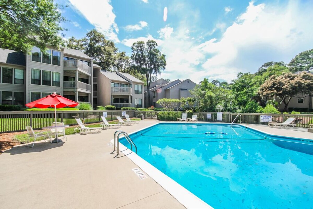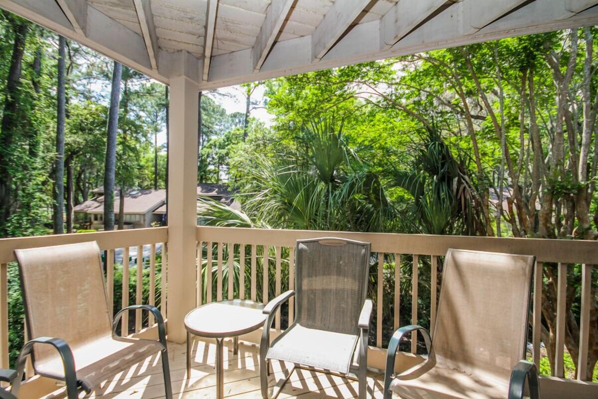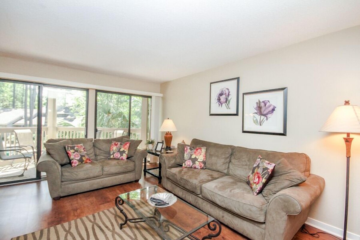 2395 Lighthouse Tennis Villa in Sea Pines Plantation is a delightful 2 bedroom, 2 bath villa close to Harbour Town! This second-floor villa is within walking distance of the restaurants and shops of Sea Pines Center and a nice walk or bike ride to the center of Harbour Town. With laminate wood flooring in the living and dining areas, tile in the baths and carpet in the bedrooms, you’ll enjoy the modern touches of this cozy villa. The living room has a beautiful armoire with a 38” flat screen TV with DVD player, plenty of comfortable seating and flows into the dining area, which seats four at the glass and wrought iron table and chairs. With the living room’s sliding glass door to the balcony and the wall of windows in the dining area, natural light floods these rooms for a bright and sunny area. The galley style kitchen, which is completely equipped, also has a stacked washer and dryer for your convenience. The kitchen is painted a soft green with white appliances and solid oak cabinets. Views of the tranquil lagoon from the balcony will relax you as you enjoy your morning cup of coffee or an evening beverage. You’re on “island time” now, so unwind and enjoy! Each of the two bedrooms has a flat screen TV and ceiling fan. The primary has a king bed, comfortable furnishings and a private, renovated bath with striking black vanity, double sinks and a beautiful walk-in shower. The guest room offers two twin beds and shares the hall bathroom. A tub/shower combination is located in this bath. For extra company, there is a queen-size air mattress. You also have access to the free seasonal trolley to the beach. Sea Pines is a gated community, and parking passes are required on every vehicle. -- YES, Pets Allowed - 2BR/2BA (K, TT, Q Air Mattress) - Lagoon View - Large Pool on site - Tennis on site - Multiple TV’s and DVD players - Bike or walk to Harbour Town - Bike or Trolley to Sea Pines Beach Club - Wireless Internet - Second Floor, No Elevator - Sleeps 4-6 **Please Note - To use the on-site pool and the tennis court, you would need to purchase a amenities pass.** Our prices include all fees. No hidden fees.