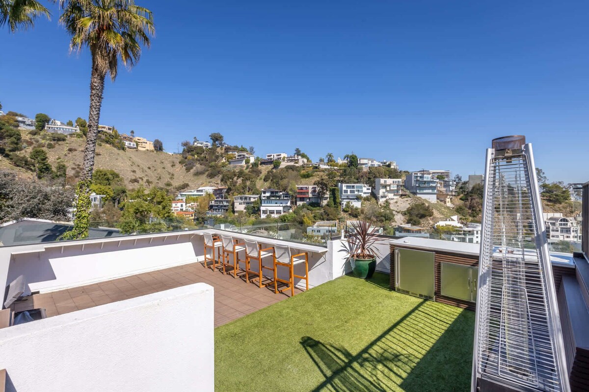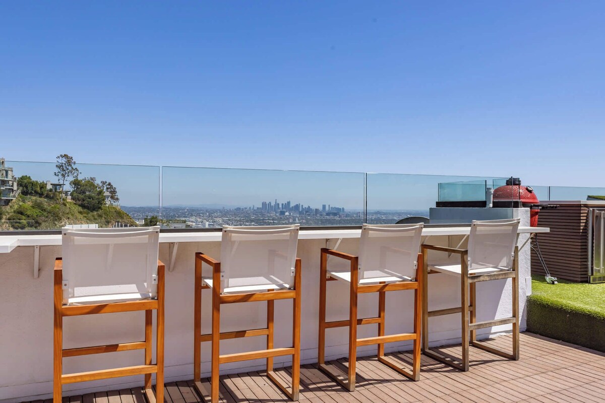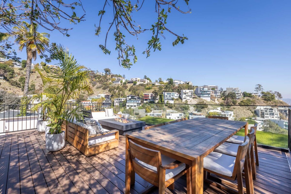 Summary: Escape to this breathtaking 4-bedroom retreat perched above the Sunset Strip, offering panoramic views from downtown to the ocean. Designed for unforgettable gatherings, the open-concept layout features soaring wood-beamed ceilings, sleek modern interiors, and seamless indoor-outdoor flow with floor-to-ceiling glass doors. Enjoy movie nights like never before with cinema-style projectors in the living room and primary suite. The gourmet kitchen and spacious dining area are perfect for group meals, while the cozy fireplace sets the mood for relaxing evenings. The private rooftop deck and spa provide the ultimate entertainment space, ideal for unwinding with friends or family under the stars. With multiple lounge areas, a luxurious primary suite, and plenty of space for everyone, this fully furnished getaway is designed for both relaxation and fun. Available for short and long-term stays. Please note, the garage is not available for use. The Space: The home offers a spacious and thoughtfully designed layout, perfect for both relaxation and entertaining. The main floor features two stylish bedrooms with a shared bathroom, an open-concept living and dining area, and a sleek kitchen. Floor-to-ceiling glass doors lead to a balcony with breathtaking views, which also provides access to the expansive rooftop deck. The rooftop is designed for ultimate entertainment, featuring a pool table, an outdoor dining table for eight, and a cozy outdoor couch with a fire pit, all set against stunning panoramic city views. The lower level includes two additional bedrooms, including a luxurious master suite with a spa-like en-suite bathroom and a walk-in closet. A second shared bathroom is conveniently located next to the laundry room. With multiple indoor and outdoor spaces, this home is ideal for families and groups looking for comfort, style, and unforgettable gatherings. Guest Access: Guest will have access to the entire home except the lower balcony. The Neighborhood: Located in the Hollywood Hills, 8544 Franklin Avenue offers stunning city and ocean views while being just minutes from the Sunset Strip. Enjoy easy access to world-class dining, nightlife, and attractions, plus nearby hiking trails for the perfect balance of excitement and relaxation. Getting Around: We highly recommend renting a car during your stay, as the house is located high up in the Hollywood Hills, making transportation more convenient. While Uber and other rideshare services are available, wait times can sometimes be longer due to the location. For added convenience, we also offer car rentals—feel free to reach out if you're interested in renting a vehicle during your stay. Other Things to Note: No parties, loud music, or gatherings of more than 8 people are allowed in the house. Maximum occupancy must be respected at all times. Any parties will result in immediate eviction. It is extremely important that all noise and music remain indoors and at a reasonable level by 10 PM. The neighbors are very sensitive, so guests must be mindful and respectful at all times. Complaints about loud music, entertaining guests, or excessive noise on the rooftop will not be tolerated. Any gatherings of more than 8 people are not allowed on the property unless discussed and approved by the host before check-in. We may require a security deposit for some bookings. - No music after 10 PM - Pets are allowed on a case-by-case basis with prior approval from the host ($90 per day per pet) - Smoking is prohibited indoors (outdoor smoking is allowed) - $250 fine - $35 charge per towel for any stained or ruined towel - $35 charge per stained pillowcase - $200 charge for a stained duvet cover - $200 charge if the house is left excessively messy and requires additional cleaning - Guests must be transparent and truthful when providing booking details. Any incorrect information may result in immediate eviction without a refund. - Non-compliance with these rules or complaints from neighbors will result in immediate eviction. Upon check-in, please report any damages to avoid being charged. We understand that accidents happen, and if something breaks, please inform us immediately. Minor issues typically won’t be charged, but for larger damages, we prefer to agree on the cost with you before departure to avoid any issues later. Thank you! Our prices include all fees. No hidden fees.