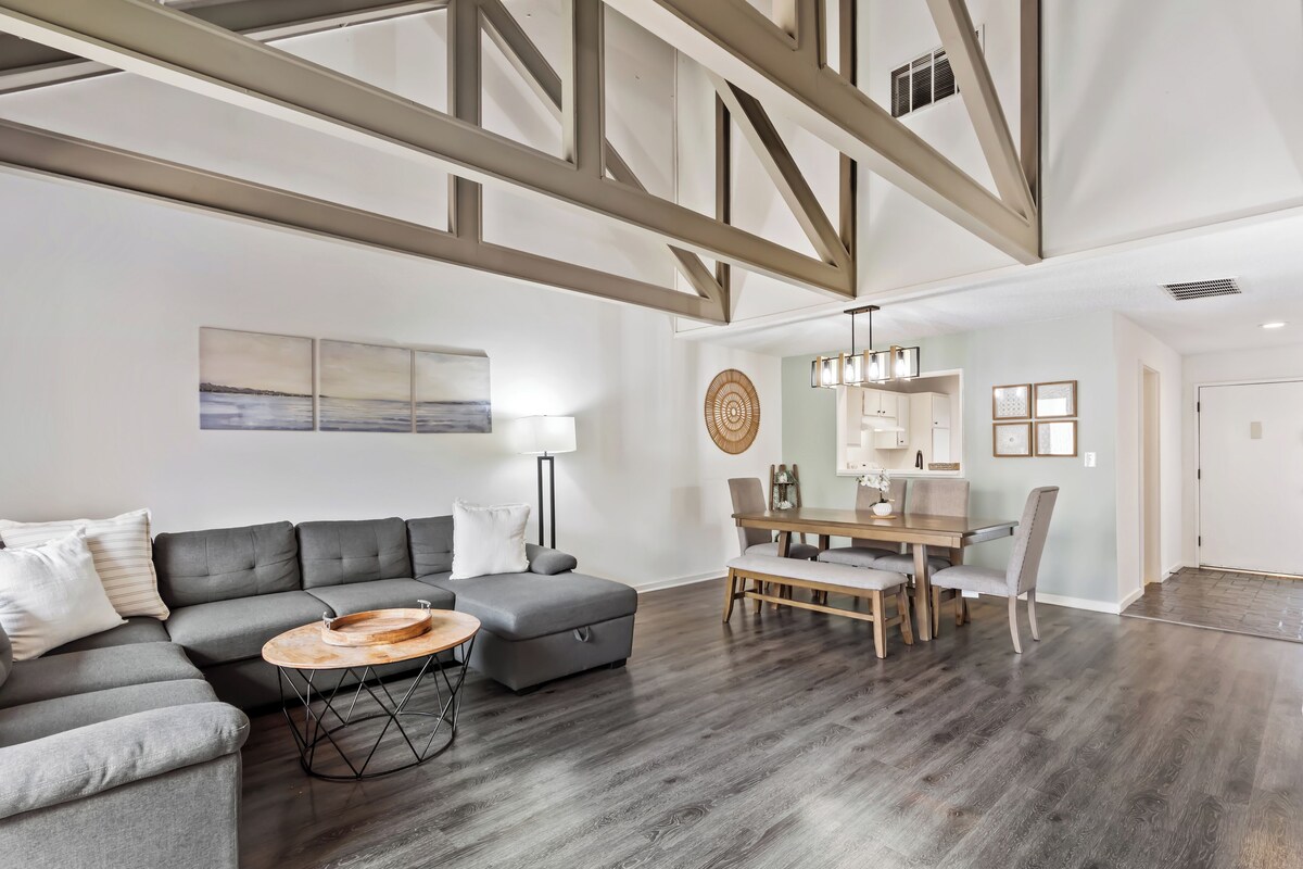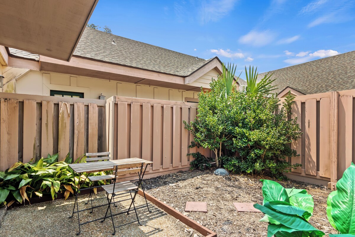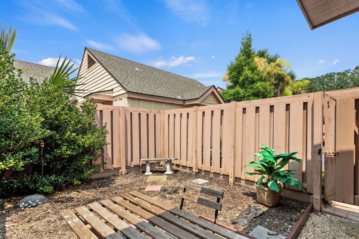 Hilton Head Island will undergo beach renourishment from September 2025 through May 2026 to help preserve the shoreline. During this time, small sections of beach (no more than 1,000 feet at a time) may be temporarily closed to pedestrian access as the project moves along. Plenty of beach will remain open and accessible for you to enjoy throughout your stay. For those looking to explore the island, hop on the complimentary local transportation service, The Palmetto Dunes Buggy, which can drop you off at nearby shops and dining establishments. On the lushly landscaped grounds of Queens Grant Villas, you'll find two outdoor swimming pools, a lagoon with a fountain, and walking and bike trails flanked by towering oaks and palmetto palms. When you're ready to dine in, the villa has all the appliances, cookware, and tableware you need to prepare a gourmet feast. The dining table comfortably seats six people, making it the perfect place for a family meal. After dinner, gather around for a board game and spend some quality time together. Get a good night's sleep in the primary bedroom's king-size bed, while watching your favorite show on the 58-inch Smart TV or catch up on emails. The second bedroom is perfect for kids with a full-over-full bunk bed and a twin trundle, and also includes a 65\ re not lounging by the pool, take advantage of the many activities available. Paddleboard, canoe, kayak, or bodysurf in the ocean, or head back to Queens Grant Villas for a peaceful swim in one of its relaxing pools. You can also explore the island ,