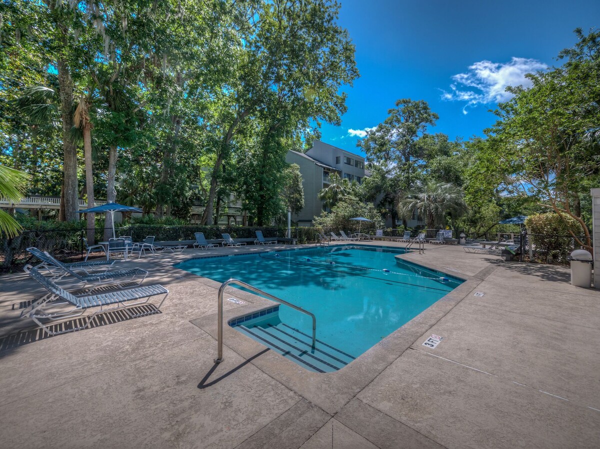 Hilton Head Island will undergo beach renourishment from September 2025 through May 2026 to help preserve the shoreline. During this time, small sections of beach (no more than 1,000 feet at a time) may be temporarily closed to pedestrian access as the project moves along. Plenty of beach will remain open and accessible for you to enjoy throughout your stay. A Hilton Head vacation is all about relaxing, reveling in the glorious surroundings, and relishing time with friends and family. FRESHLY UPDATED and pet-friendly 5403 Treetops makes it easy to do all of that. Not only is the two-bedroom, two-story villa restful and filled with plenty of conveniences, but it’s also in a beautifully landscaped condo complex with a pool and just a 10-minute walk to the beach and the Atlantic Ocean. Decorated in serene neutrals, the living/dining area of 5403 Treetops encourages you to kick off your shoes, stretch out, and relax. The seating is so comfortable—just what you want to sink into after biking the island’s miles of trails. Whether you opt to watch TV, surf the web via the free WiFi, sprawl out on the carpet with the kids for a game of Yahtzee, or indulge in a nap, you’ll feel right at home. The dining area seats four, though you might prefer to eat on your private patio. The salt-laced ocean breeze rustling through the fronds of the lush palmetto palm trees transforms any meal into a feast. And if it’s a true feast you want, 5403 Treetops’ NEWLY UPDATED kitchen is up to the task. It’s equipped with a full complement of appliances, cookware, and tableware. There’s a dishwasher too because when the beach is only a stroll away, nobody wants to waste time on chores. For the same reason, the villa has its own private washer and dryer just off the kitchen. Who wants to cook on vacation? Luckily, there are plenty of restaurants just beyond your front door. (Make sure to have at least one meal at Kenny B’s French Quarter Café; you can even walk there from the villa!) The two bedrooms are upstairs. The primary bedroom features a king-size bed, while the 2nd bedroom includes two twin beds. Each room includes a flat-screen TV with cable and access to a balcony. Step outside to marvel at the star-studded sky before nestling under the covers, or slip out before the others are awake to listen to the early-morning birdsong. Just as important, each bedroom has its own bathroom with a combination shower/tub. You can rev yourself up with a brisk morning shower, then relax after a day of golf, tennis, or sailing with a long, restorative bath—without a line forming on the other side of the door. For added convenience, 5403 Treetops also has a half-bath on the lower level. As inviting as 5403 Treetops is, you don’t come to Hilton Head to spend most of your time indoors. The complex’s outdoor pool is ideal for days when the ocean is a bit too chilly or too rough for swimming—or for any other sunny day. When you’re not in the pool you can laze poolside on a chaise or at one of the poolside tables. There are community grills too if you want to barbecue some burgers or kabobs after your swim. The convenient location means you can walk or bike to Coligny or South Forest Beach in minutes. At least once during your stay, you should wake up early enough to catch the sun rising over the Atlantic Ocean; it’s a sight you’ll long remember. When you’re not watching dolphins frolic in the surf and seabirds swoop across the sky you can swim, parasail, canoe, kayak, paddleboard, race jet skis, or search for shells in the sugary sand. Nearly as close by are numerous golf courses (you can drive to Shipyard Golf Club in less than 10 minutes) and tennis courts (Van Der Meer Shipyard Racquet Club is also less than 10 minutes away). Here’s your chance to make your dreams of a Hilton Head vacation come true. Book your stay at 5403 Treetops today—we look forward to seeing you! ***PLEASE NOTE: Exterior Security Cameras on on doors, back deck and balcony for your security & safety. This is a pet friendly property, an additional pet fee will apply. *** Our prices include all fees. No hidden fees.