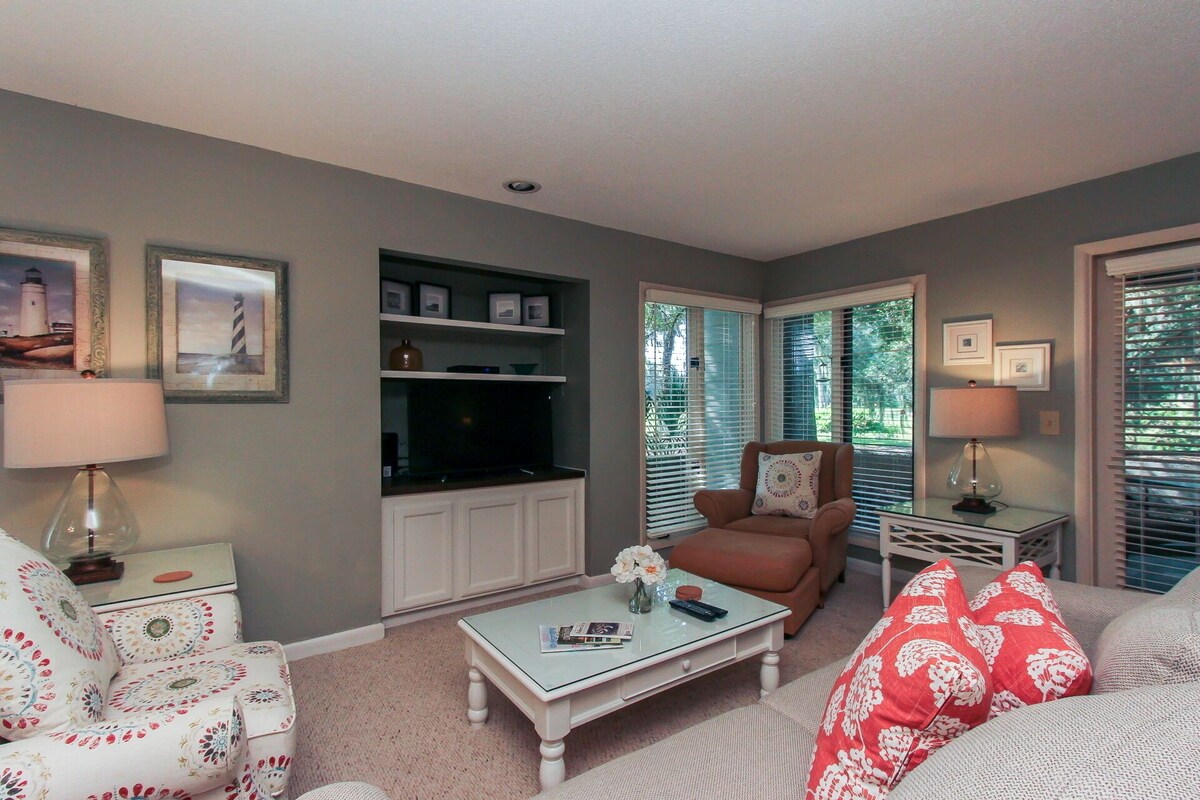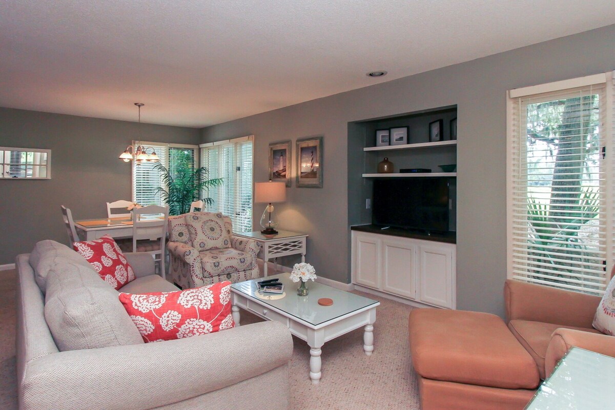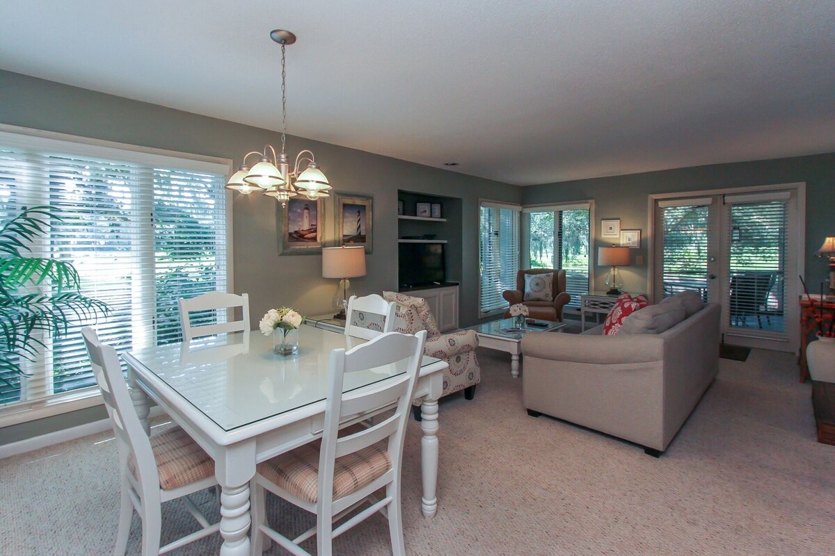 This beautiful first floor St. Andrews Villa is a 1 bedroom and 1 1/2 bathroom with screened in-patio. It is nestled between stunning Live Oak trees and the Legendary George Fazio 14th hole. The master suite, with a new Marriott king-sized bed and adjoining master bath with golf course views and French doors leading to the covered screened in-patio. The kitchen is updated with new appliances and has all the amenities you need. The living room offers spacious gathering area, a sleeper sofa and French doors opening onto the covered screened in-patio. Enjoy sipping your morning coffee, reading or just relaxing while enjoying an unobstructed tropical view. A new 46 inch LCD flat screen TV with high definition cable channels and high speed internet are free extras that will make you feel at home. Palmetto Dunes Ocean Resort has a storied history of offering unparalleled golf experiences for golfers across the country and around the world. The internationally-acclaimed Palmetto Dunes Tennis Center features 23 clay courts and two Nova ProBounce courts, eight of which are lighted for night play. The tennis center offers a full schedule of season activities, instructional programs and daily round robin tournaments, and the Monday Night Tennis Exhibition. Palmetto Dunes Resort in South Carolina features three miles of pristine beachfront along the Atlantic Ocean. The wide sandy beaches provide the ideal place to sunbathe, ride bikes, stroll, swim, boogie board, and/or just relax. Palmetto Dunes Oceanfront Resort and the sounding area of Hilton Head Island offers more than 50 miles of paved bike paths ideal for exploring. Guest may rent a bicycle at Hilton Head Outfitters to explore the island or try beach cycling along the beach. Rent a canoe, learn how to use a kayak, take surfing lessons, go water skiing or fish-there are more choices here at our Hilton Head Island beachfront resort than any other location in the southeast. Discover a wide range of indulgent Hilton Head dinning and restaurant options and a full array of exciting entertainment possibilities at Palmetto Dunes Oceanfront Resort and Shelter Cove Harbour. Our prices include all fees. No hidden fees.