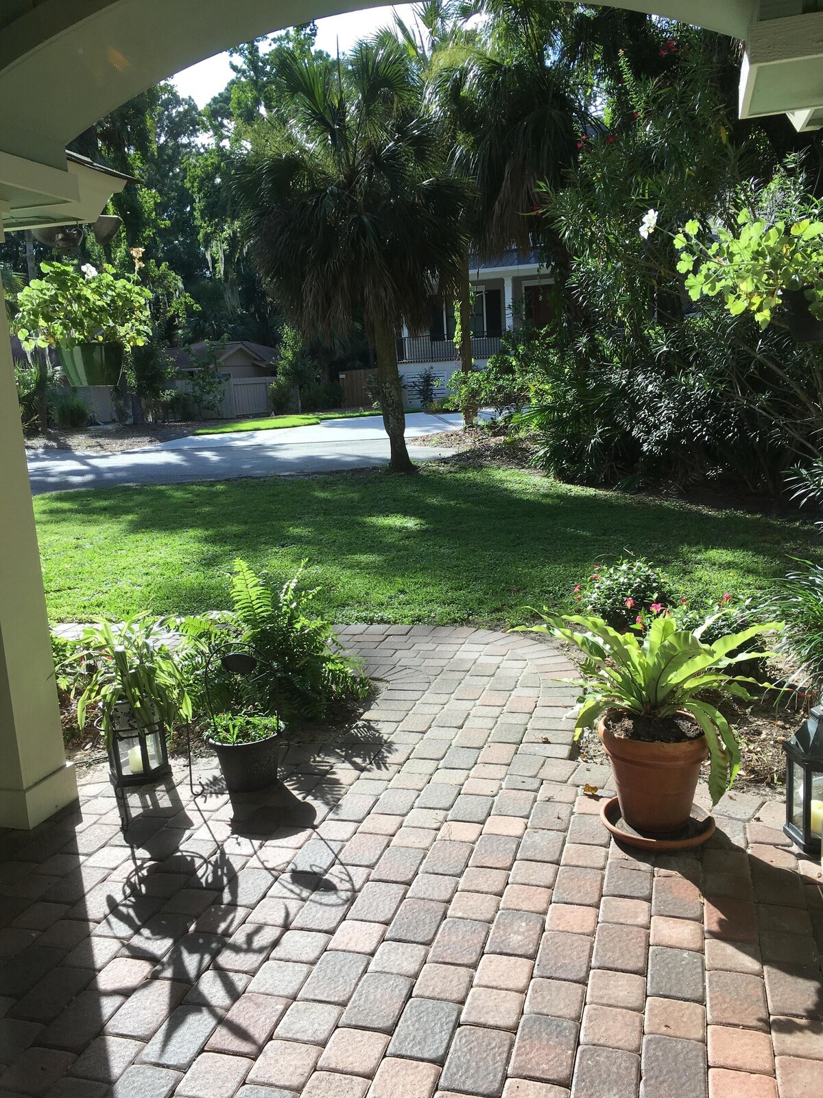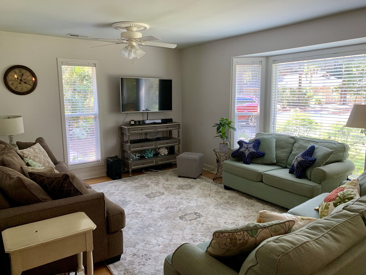Enjoy all the comforts of home in walking distance of the beach! As always, we use disinfectant cleaners and offer “contactless” check-in to make sure you stay safe as possible. We also have hi-speed WiFi for all who are distant learning and working from home. Pets (certain dogs only) are considered (please ask for details), and we’re sure your furry family members will appreciate the private, fenced-in backyard and being able to accompany you to the beach, many restaurants, and coffee shops in walking distance of our home. This 8th row beach home is only a mile from popular Coligny Plaza’s hotspots and the Tiki Hut (with oceanfront beach volleyball courts, daily live music, and regularly-scheduled opportunities to dance the night away on the sand, under the stars). Other things to note: No need to worry about keeping up with keys here! Guests will be given an access code upon arrival for the security keypad on the door. Each bedroom and the family room has its own flat screen tv with hundreds of TV channels. Many of our guests have found it convenient that our home (spread out all on ground level) is wheelchair accessible and has a walk-in shower in one of the bathrooms (i.e. no tub to step over). Finally, you will also enjoy free WiFi throughout the home during your stay. There is also a new high-efficiency washer and dryer for your convenience. A blender is available for those who like to prepare blended drinks. Please check out all the other amenities also listed here, as well. Our prices include all fees. No hidden fees.