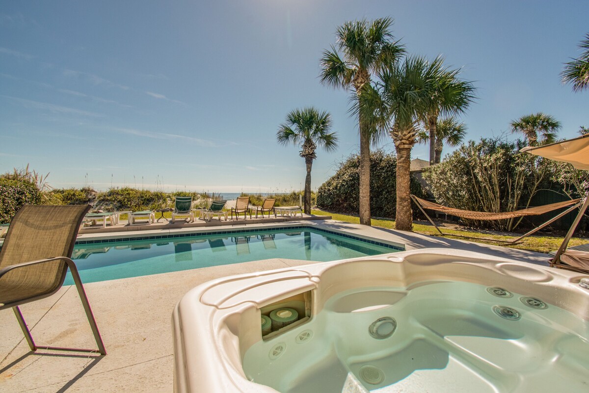 Discover coastal living in this classic 5-bedroom, 4.5-bath oceanfront home located in the North Forest Beach area of Hilton Head Island. Immerse yourself in breathtaking ocean vistas from nearly every room and deck, creating a serene and unforgettable vacation experience. Inviting Living Spaces Upon entering, you'll be greeted by a spacious and comfortable living area on the first floor, with direct access to a large deck leading to your private pool oasis. This level also features three well-appointed bedrooms, two furnished with luxurious king-size beds and one with a twin and full bed, ensuring ample space for your entire group. Elevated Elegance Ascend to the second floor, where you'll find the open-concept living room, dining room, and a well-equipped gourmet kitchen, all boasting incredible ocean views. The kitchen features ample counter space, a spacious bar for casual dining, and top-of-the-line appliances, including a Keurig, drip coffee maker, food processor, crockpot, and blender. Master Suite Retreat The master bedroom, located on the second floor, is a true sanctuary. Relish in the luxurious king-size bed, indulge in the private en-suite bathroom with a jacuzzi tub and separate step-in shower, and step out onto your private oceanfront balcony to take in the breathtaking vistas. Flexible Accommodations Just a few steps away, you'll find another bedroom offering two queen beds, flooded with natural light from the skylight in the living room, creating a warm and inviting atmosphere. Vacation Perfection This recently renovated and beautifully decorated home is equipped with top-notch amenities to ensure a truly remarkable stay. Stay entertained with ROKU Smart TVs in every bedroom and throughout the house, and enjoy high-speed WiFi, DirectTV in every room, and a BBQ grill for alfresco dining. Cool off in your private pool, or stroll along the uncrowded beaches and shaded paths leading to the vibrant Coligny Plaza, where you'll find an array of shops, restaurants, and activities. Whether you're a large family or multiple families vacationing together, this home offers the perfect blend of comfort, privacy, and shared spaces to create lasting memories. Book your stay today and experience the ultimate in coastal luxury. PROXIMITY TO THE BEACH - Oceanfront PROPERTY CONFIGURATION - 5 Bedrooms - 4.5 Baths - Sleeps 12 - Parking for a maximum of 6 vehicles on improved surfaces like driveways (no parking on grassed/landscaped areas) - 5500 Square feet BEDDING BREAKDOWN - Bedroom 1 – 1 King, 1st floor, private bath - Bedroom 2 – 1 Full 1 Twin, 1st floor, shared bath - Bedroom 3 – 1 King, shared bath - Bedroom 4 – 1 King, 2nd floor, private oceanfront balcony, private bath - Bedroom 5 – 2 Queens, 2nd floor, private bath FEATURES - Direct oceanfront with private beach path - Private pool (30x15) with stand alone hot tub - Hot tub heat included; pool heating available for $775-$1275+tax/week - Well stocked kitchen with single ovens, dishwashers, large fridge (2nd fridge on pool deck), Keurig, drip coffee maker, food processor, crockpot, blender - Electronic entry lock - Fresh sheets and towels provided - 15 large beach towels - Drip coffee and tea for the week - Automatic espresso maker - Reverse osmosis water cooler with hot water - 10x10 SunNinja beach shade - 10 backpack beach chairs - Beach cooler - Beachside fire pits with firewood - Gas patio heaters - 8 adult bikes, baby seats, 2 kids' bikes - ROKU Smart TVs in all bedrooms - Highchairs and baby gear - Beach/pool toys and games like LED bocce - STOCKED FOR YOUR ARRIVAL Kitchen: Dish/dishwasher soap, sponges, napkins, paper towels, coffee, tea, spices, sugar, Splenda, cleaners, bags, wrap, foil Bathrooms: Soap, Q-tips, caps, shampoo, conditioner, toilet paper, hair dryers Laundry: Detergent, fabric softener, dryer sheets, stain remover Cleaning: Carpet cleaner, glass cleaner, tissues Plus: Baked goods, champagne, propane, bikes, first aid, meds, games, books PROPERTY REMINDERS - Dog friendly (max 2 dogs) - 5 vehicle max parking on improved surfaces only - Carport Access - ACTIVITIES - Swimming at beach or pool - 30+ world-class golf courses within 30 mins - World-class tennis and pickleball - Watersports - boating, fishing, sailing, etc. - Biking trails - Sightseeing in Savannah, Beaufort, Charleston Our prices include all fees. No hidden fees.