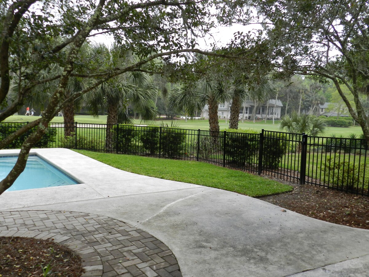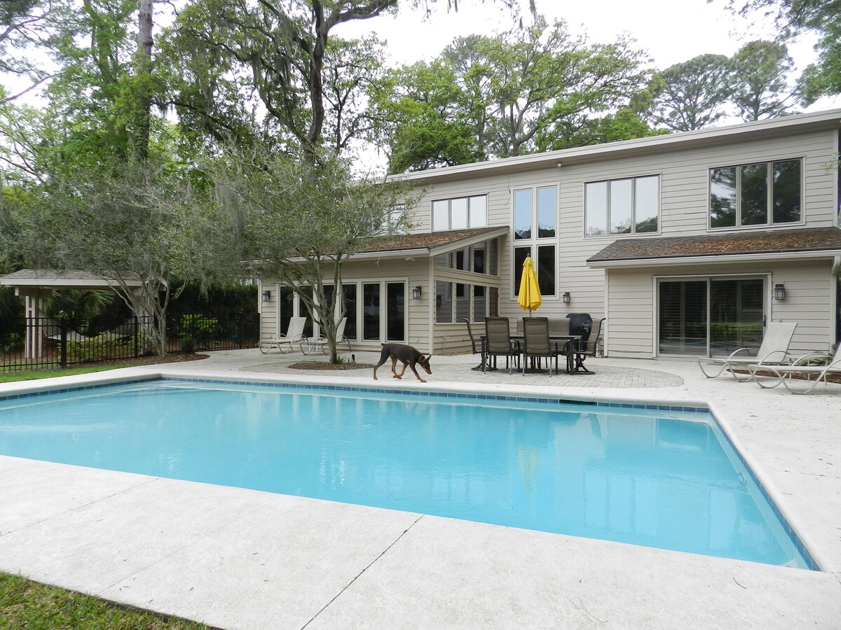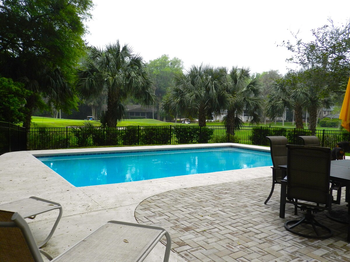 OUR FOUR HOMES HAVE MONTHLY WINTER RATES Our large pool gets full sun from early morning throughout the day, and overlooks the second green of Atlantic Dunes just yards beyond. 500 yards to the beach makes it an easy walk. The location is 4 minutes to the beach path, on the very quiet and beautiful Live Oak Road that has little traffic being a no through road. The living /dining room, downstairs Master bedroom, and the 3 upstairs bedrooms are all located on this side of the house, facing south & overlooking the pool and golf course. Each bedroom, plus the 3 separate living areas have TVs and Blue Rays, for a total of 7. And of course internet. The entryway is lined with bookshelves, and has an open stairway ahead with a dramatic two story window overlooking the pool, patio, golf course and green beyond. The living room has 3 walls of windows and doors, sofas and chairs offer comfortable seating, the dining room table seats 8 with ease, this area leads into a spacious kitchen, with patio doors, counter seating, breakfast table & chairs, plus sitting area. The second stair case leads from kitchen seating area directly up to a second living room where we have a TV, blue ray & card table, with plenty of additional seating. The large laundry room, set up with washer, two dryers, sink, ironing board & iron is directly off of this room. The largest bedroom upstairs, with bathroom en suite has a queen size bed, and a comfortable full size sofa/bed. The other bedrooms, consist of the Flip Flop room two twin beds and the end bedroom has a queen sized bed that shares a bathroom with the twin bedroom. As well the normal air conditioning system in these three bedrooms, we added Mitsubishi mini split units also, this allows guests in each room, to individually control their choice of temperature. The large master bedroom located on the ground floor, has a whirlpool tub and large separate shower, it leads directly out to the pool through glass patio doors. The pool, sun drenched throughout the day, runs the length of the house, with a spacious patio, chaise lounges, umbrella with table and chairs, & Weber gas grill. The lawn has a roofed trellis with hammock and Adirondack chairs overlooking the green & fairway beyond. We are also pet friendly by arrangement, dogs only that are at least one year of age, with no size restriction. A fence encompasses the entire pool and patio which includes a generous grassy area for doggy convenience, allowing your canine family member to join you, without worry. This fence does not compromise the view, but allows freedom for our visiting doggy guests & convenience for their owners. Our pet fee is $225.00 for each dog and the maximum is two. This property has easy access through the Ocean Gate, the Plantation & Beach Club are half a mile further on. We work directly with our guests to ensure that they have a very comfortable stay in our homes. We are available to guests twenty four hours a day. WE HAVE THREE MORE HOMES listed on HomeAway. It seems Safari is not showing all of them, so their HomeAway VRBO numbers are 239212 or 7263910 both also on Live Oak Road or 371621 located in Baynard Park. For those who like to bike ride, we have arrangements with Riding Tigers Bike Rentals to obtain discounted pricing on bike rentals for our guests. Simply call them and ask for the discount. They offer free delivery and pickup also. Our prices include all fees. No hidden fees.