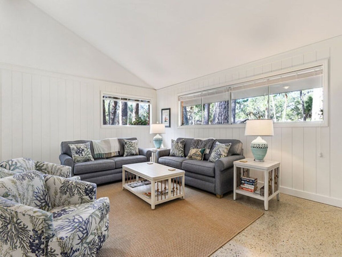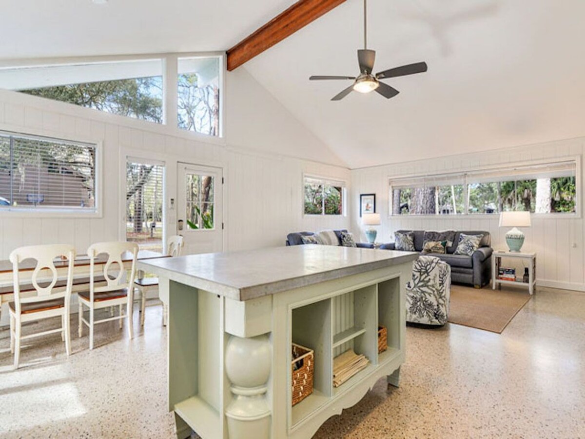 OCEAN-SIDE COTTAGE CHARM… Bring your family and pet to stay in this beautiful beach cottage. This 5th row ocean home is located in an affluent ocean-side residential community in the sought after South Forest Beach area of Hilton Head. Just a short 1-2 minute walk and you will enjoy one of the widest and best beaches on Hilton Head (with no major roads to cross). 1 Dogwood is an original…with all the charm of a beach-side cottage and all the comforts of home. Recently updated, you will find most everything you need to make your stay comfortable and memorable. A wonderful outdoor fenced patio extends your living space. Plenty of seating for 6, plus two lounge chairs with an umbrella, a grill and a fan are there for your comfort. Getting back and forth to the beach is easy. Six beach chairs, two beach umbrellas and a rolling cart and more are provided. When you get back from the beach there is an outdoor shower for your use. And…when tide is up, access to miles of bike paths is just across the street! The beach cottage has an open floor plan with living and dining and kitchen in the great area. The living area has two full couches and two side chairs. There is also a 55” smart TV and 56” ceiling fan. The dining area seats six at a table with chairs/bench, and also has two bar stools. The kitchen is fully equipped with full size refrigerator and stove. The kitchen is well equipped with all the small appliances, dishes, glassware and utensils that you will need for your stay. The master bedroom has a king bed, a 49” TV and large dresser and closet. The adjacent master bath has a marble top double vanity , hair dryer and walk-in tiled shower. The first guest bedroom has a king bed, a 43” TV and large dresser and closet. The second guest bedroom has two full beds, a 43” TV and dresser and closet. The guest bathroom has marble top sink, hair dryer and tub/shower. There is also an enclosed washer and dryer area. Lights & Security. The outside front light and a patio light may remain on at night. There is a motion sensor light that comes on when in the front. While the area is safe, we have taken the extra precaution to install security cameras for your protection. There are cameras located in front of the house, in the backyard and the side yard next to the road.There are no cameras located inside or in private areas, including the patio. The property is pet friendly. One small dog/service animal is allowed. Larger or an additional pet requires prior approval from the property owner. There is a pet fee. Our prices include all fees. No hidden fees.