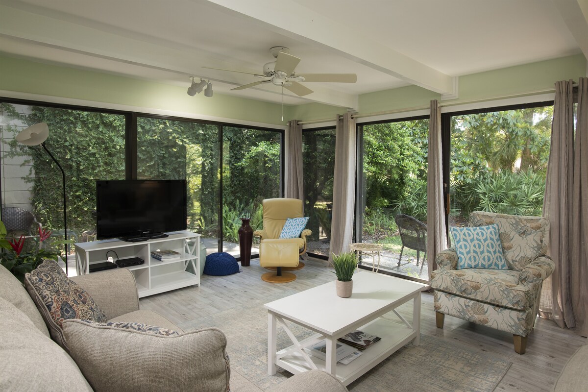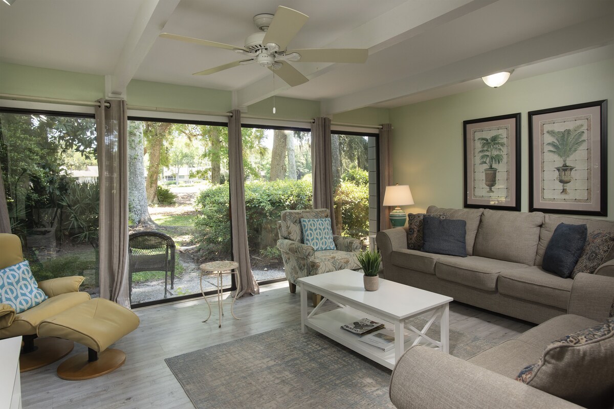 Enjoy an amazing golf view from the sunny living room of this 3 bedroom Lighthouse Road Villa. Nicely remodeled kitchen, new living room furniture and flooring, new large TV's and appliances, along with a fantastic new master bedroom suite and powder room are just some of the recent updates completed in this villa. Located a very short walk to the new Plantation Club Golf Complex and the beautiful Sea Pines Beach Club. This property's location is prime on Lighthouse Road. Free bikes are included and will be waiting when you arrive. Use them on the many wide bike paths going just about everywhere within Sea Pines--You don't really need your car much for this vacation. Sea Pines also has a free trolley, another fun way to explore all the beauty and nature of Hilton Head. Parking is right in front of the villa. Bring your pet and enjoy all the dog friendly businesses and parks. This villa is pet friendly, but please note that we have a pet fee, so please be sure your pet is listed in the guest count as you book so that your quote will be accurate. All bed/bath linens are provided as well as beach towels and beach chairs. Free clay court tennis is provided at a private tennis club-free upgraded wireless internet and Tv's in all rooms! Be sure to visit Harbour Town or the South Beach area, with tons of dining and entertainment possibilities. Please note this property does not have a neighborhood pool. Pool access is through the newly remodeled South Beach Pool, located 3 miles from the villa by the marina. Passes are $125 for a family weekly pass. Daily and individual passes are available. For details and to register visit southbeachpool.com. For your convenience, your Sea Pines vehicle pass and door code will be mailed to you prior to your arrival, eliminating the need for an extra stop when checking in. Simply drive straight to your villa, park and hit the sand! Our prices include all fees. No hidden fees.