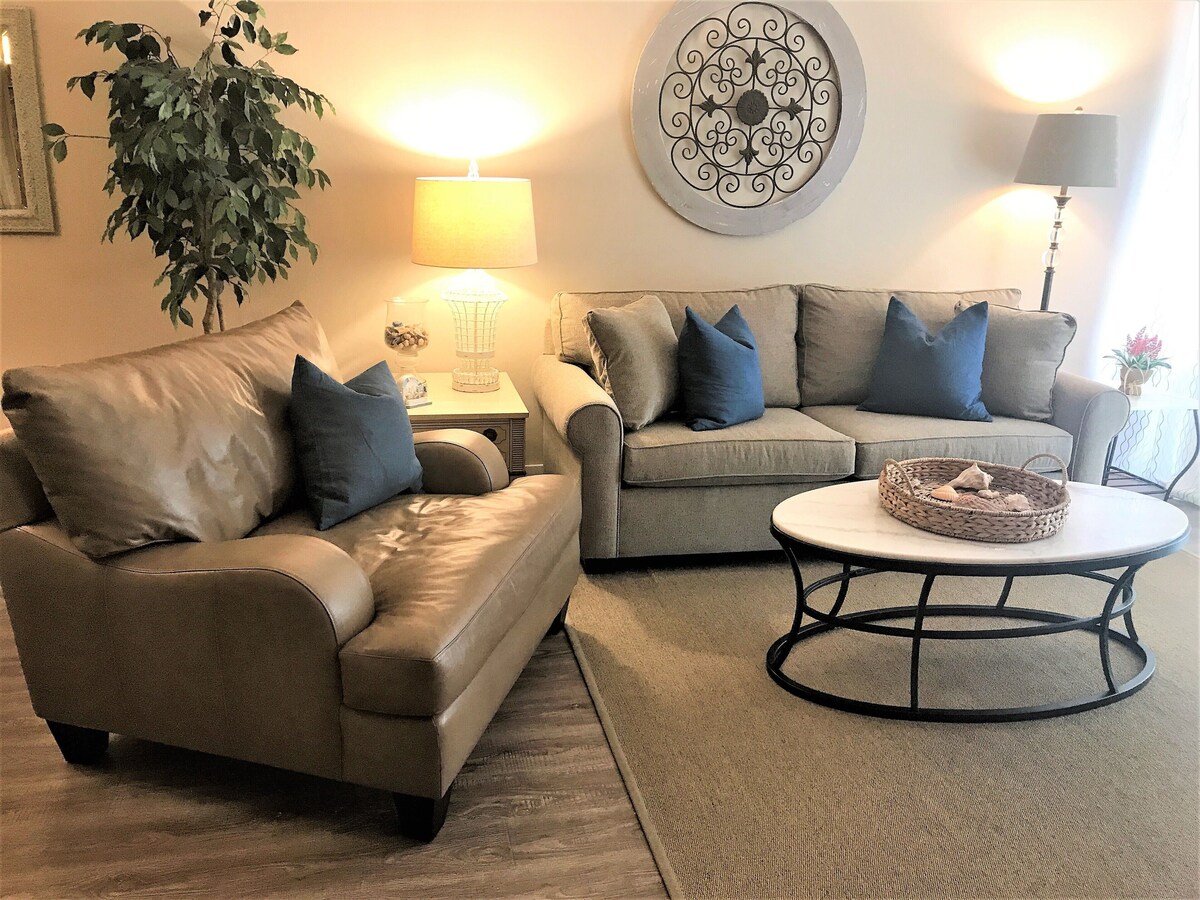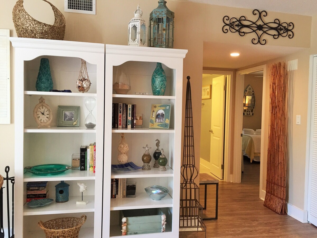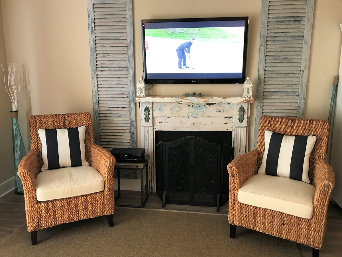 Welcome to Harbour Cove! Harbour Cove, an exquisitely decorated gem in the heart of Harbour Town at Sea Pines Plantation welcomes you! With its luxurious feel and plush surroundings, Harbour Cove offers amazing accomodations for an incredible price! Completely renovated with an upscale, open kitchen and spa-like baths, top-of-the-line, double-paned windows and sliding glass door, this one-floor luxury features modern, hand-scraped wood flooring throughout, two luxe private bedrooms and two full baths. Fully remodeled and professionally decorated, this upscale condo is cheerfully bright and airy. Located on the second floor, Harbour Cove offers easy, one-level living and can be accessed by stairs or elevator. LIVING ROOM/KITCHEN/DINING – The condo features an open living room, kitchen and dining area, tucked-away top-of-the line washer and dryer, and a sliding glass door leading to the balcony for enjoying the beauty of Southern sunshine. The LIVING ROOM is perfect for relaxing with queen sleeper sofa and leather chair, antique faux fireplace and a 60\ ,