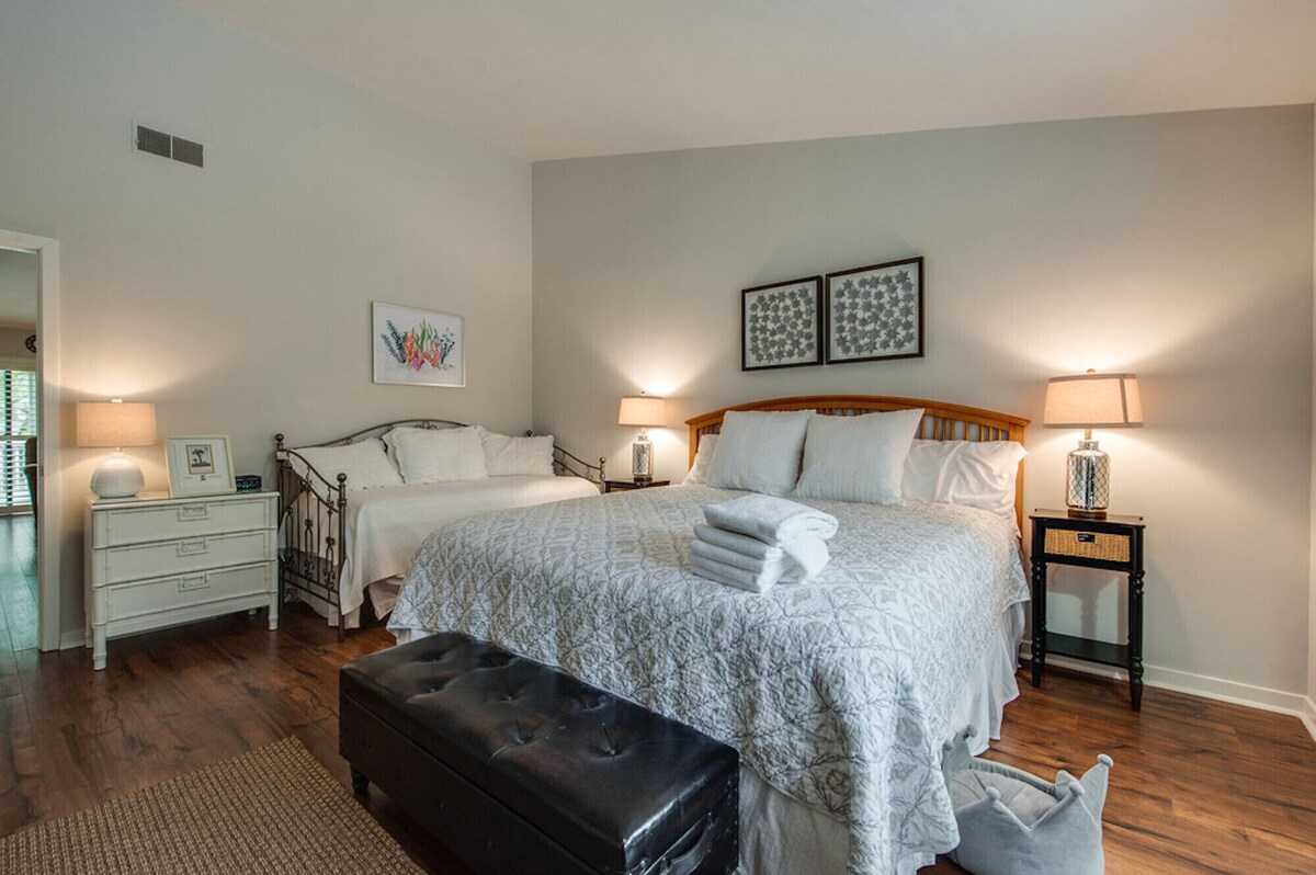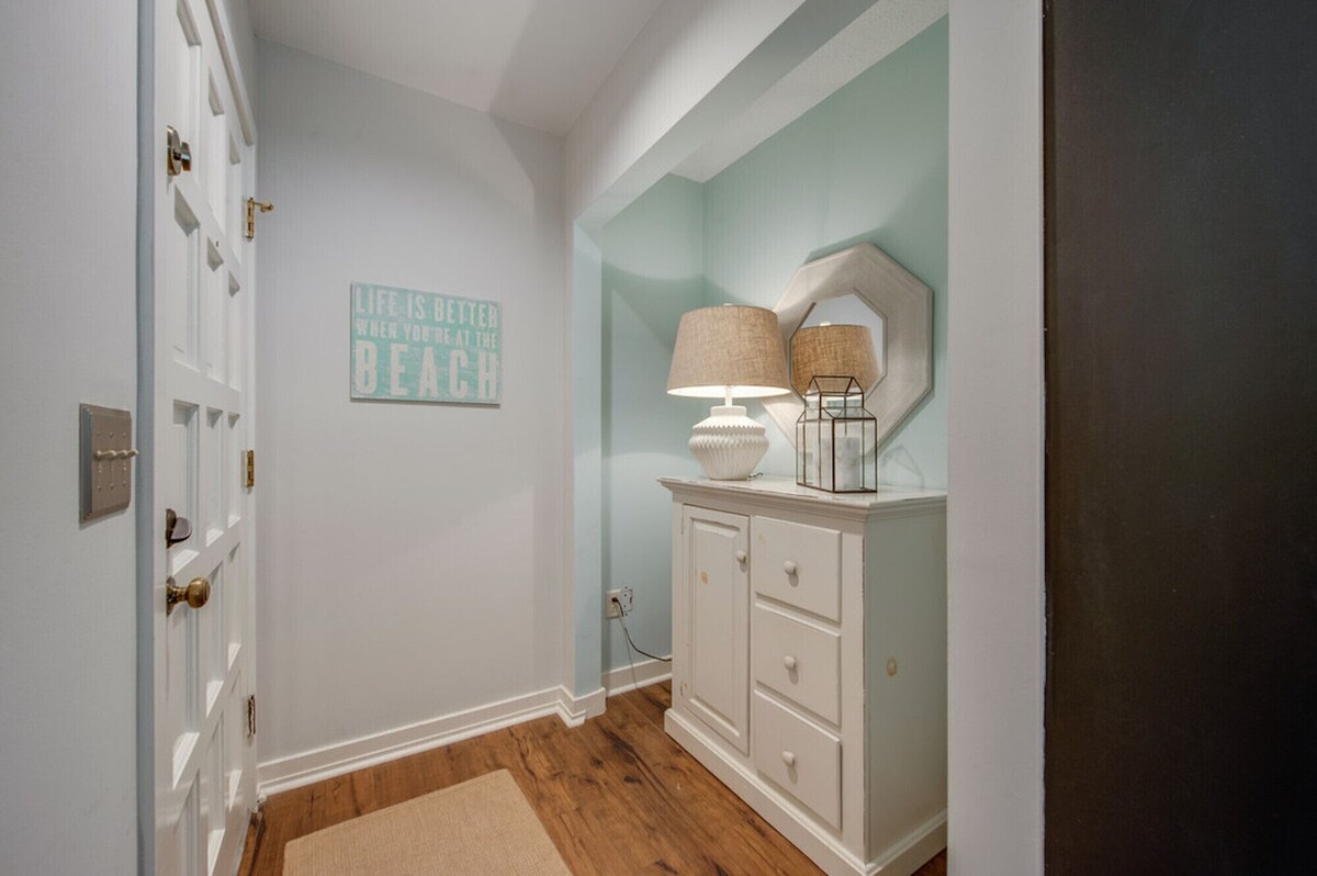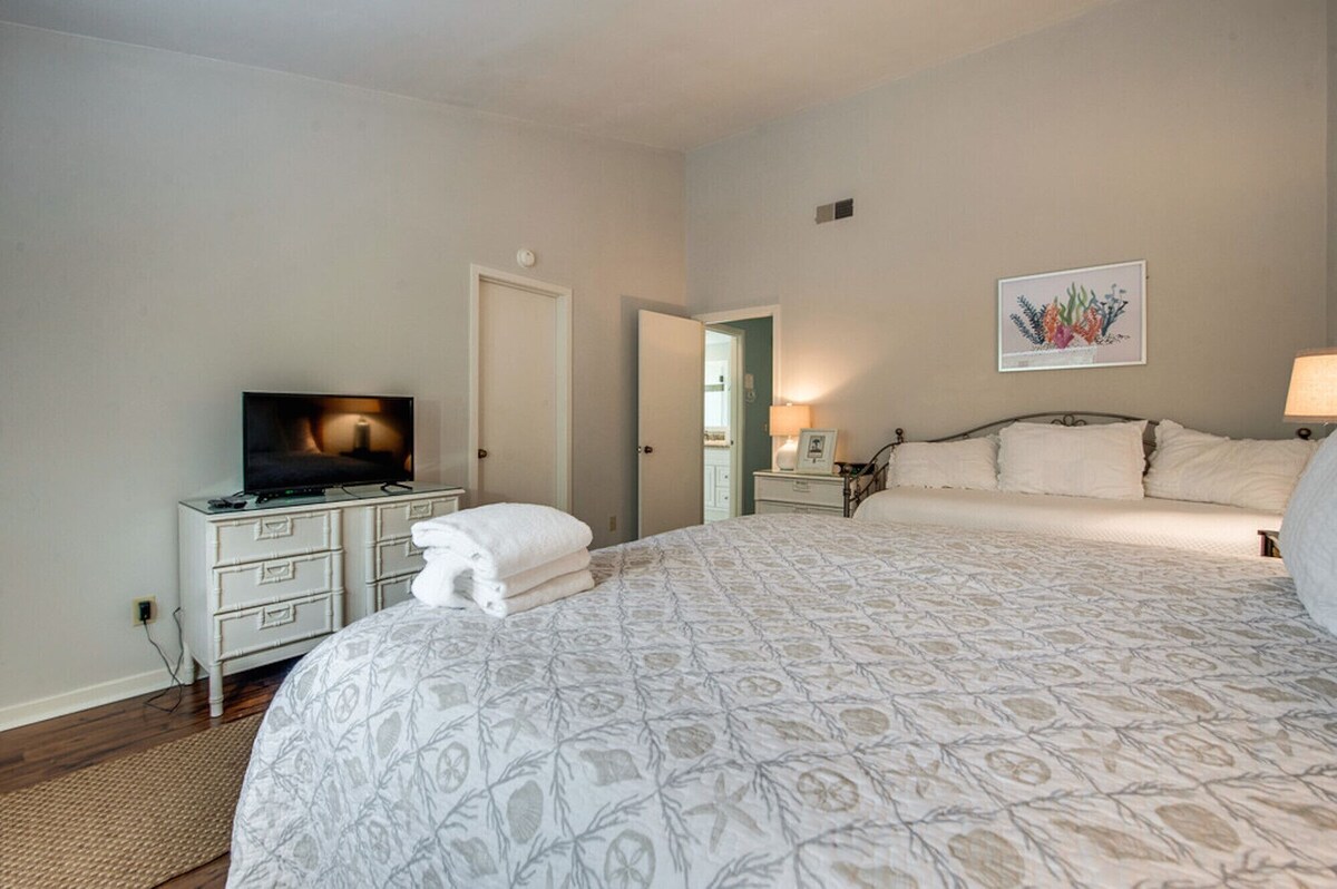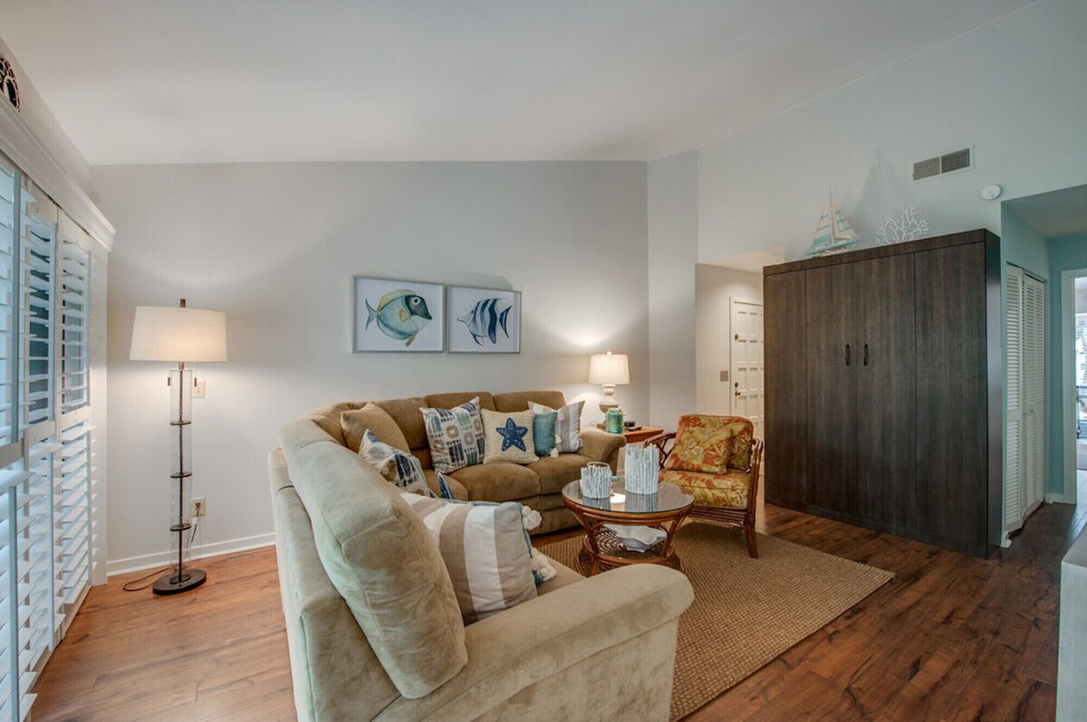 *Additional discounts available for Jan 10-Feb14. Please message owner for more details!* You'll love this beautifully renovated villa for your beach vacation. The private end-unit packs a ton of wow factor into a small footprint. Conveniently located next to Sea Pines Center and pets are welcome. Set on the second floor of the desirable Lighthouse Tennis complex, offering exclusive access to a pool and four tennis courts, this villa welcomes you in with a living space flanked by a lush wall of plantation shutters that lead up to tall angled ceilings. Those shutters pull back in dramatic fashion to reveal sliding glass doors out to a patio with golf course and wooded views, seating for four around a wrought iron table, electric grill, and bird feeder. Inside, the living space is an oasis of relaxation. A comfortable sectional sits oriented around a large flat-screen TV. You can even utilize the queen sized murphy bed on the wall for extra guests or children. The flooring emulates the look and feel of hand-scraped hardwood, and runs throughout the living room and dining room. Here, seating for six can be found around a dining table wrapped in a panorama of windows with peek-a-boo views of the 2nd hole at Harbour Town Golf Links. The kitchen houses every amenity for entertaining or creating the gourmet experience on vacation. Speckled granite countertops weave around a stainless steel Whirlpool glass flat-top range with range hood, refrigerator, quiet dishwasher, and convenient washer and dryer. A spacious bedroom and bright bathroom are at the front of the property. The bathroom’s tile flooring and wide granite vanity provide an elegant appeal to the room, but the real showpiece is the wall-to-wall glass-door walk-in shower. Set in white tiles with mocha accent tiles set in an eye-catching ribbon, this shower is made all the more spacious by the skylights above it which open it to the treetops. The bedroom provides a comforting oasis through a king-size bed set in a nautical pattern, plus a twin sized trundle in resplendent white linens and a flat-screen TV. A desk facing a bank of windows, soaring ceilings, and a large walk-in closet round out the amenities in this space. * BLACK OUT DATES APPLY. MINIMUM 4 NIGHT STAY APPLIES. FURTHER DISCOUNTS NEGOTIABLE FOR 2 WEEK STAY + FOR SNOWBIRDS!!! MESSAGE FOR DETAILS. Our prices include all fees. No hidden fees.